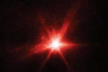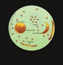 Nelle immagini del disco di V883 Orionis ( gura in alto) ottenute dai radiotelescopi Alma (Atacama Large Millimeter/submillimeter Array) si vede la distribuzione spaziale dell’acqua (in arancione), della polvere (in verde) e del monossido di carbonio (in blu).