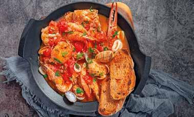 rianti, tutte di alto valore di piacevolezza e di nutrimento. L’originale era a base di molluschi bivalvi, cipolle e aromi, gallette dure e acqua; in seguito, il latte sostituì l’acqua, burro e farina rimpiazzarono le gallette per addensare. Nella zuppa, che si serve bollente in una scodella o dentro un panino ben lievitato, immancabili il bacon e le patate a tocchetti previamente dorati in padella. Tornando a un passo dall’Italia, piatto simbolo della Provenza è l’imperdibile bouillabaisse, zuppa di pesce tipica di Marsiglia. La ricetta storica è stata depositata nel 1980, a tutela dell’autenticità di questo brodetto dagli “umili natali” che nel tempo si è evoluto in un’elegante e ricercata pietanza. Infinite le sue varianti in base ai pesci e ai crostacei utilizzati, indispensabile la presenza di zafferano, finocchio selvatico e scorza d’arancia che donano alla zuppa l’inconfondibile aromaticità. Anche la zarzuela catalana con l’età si è molto imborghesita, arricchendosi di raffinati frutti di mare e altre tipologie ittiche pregiate. Al soffritto realizzato con porri, trito di aglio e pomodori mondati dai semi si unisce il pesce e il brodo dei molluschi spurgati; si profuma con limone, alloro e rosmarino, lasciando cuocere a fuoco lento. Può sfumarsi con un poco di Sherry e Cognac prima di servirsi con fette di pane abbrustolito.