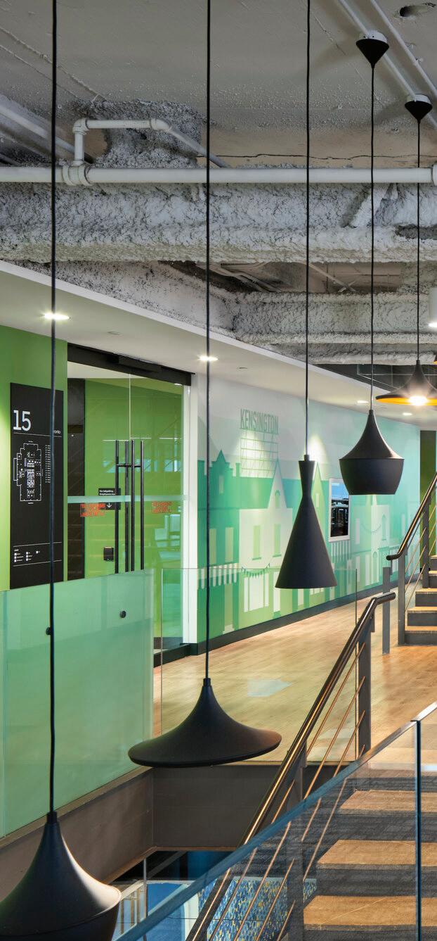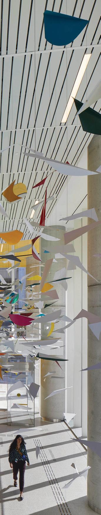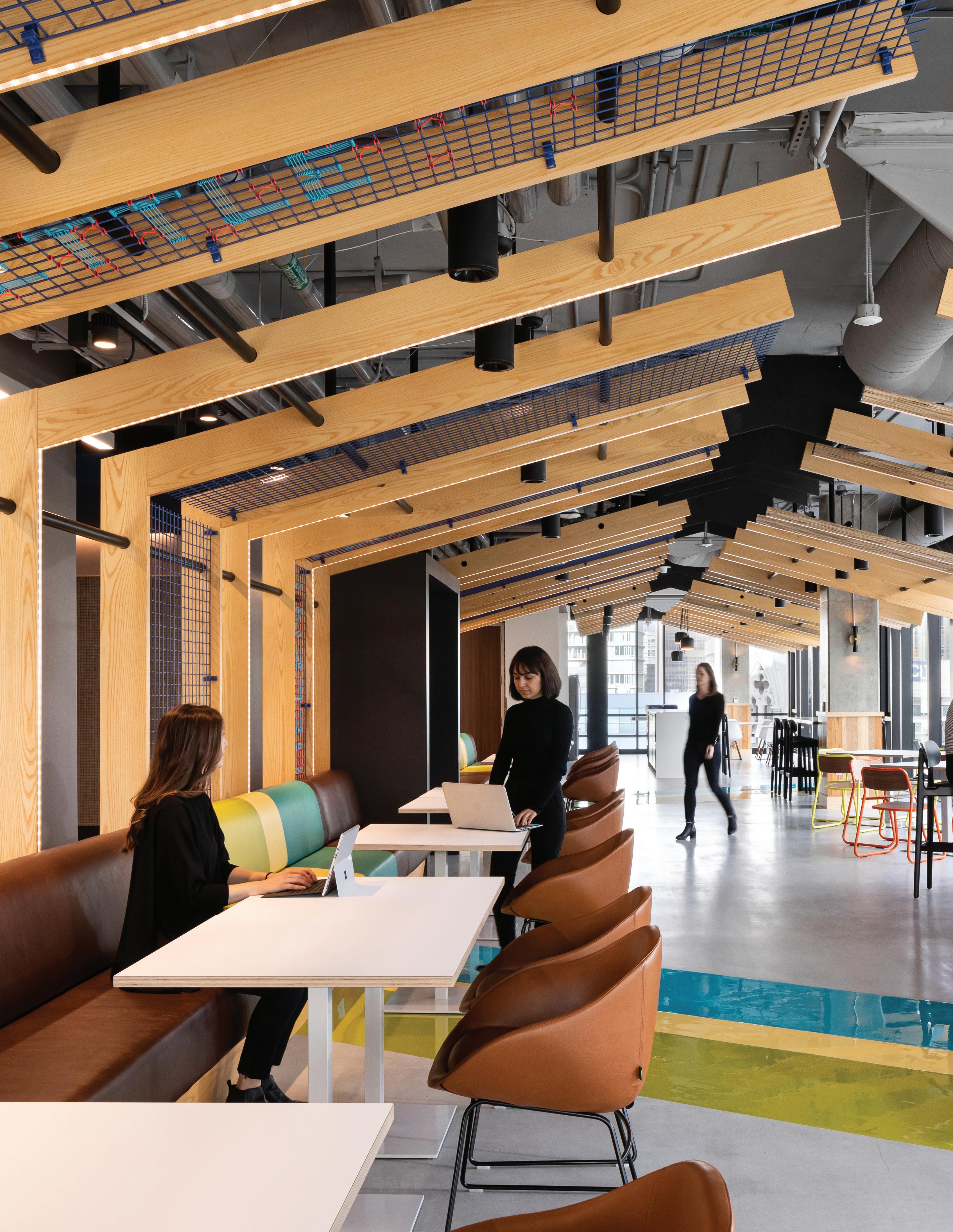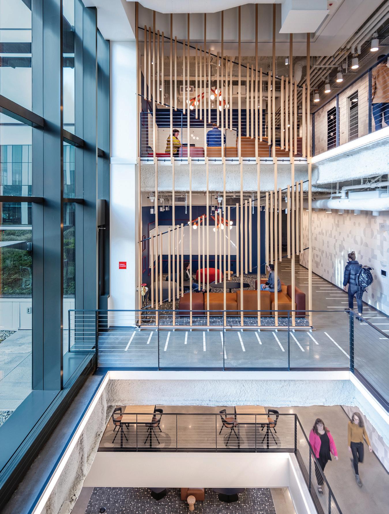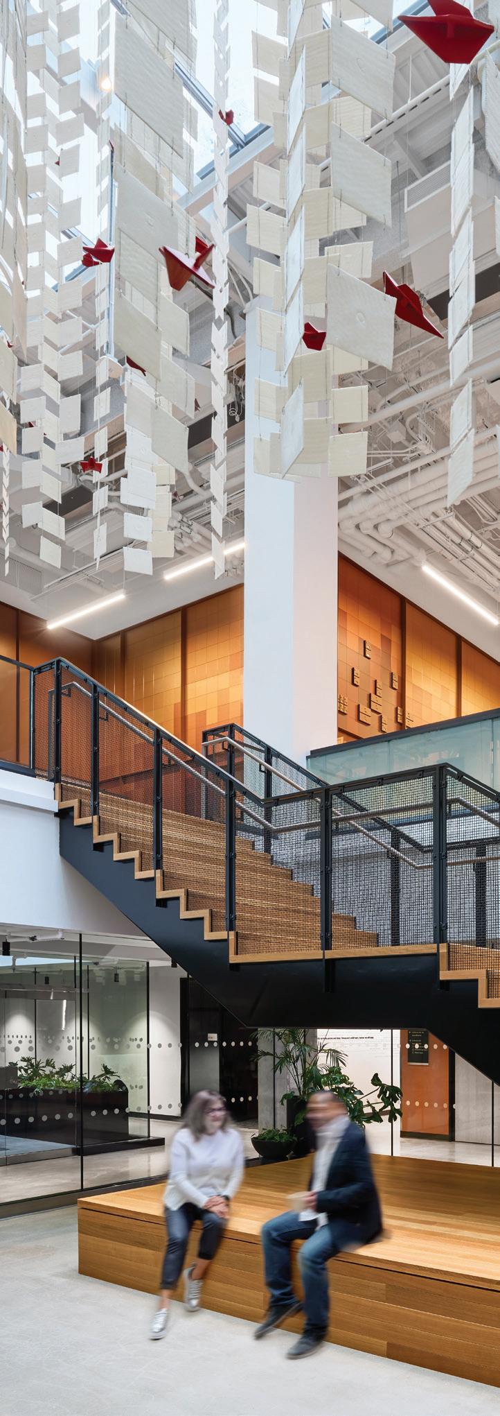 Furthering the vibrancy of the design, B+H also collaborated with local artists Samantha Dickie & Marie Khouri to create hanging sculptures suspended from skylights above the interconnecting stairs leading to the north and south office towers.