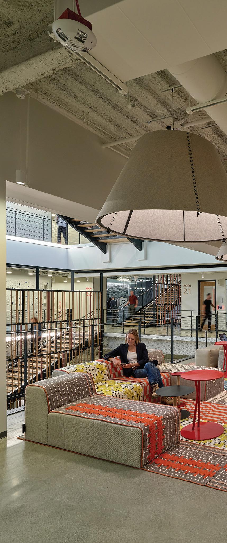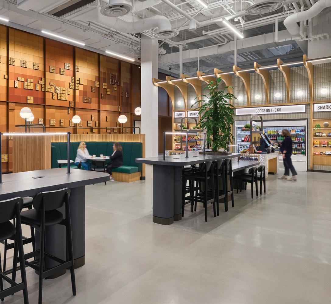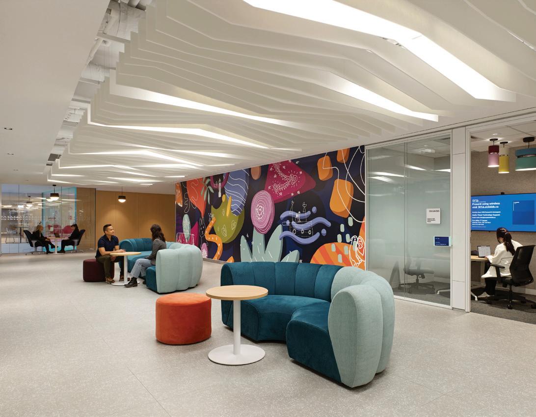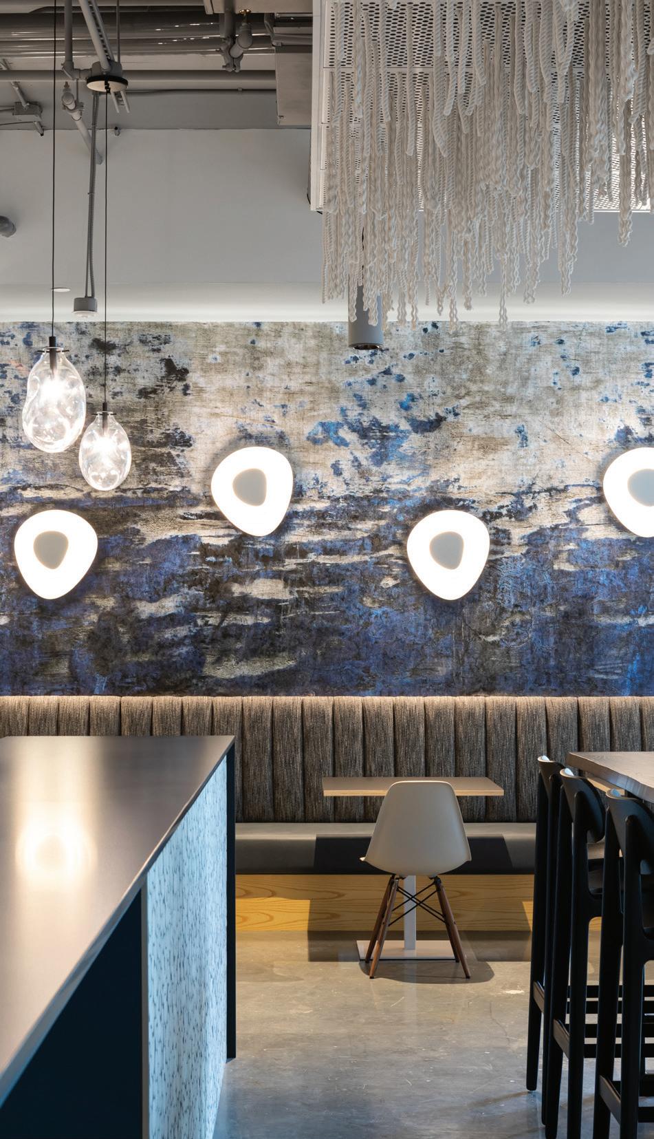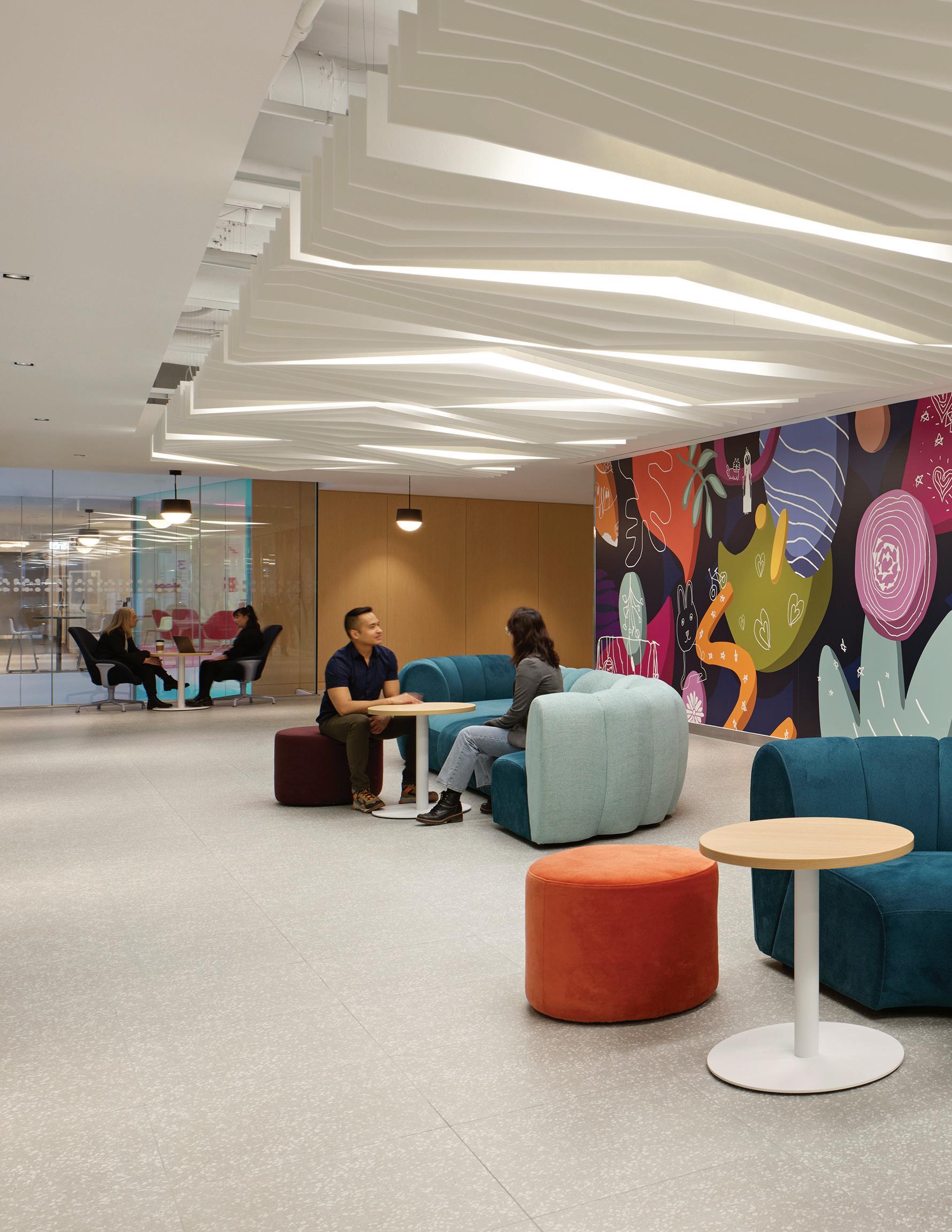 This mural frames the Atrium’s café, snack shop, and main seating area, fostering a vibrant dining, working, collaboration, and socializing hub. The Atrium features various inviting seating areas, accommodating solo work, larger groups, and numerous meeting rooms. Custom light fixtures, fabrics and furniture elicit the feeling of a living room, giving users a sense of belonging and comfort and inviting them to stay awhile.