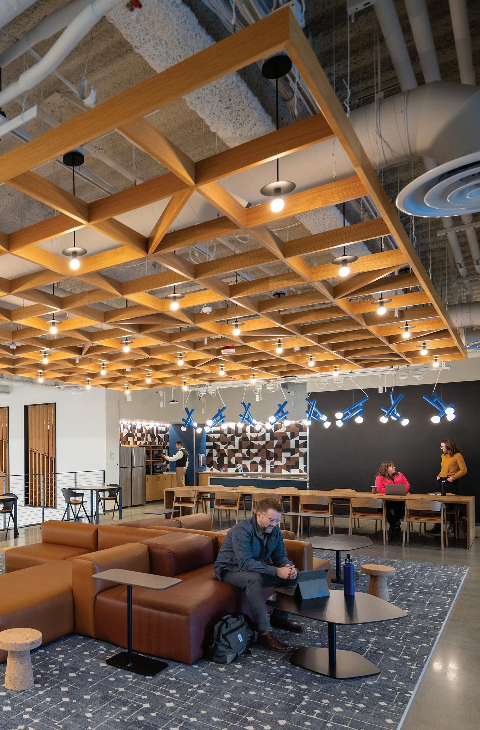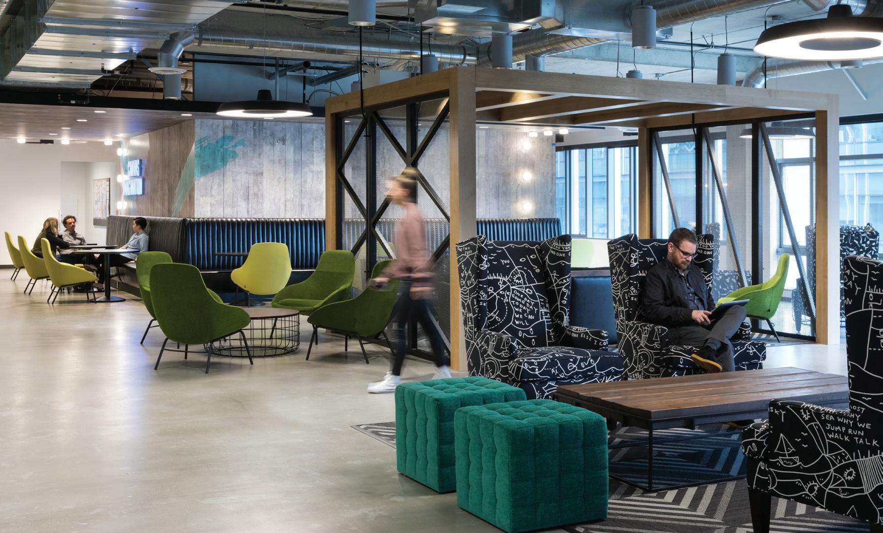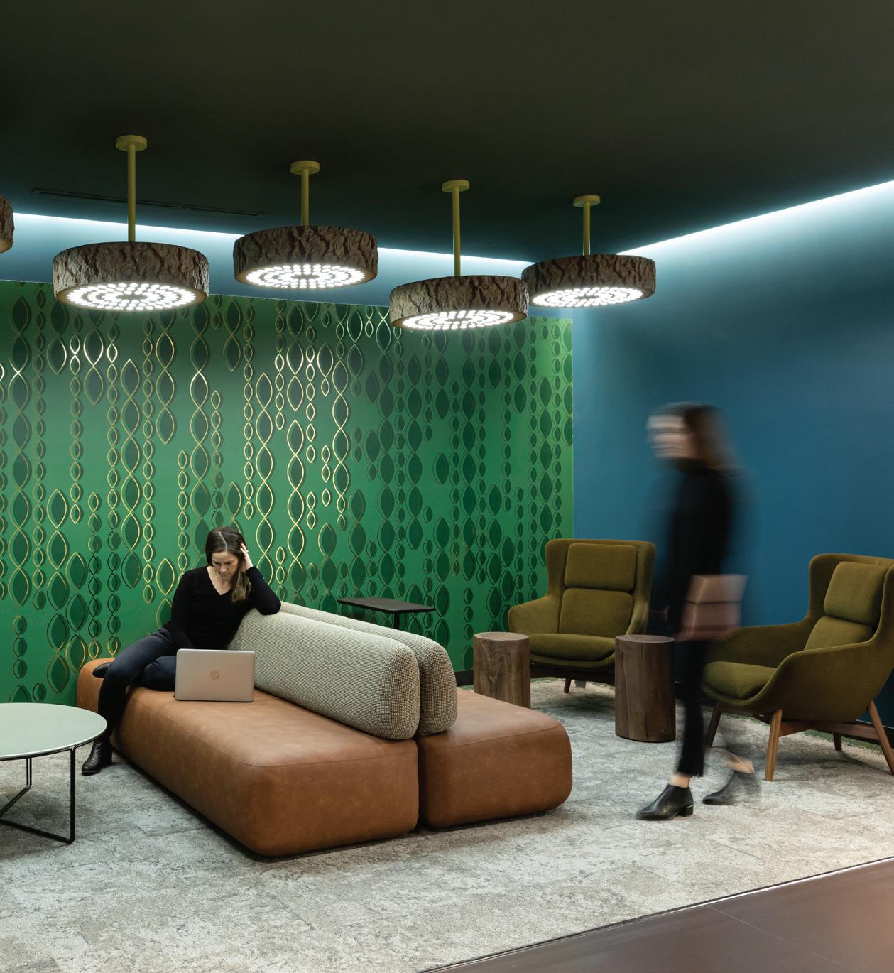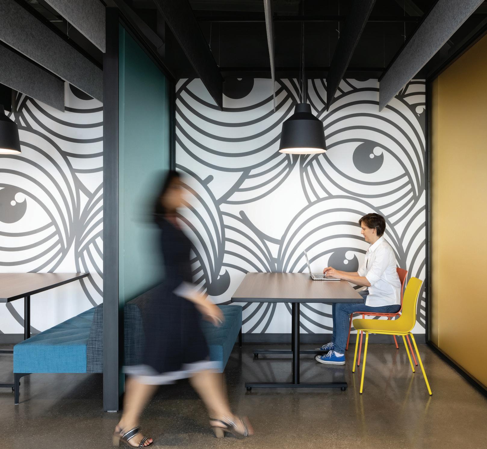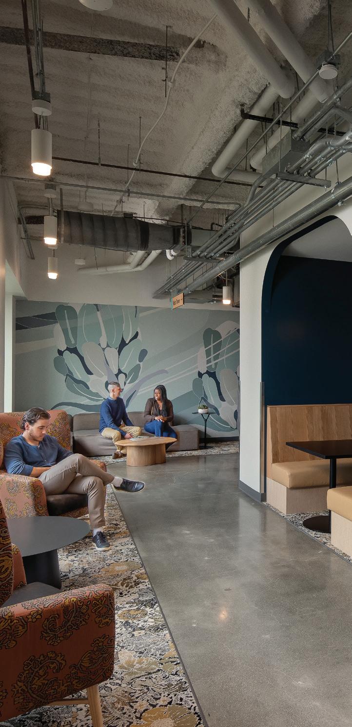 This mural frames the Atrium’s café, snack shop, and main seating area, fostering a vibrant dining, working, collaboration, and socializing hub. The Atrium features various inviting seating areas, accommodating solo work, larger groups, and numerous meeting rooms. Custom light fixtures, fabrics and furniture elicit the feeling of a living room, giving users a sense of belonging and comfort and inviting them to stay awhile.