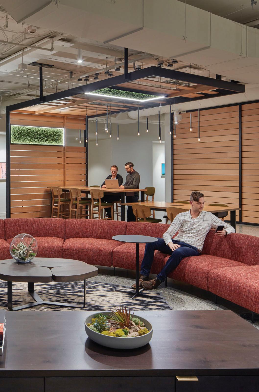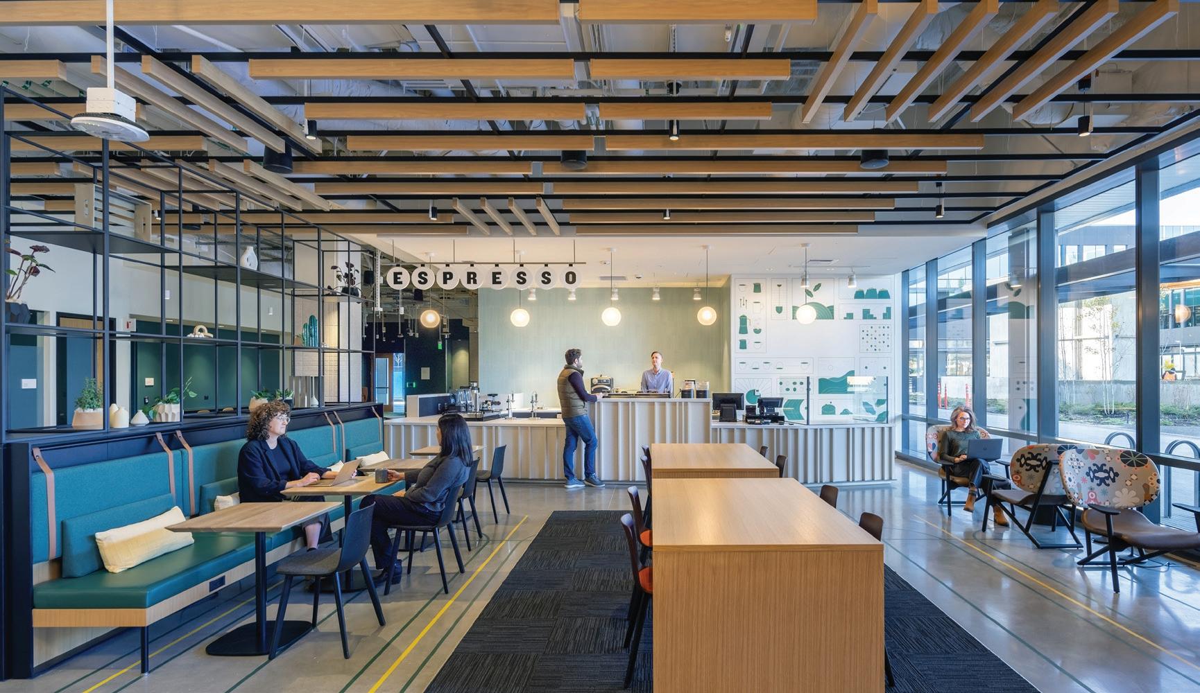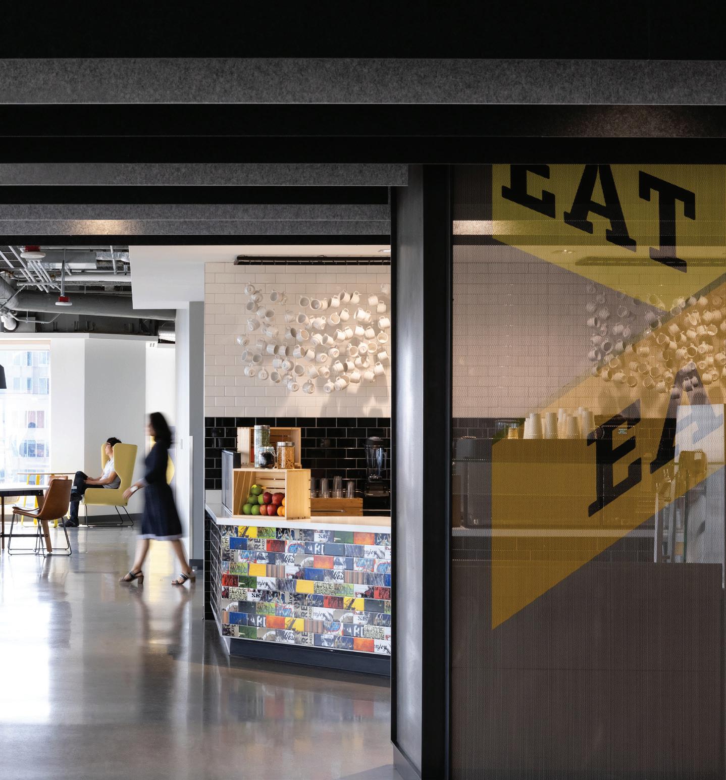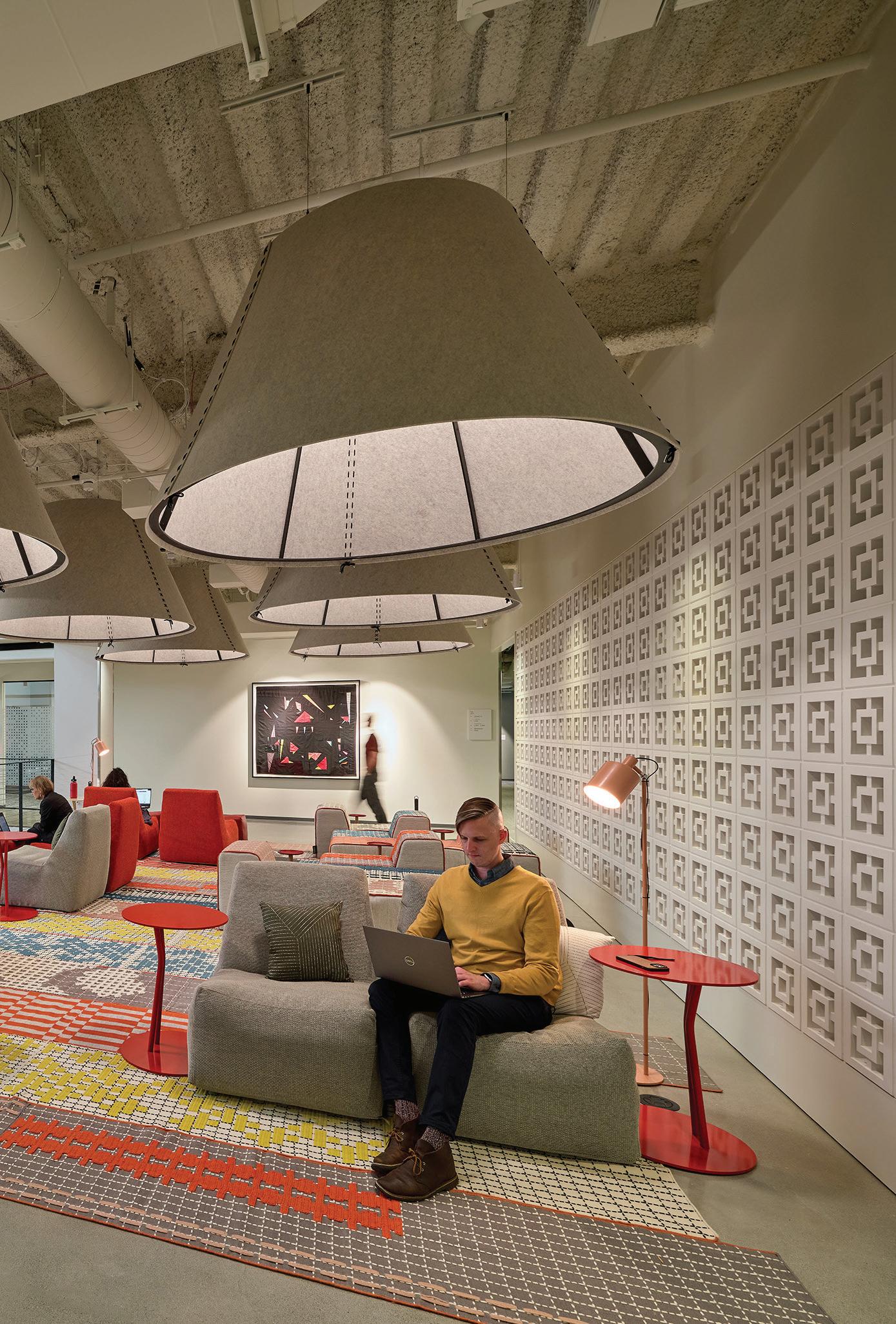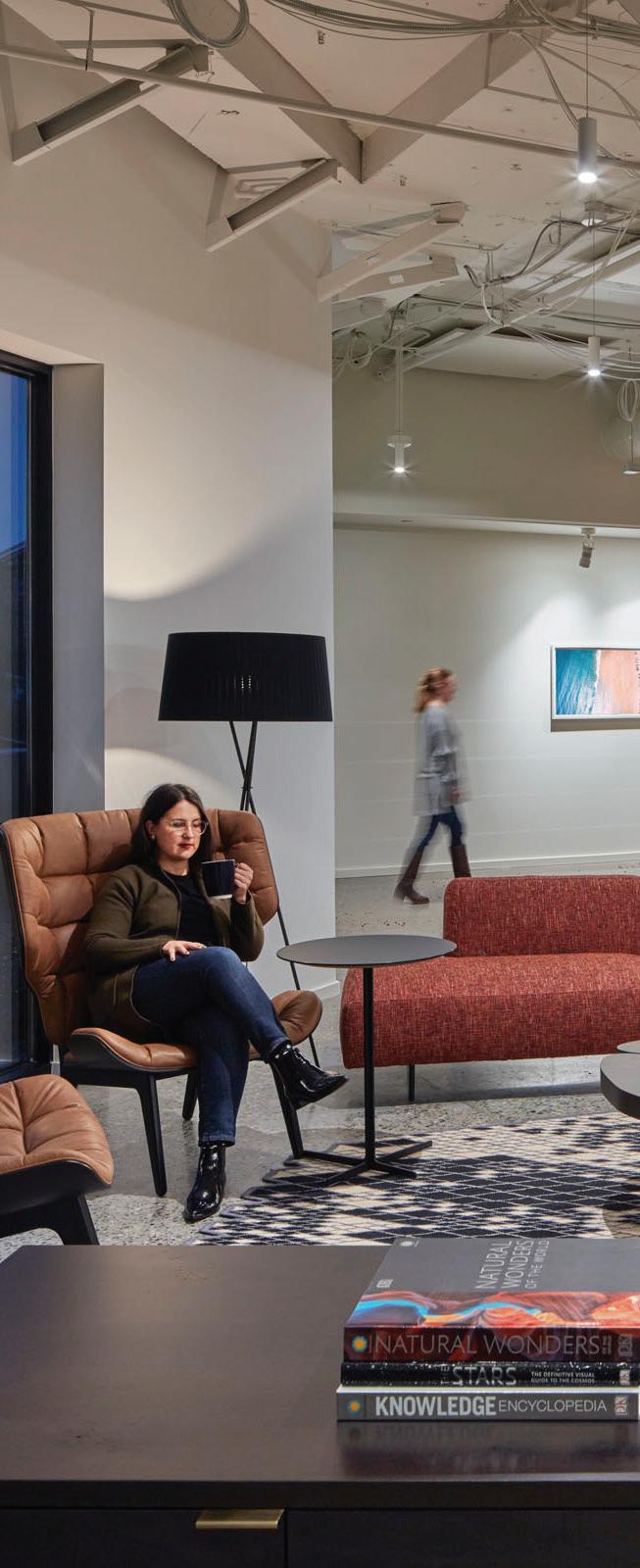 This mural frames the Atrium’s café, snack shop, and main seating area, fostering a vibrant dining, working, collaboration, and socializing hub. The Atrium features various inviting seating areas, accommodating solo work, larger groups, and numerous meeting rooms. Custom light fixtures, fabrics and furniture elicit the feeling of a living room, giving users a sense of belonging and comfort and inviting them to stay awhile.