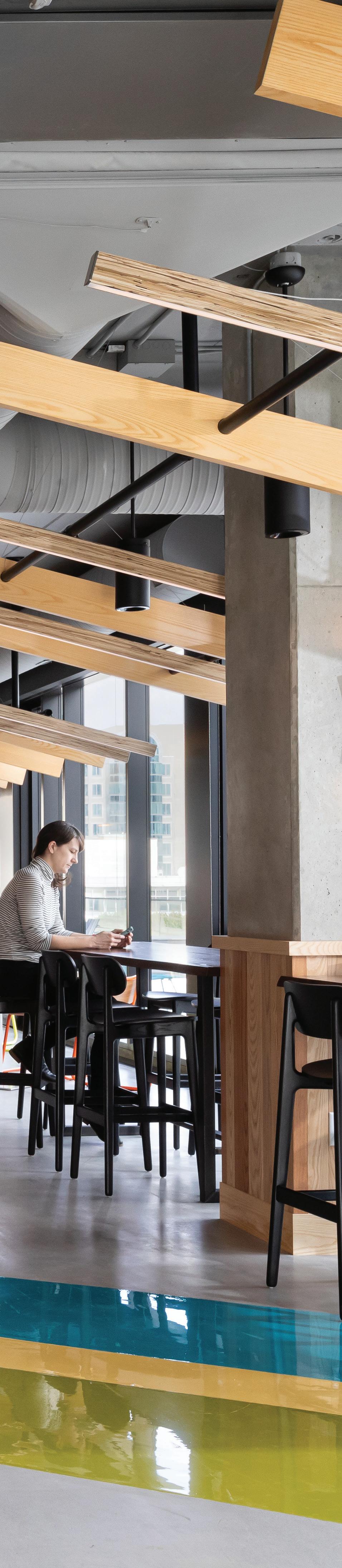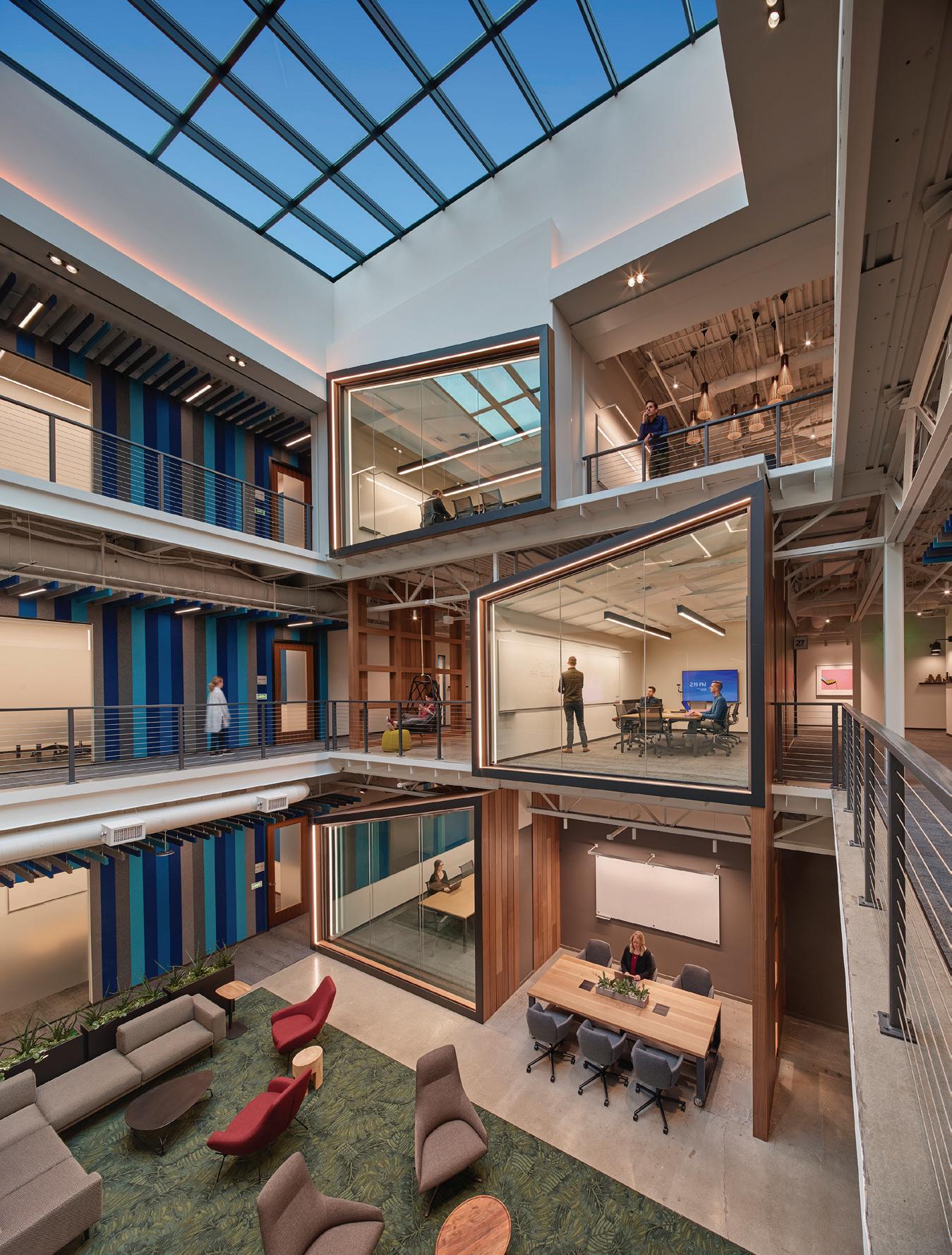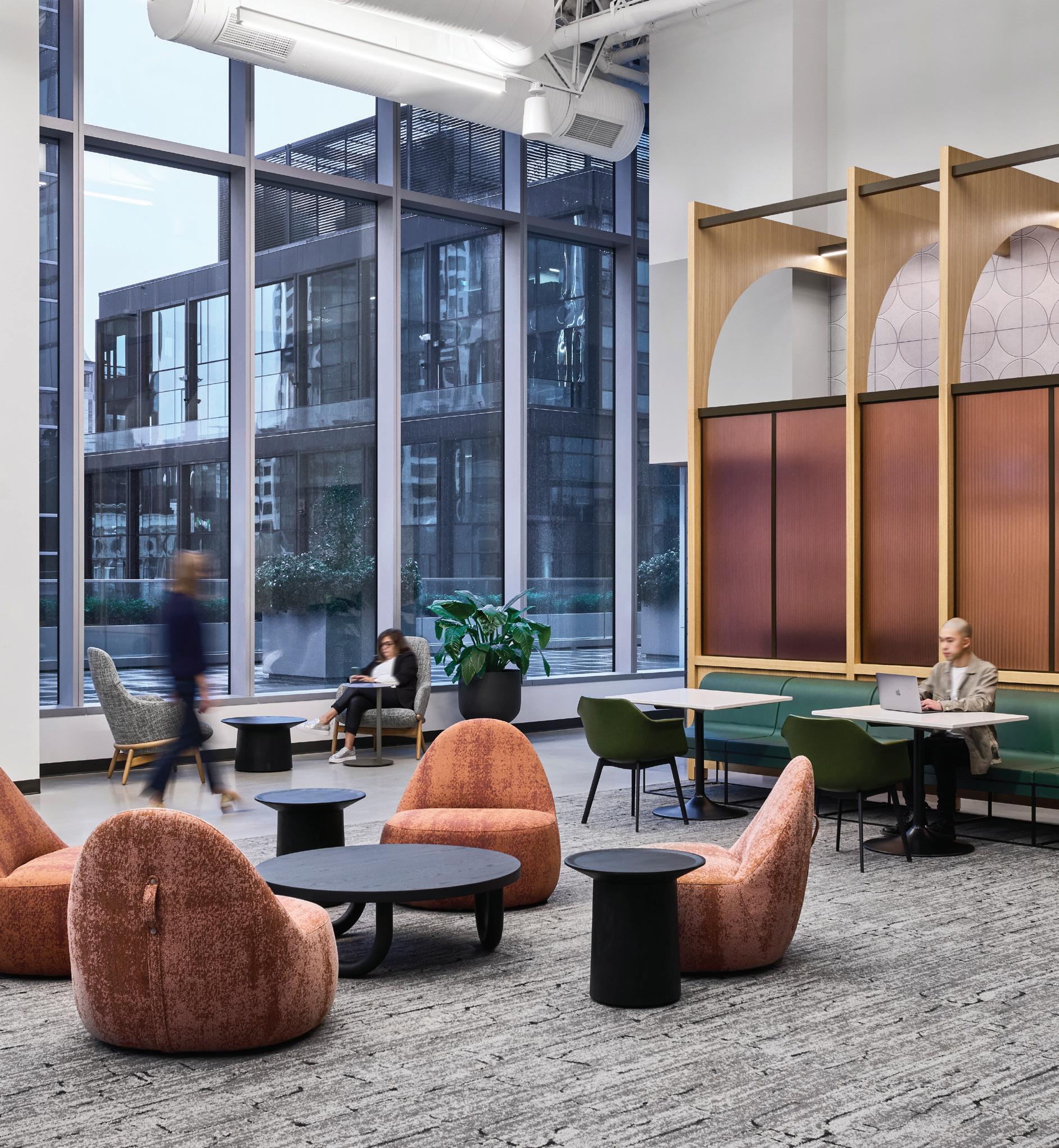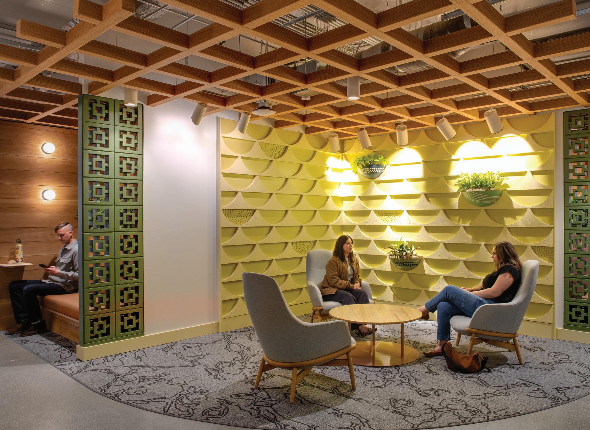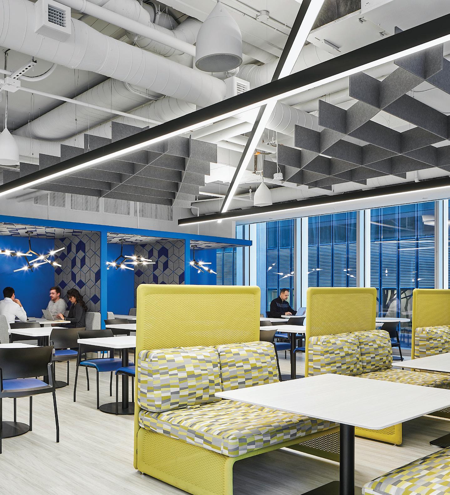 This mural frames the Atrium’s café, snack shop, and main seating area, fostering a vibrant dining, working, collaboration, and socializing hub. The Atrium features various inviting seating areas, accommodating solo work, larger groups, and numerous meeting rooms. Custom light fixtures, fabrics and furniture elicit the feeling of a living room, giving users a sense of belonging and comfort and inviting them to stay awhile.