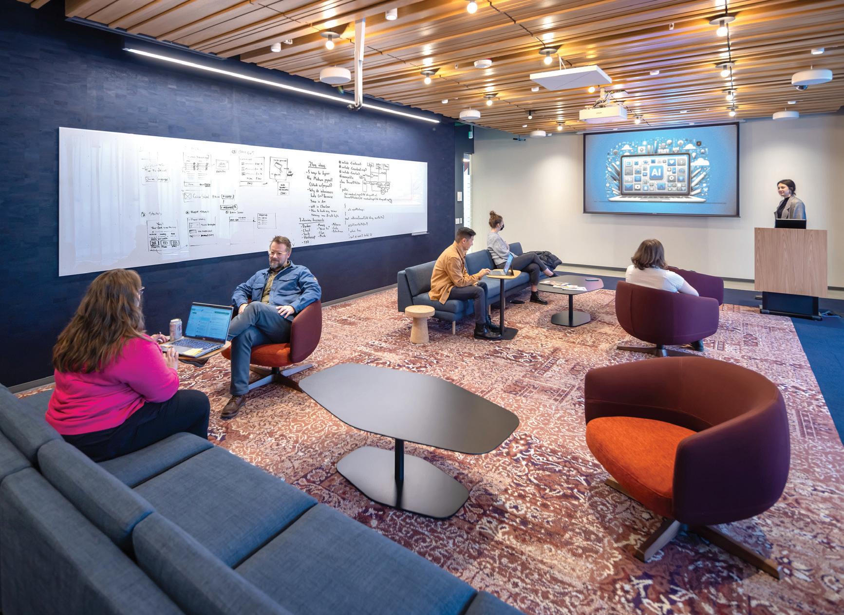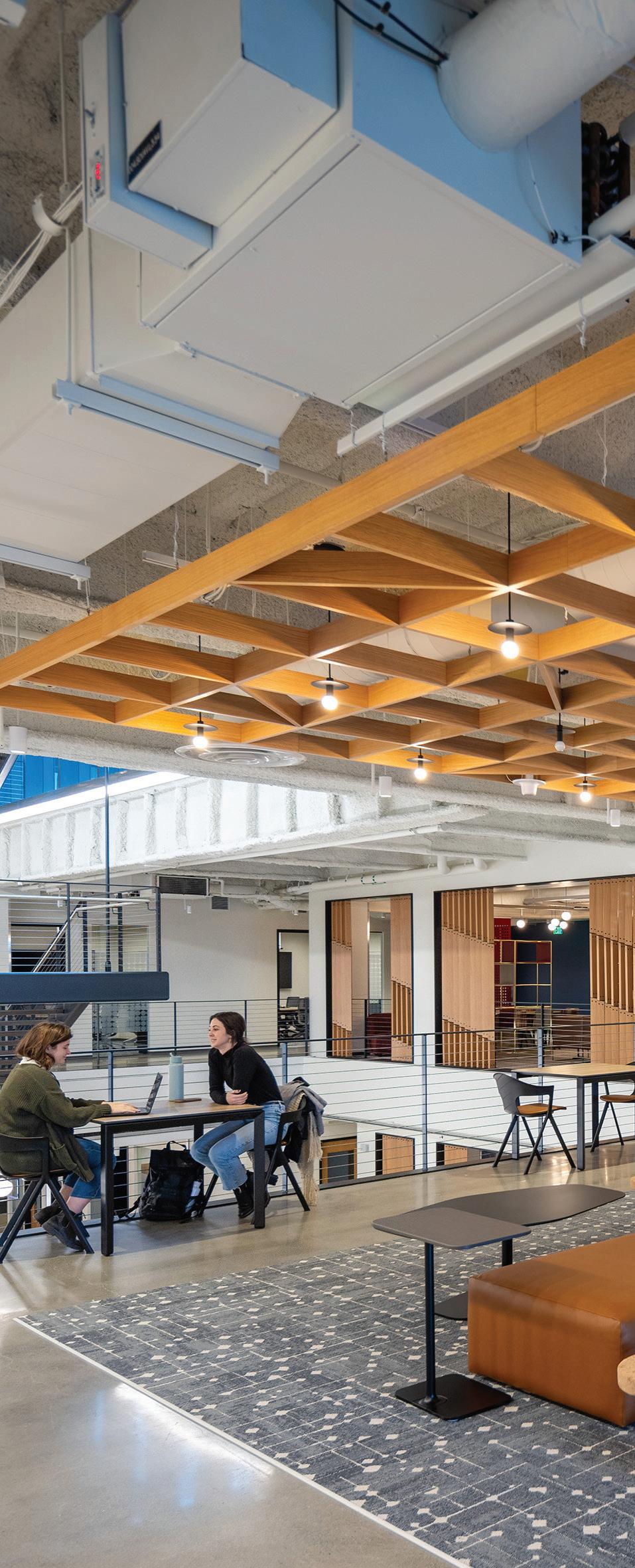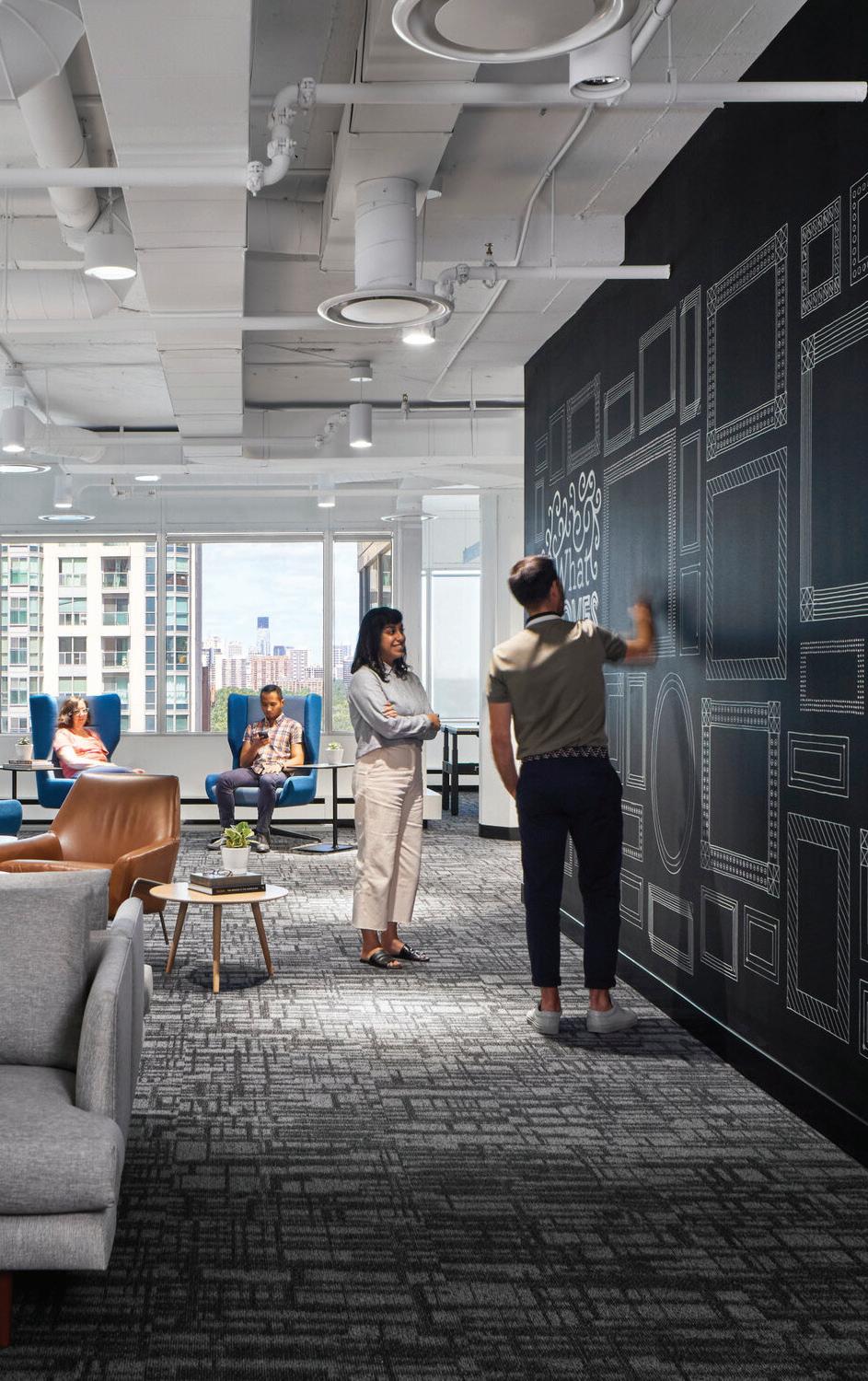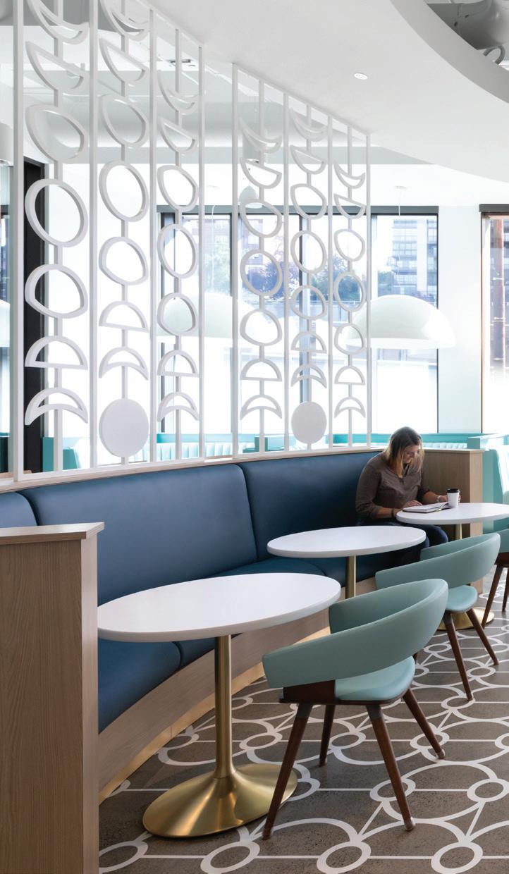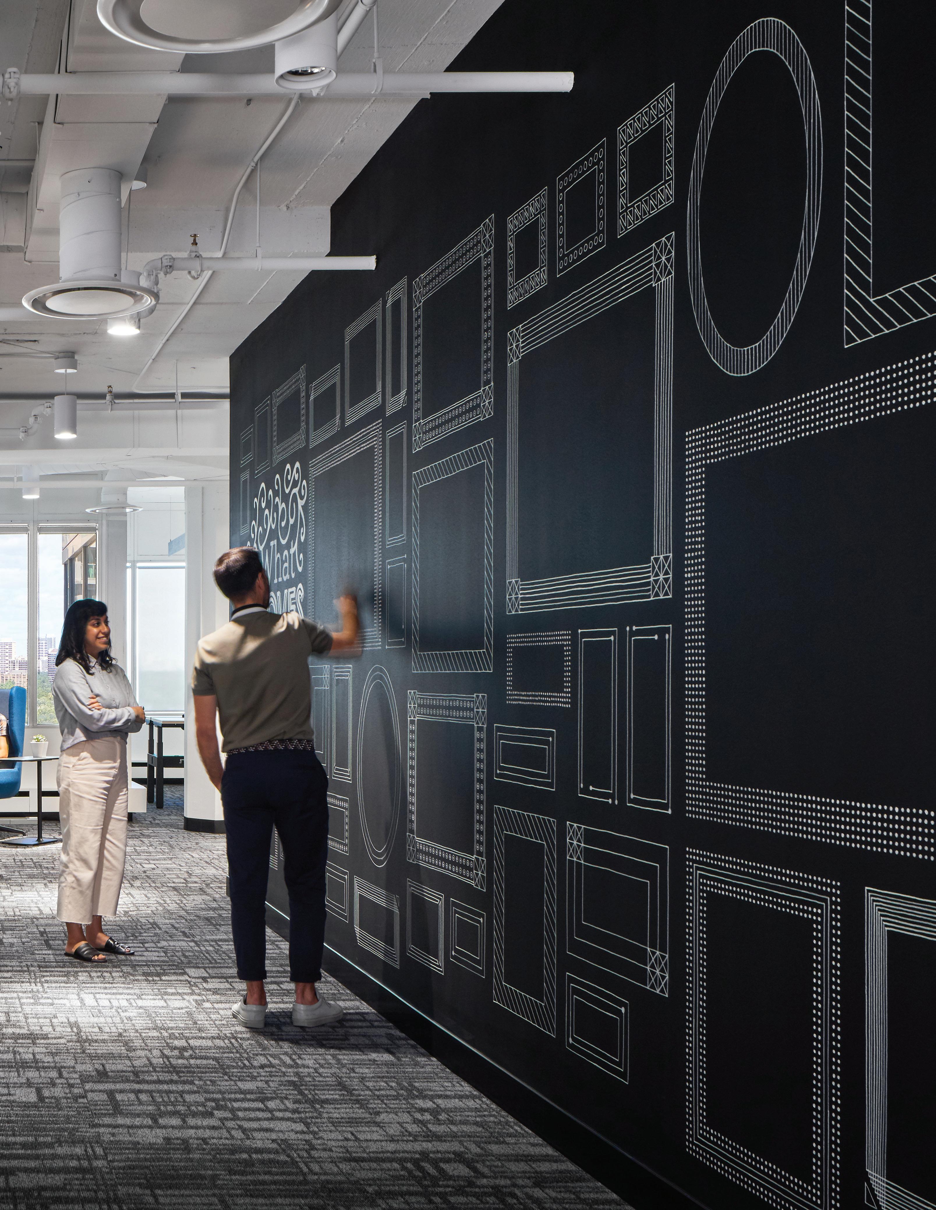 This mural frames the Atrium’s café, snack shop, and main seating area, fostering a vibrant dining, working, collaboration, and socializing hub. The Atrium features various inviting seating areas, accommodating solo work, larger groups, and numerous meeting rooms. Custom light fixtures, fabrics and furniture elicit the feeling of a living room, giving users a sense of belonging and comfort and inviting them to stay awhile.