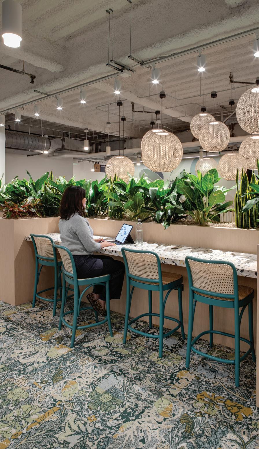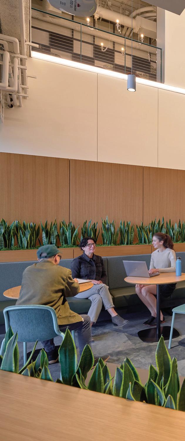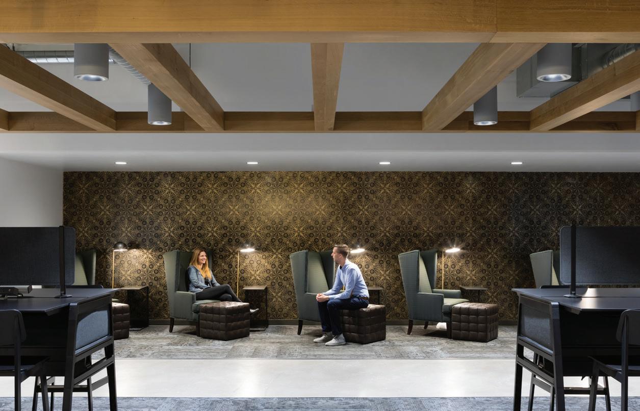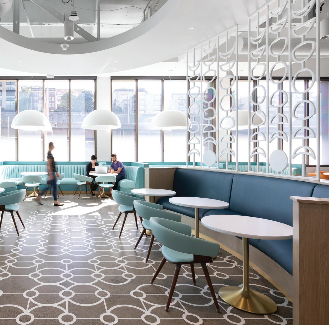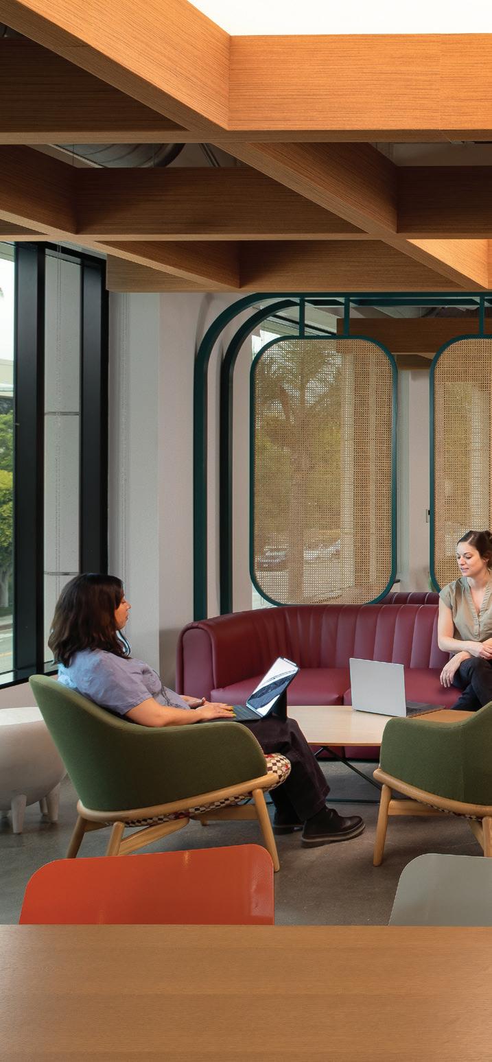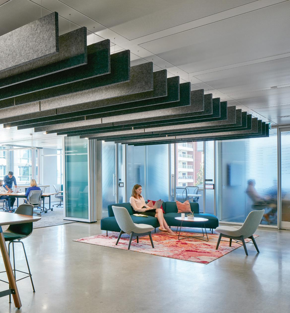 This mural frames the Atrium’s café, snack shop, and main seating area, fostering a vibrant dining, working, collaboration, and socializing hub. The Atrium features various inviting seating areas, accommodating solo work, larger groups, and numerous meeting rooms. Custom light fixtures, fabrics and furniture elicit the feeling of a living room, giving users a sense of belonging and comfort and inviting them to stay awhile.