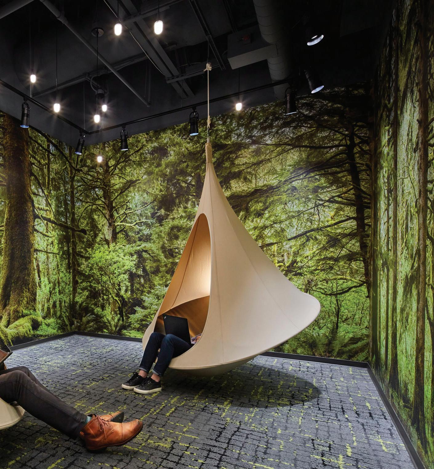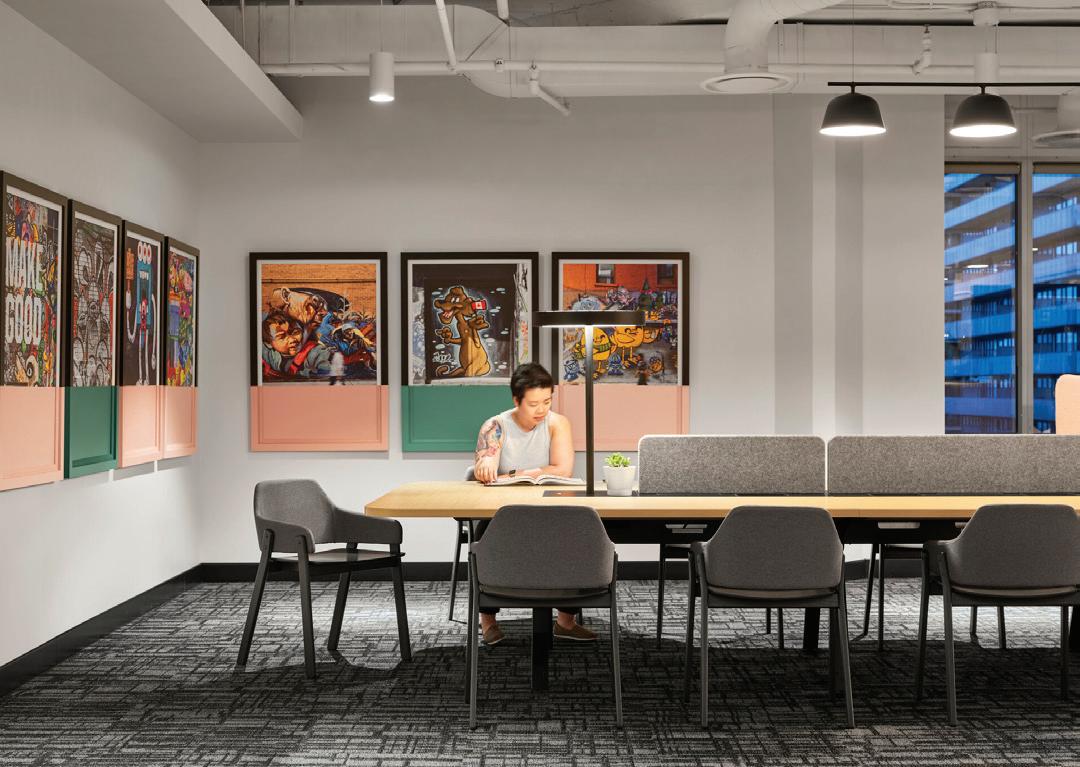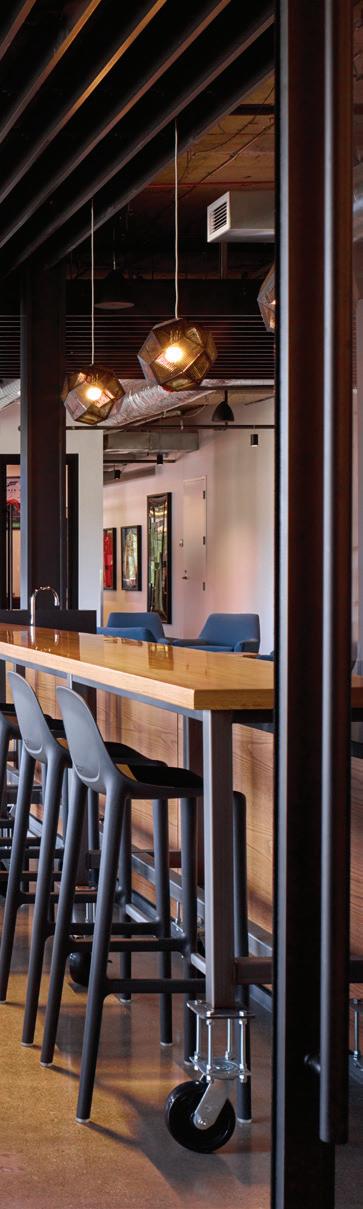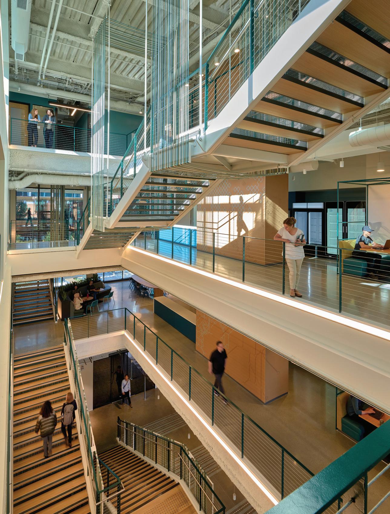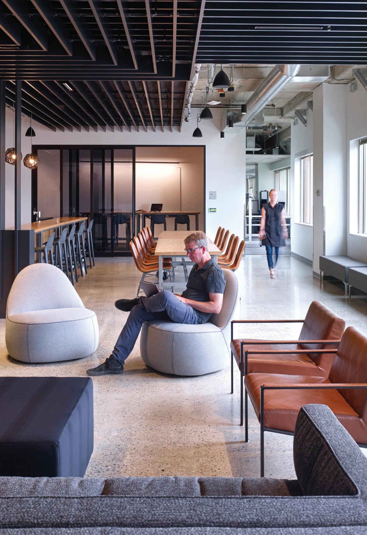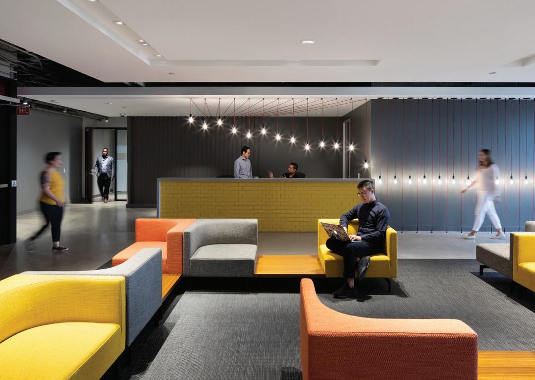 This mural frames the Atrium’s café, snack shop, and main seating area, fostering a vibrant dining, working, collaboration, and socializing hub. The Atrium features various inviting seating areas, accommodating solo work, larger groups, and numerous meeting rooms. Custom light fixtures, fabrics and furniture elicit the feeling of a living room, giving users a sense of belonging and comfort and inviting them to stay awhile.
