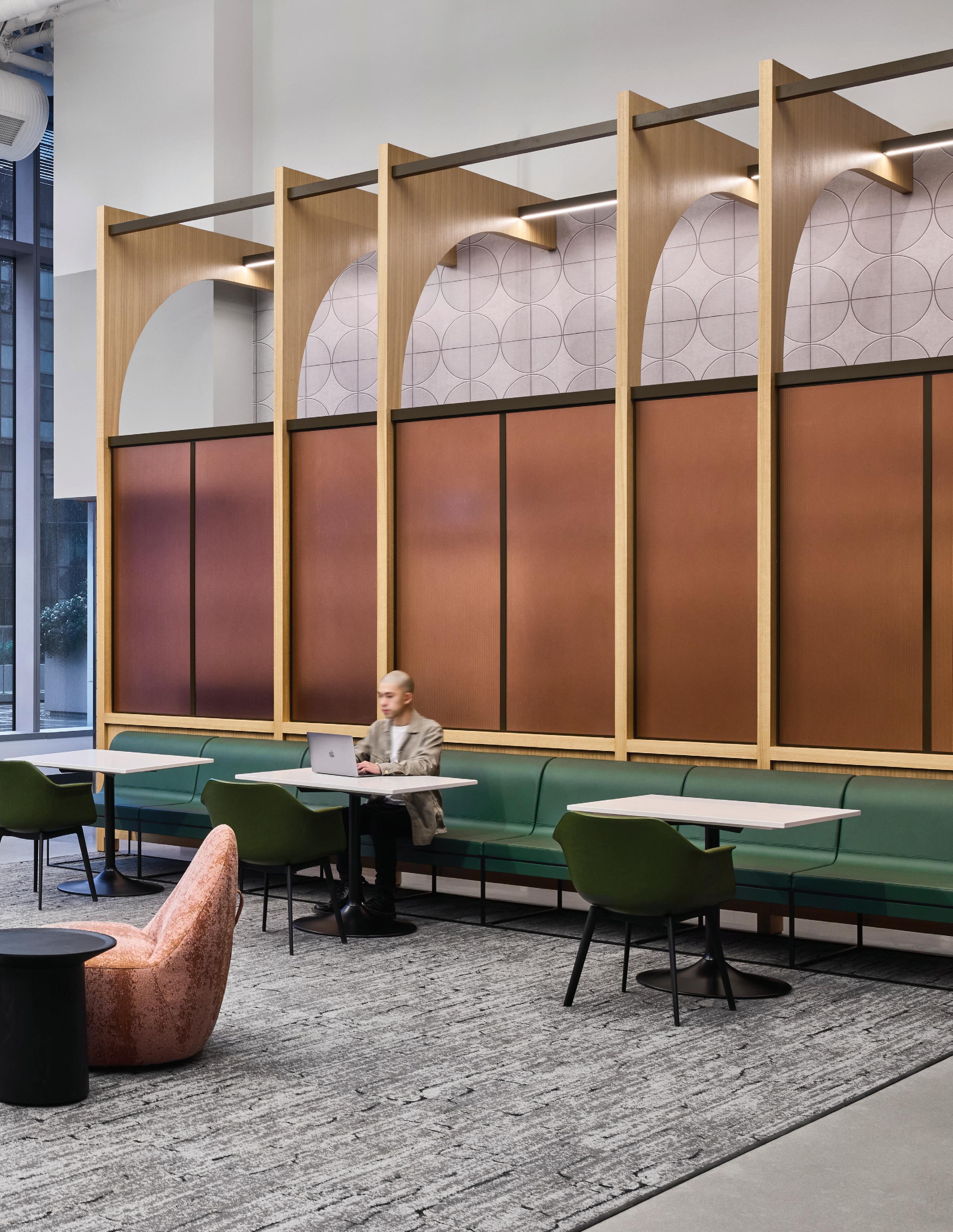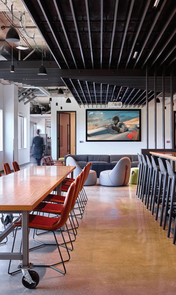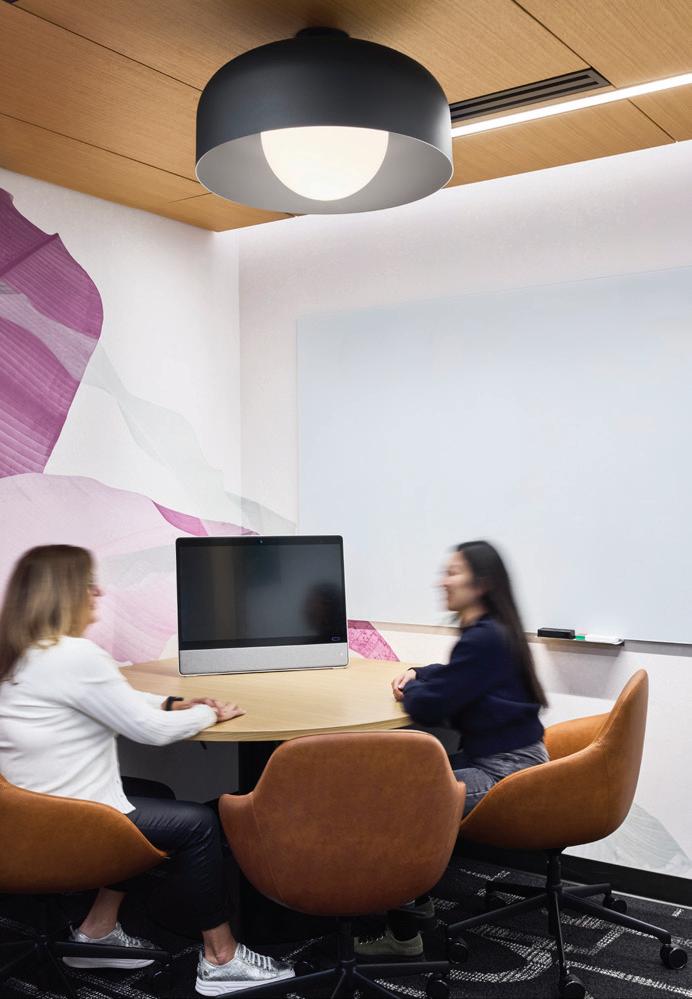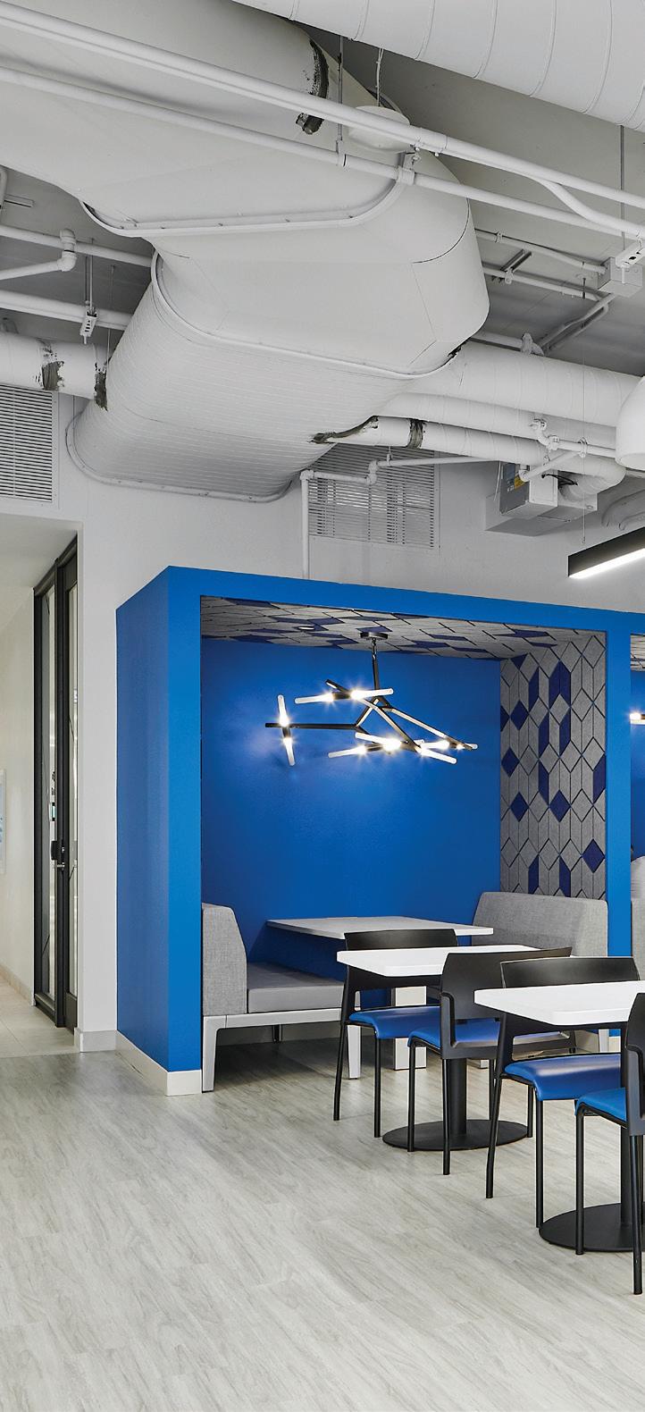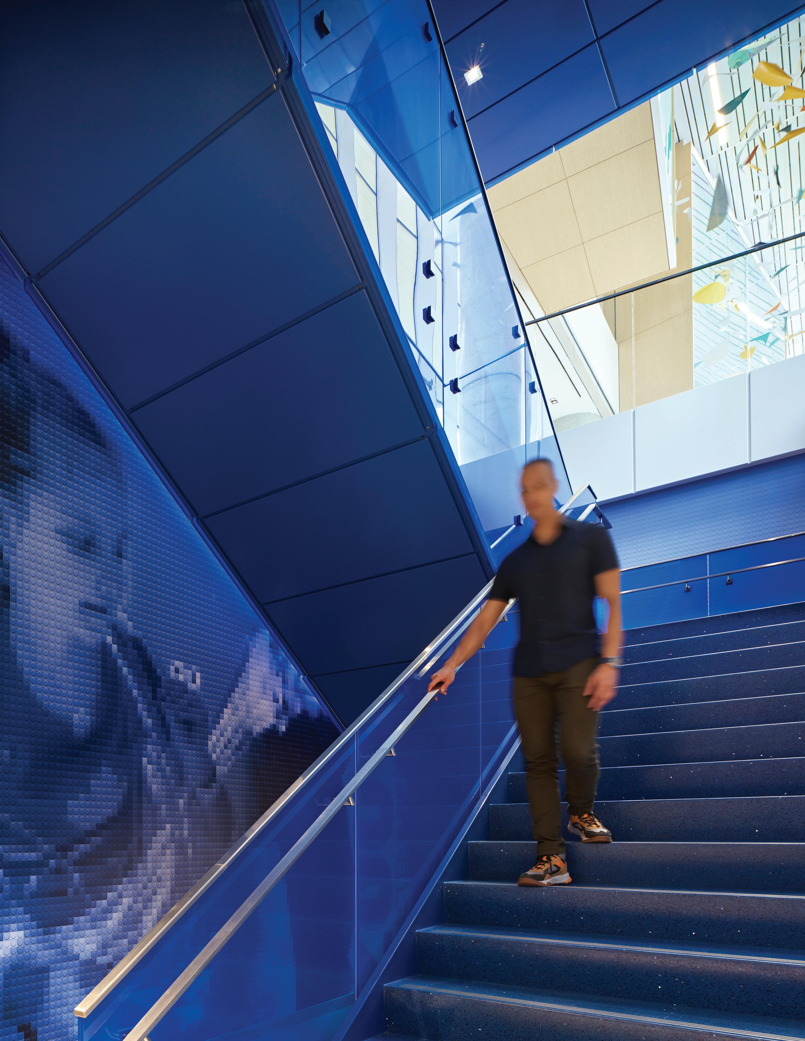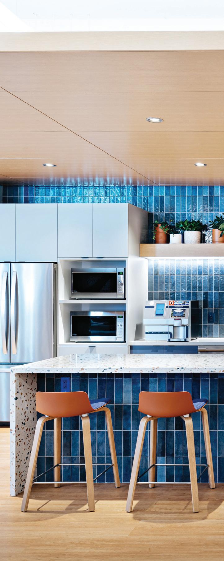 This mural frames the Atrium’s café, snack shop, and main seating area, fostering a vibrant dining, working, collaboration, and socializing hub. The Atrium features various inviting seating areas, accommodating solo work, larger groups, and numerous meeting rooms. Custom light fixtures, fabrics and furniture elicit the feeling of a living room, giving users a sense of belonging and comfort and inviting them to stay awhile.