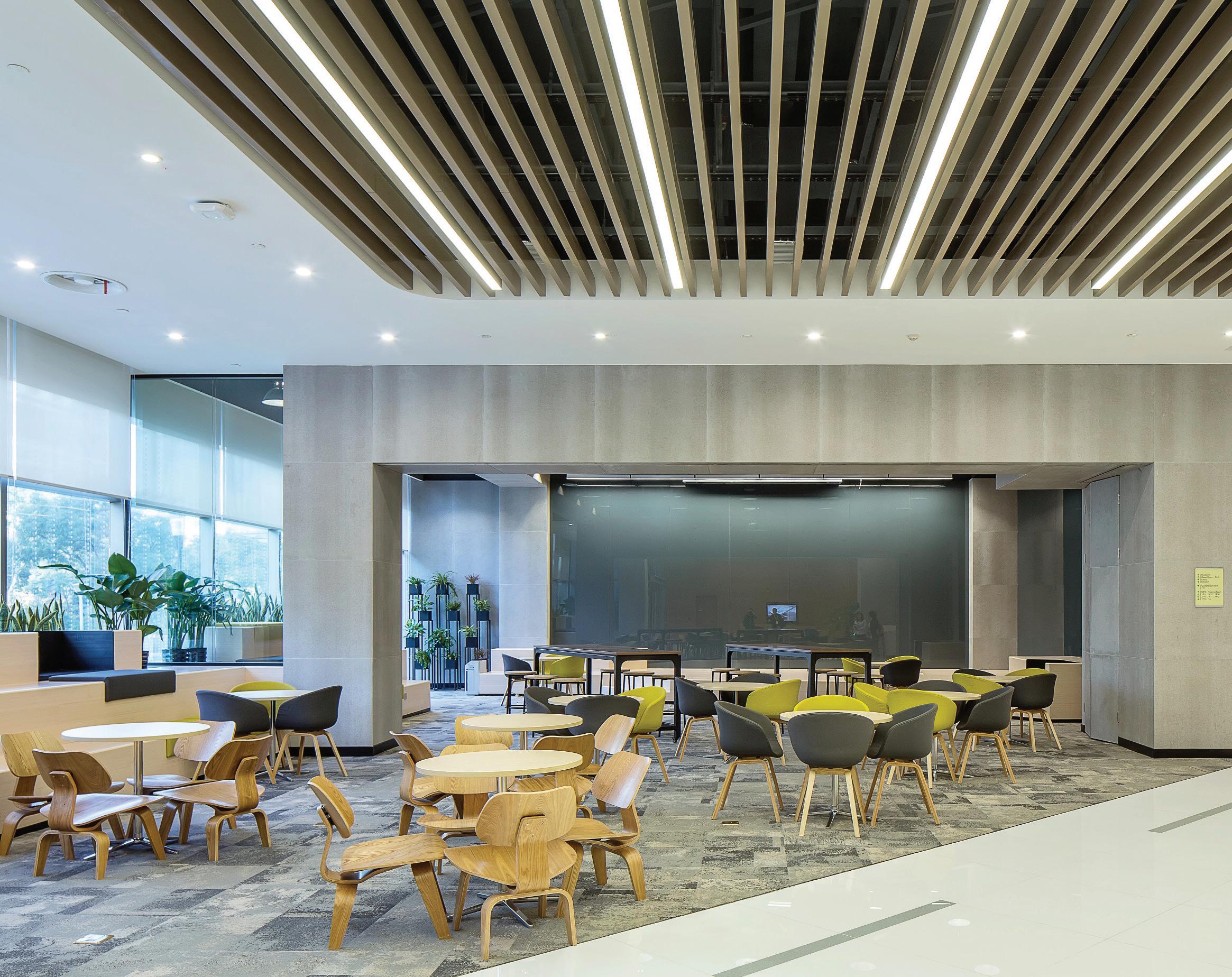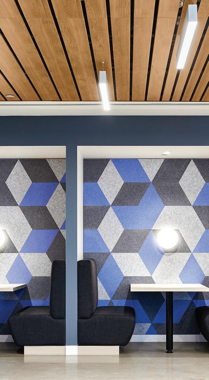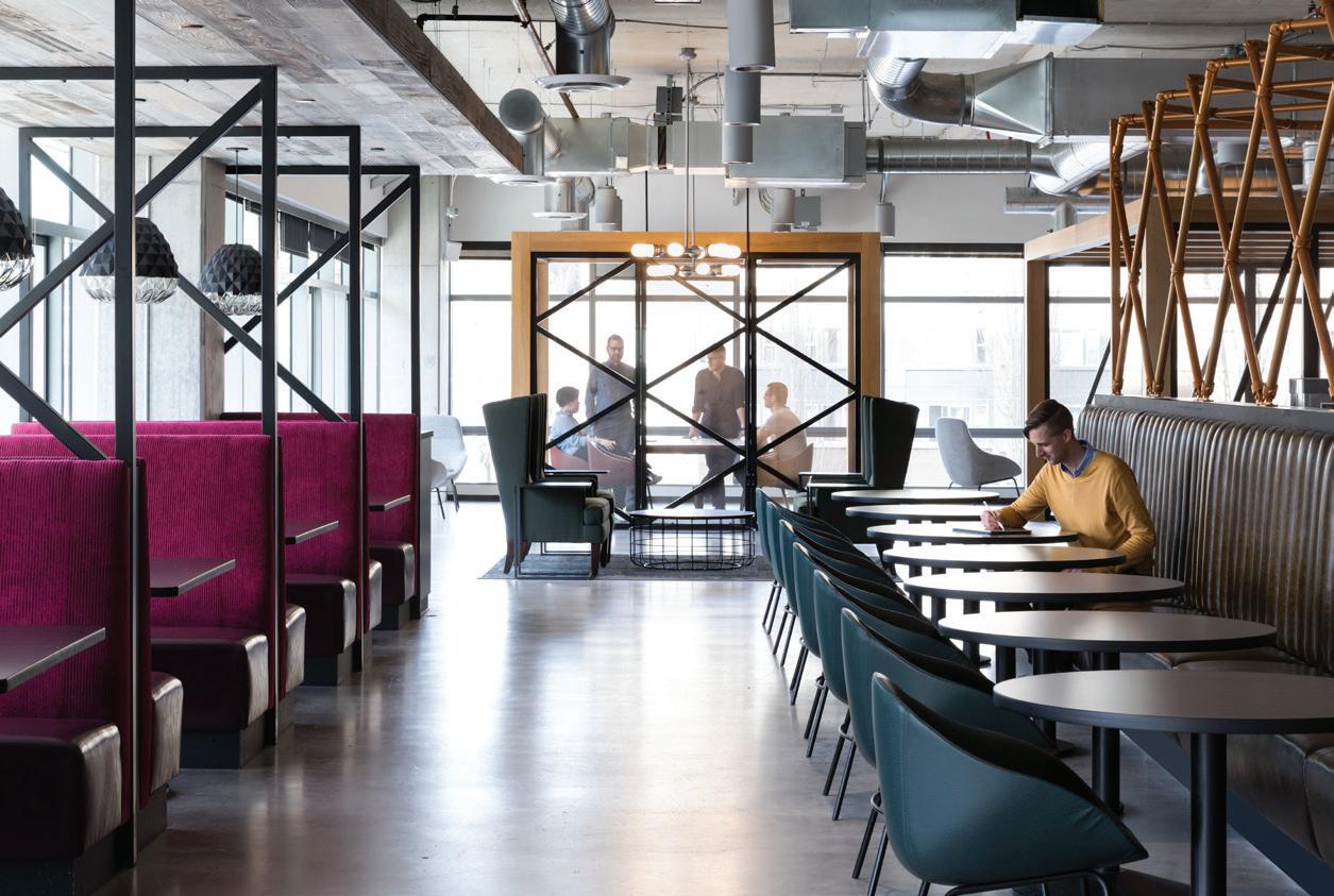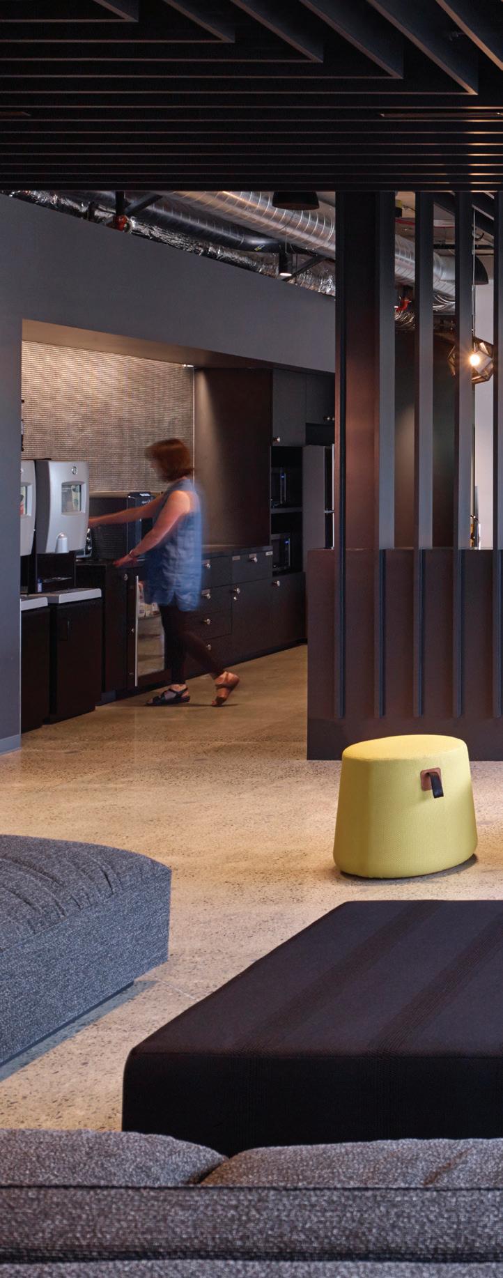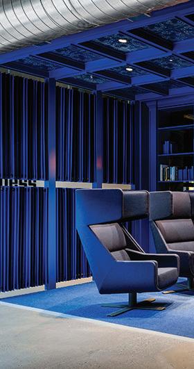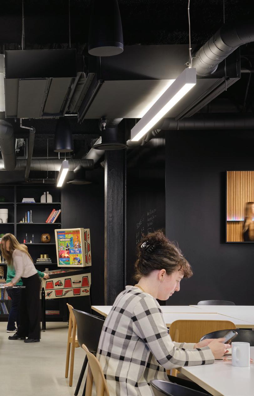This mural frames the Atrium’s café, snack shop, and main seating area, fostering a vibrant dining, working, collaboration, and socializing hub. The Atrium features various inviting seating areas, accommodating solo work, larger groups, and numerous meeting rooms. Custom light fixtures, fabrics and furniture elicit the feeling of a living room, giving users a sense of belonging and comfort and inviting them to stay awhile.