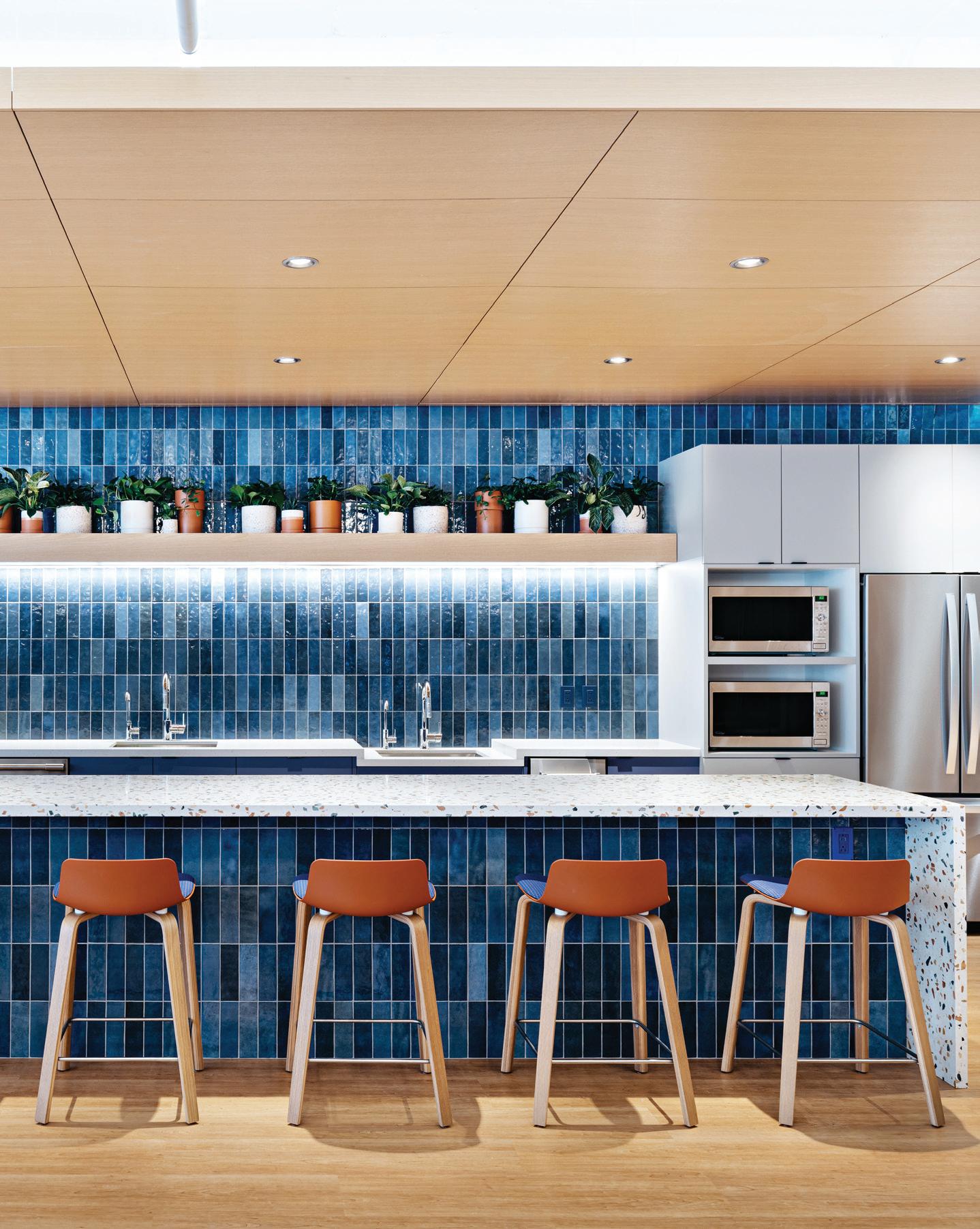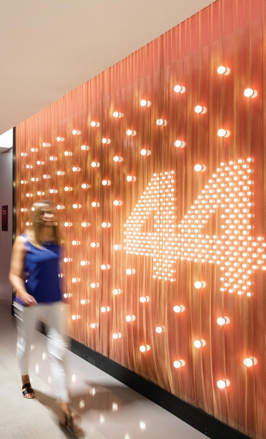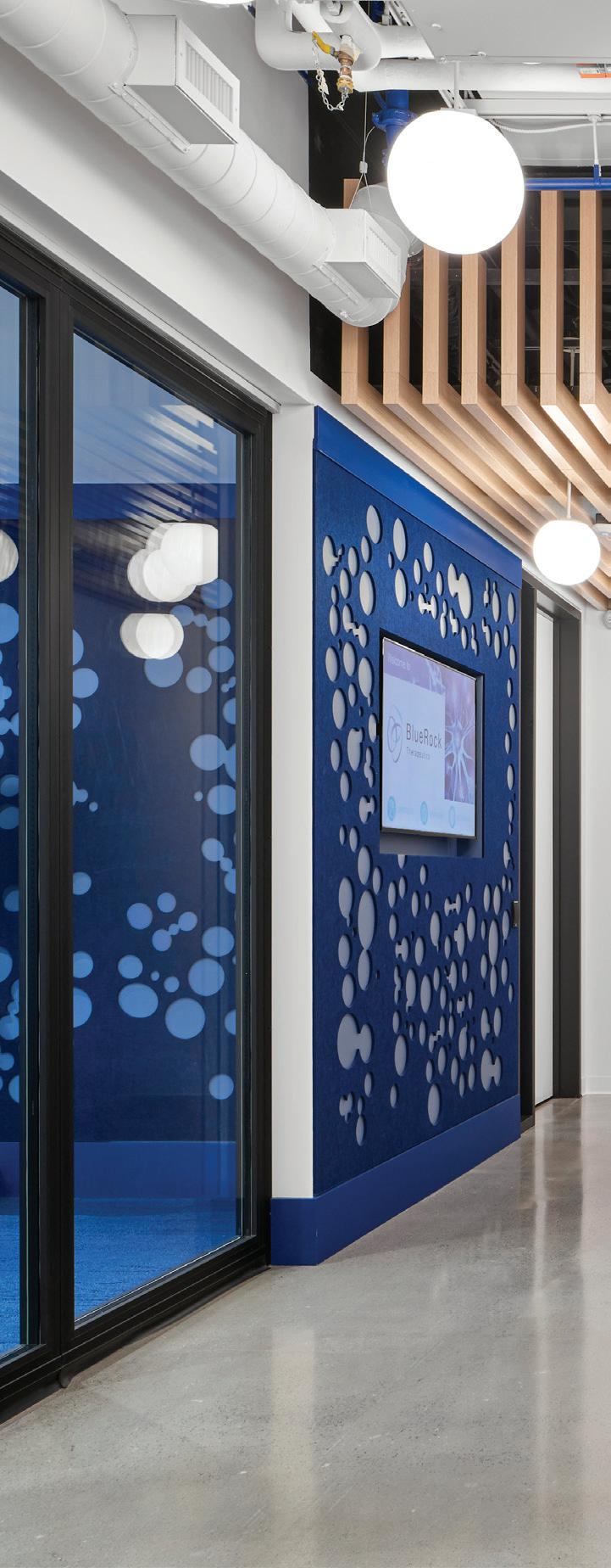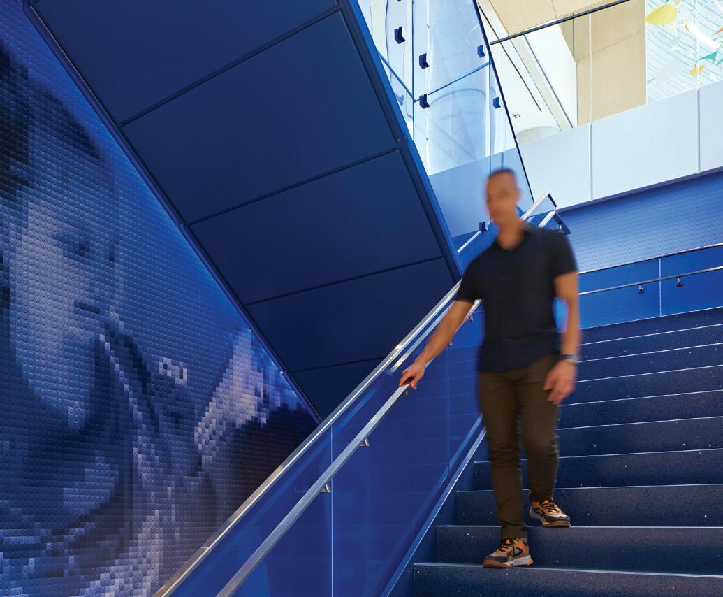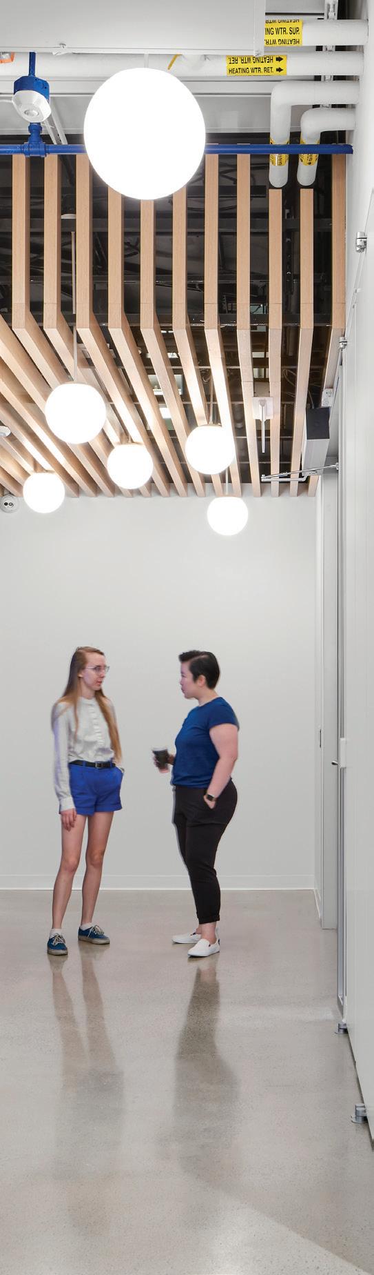This mural frames the Atrium’s café, snack shop, and main seating area, fostering a vibrant dining, working, collaboration, and socializing hub. The Atrium features various inviting seating areas, accommodating solo work, larger groups, and numerous meeting rooms. Custom light fixtures, fabrics and furniture elicit the feeling of a living room, giving users a sense of belonging and comfort and inviting them to stay awhile.