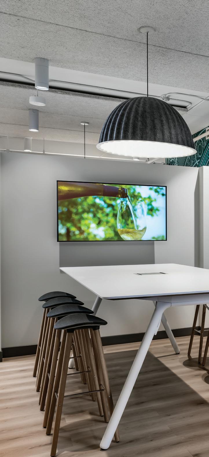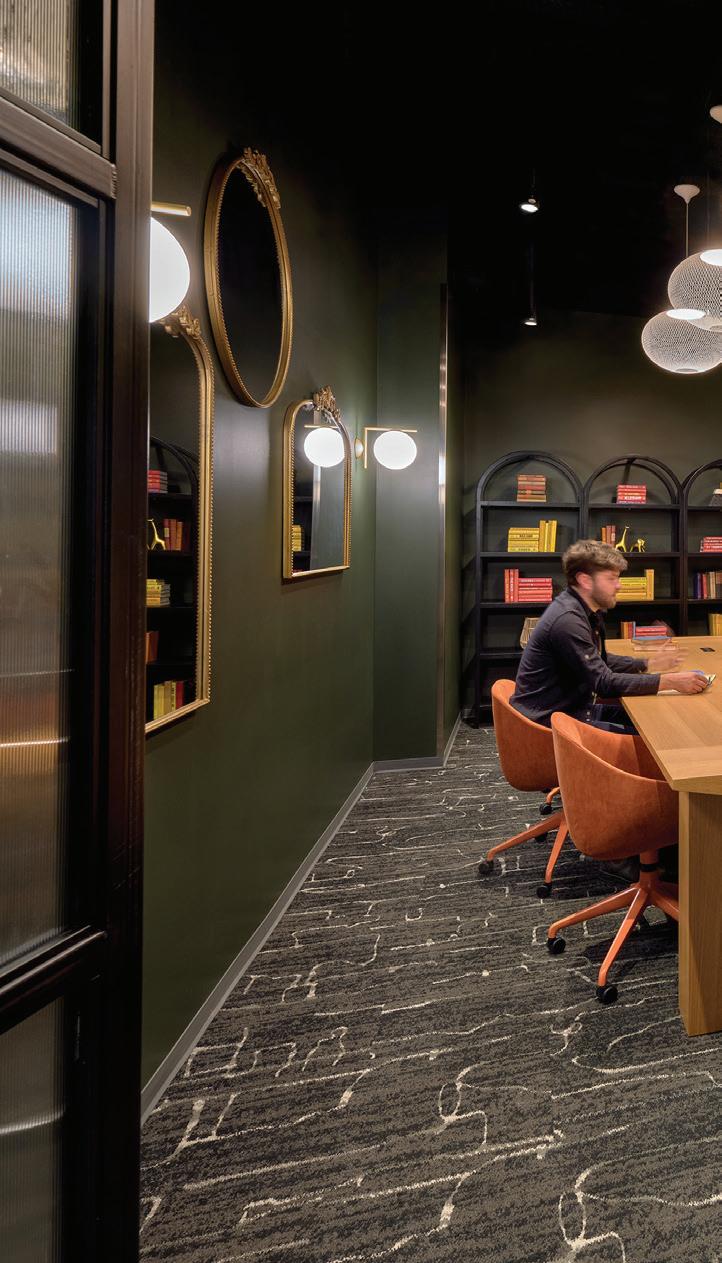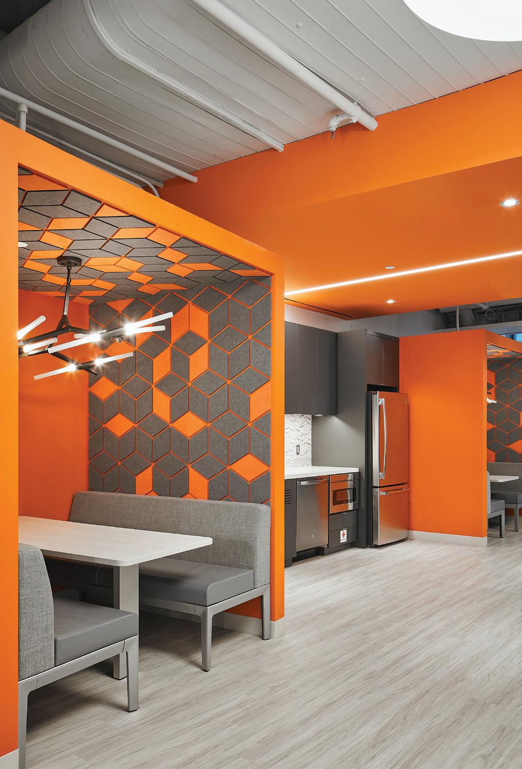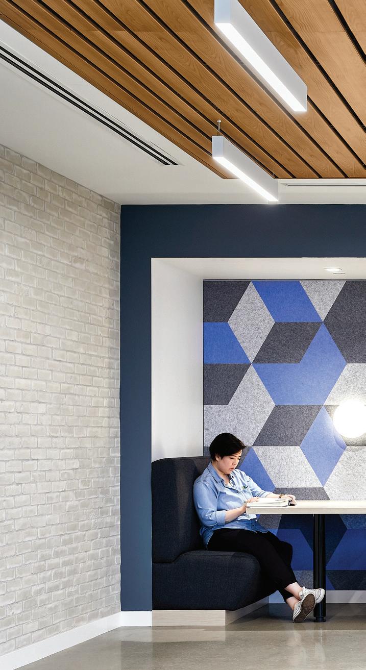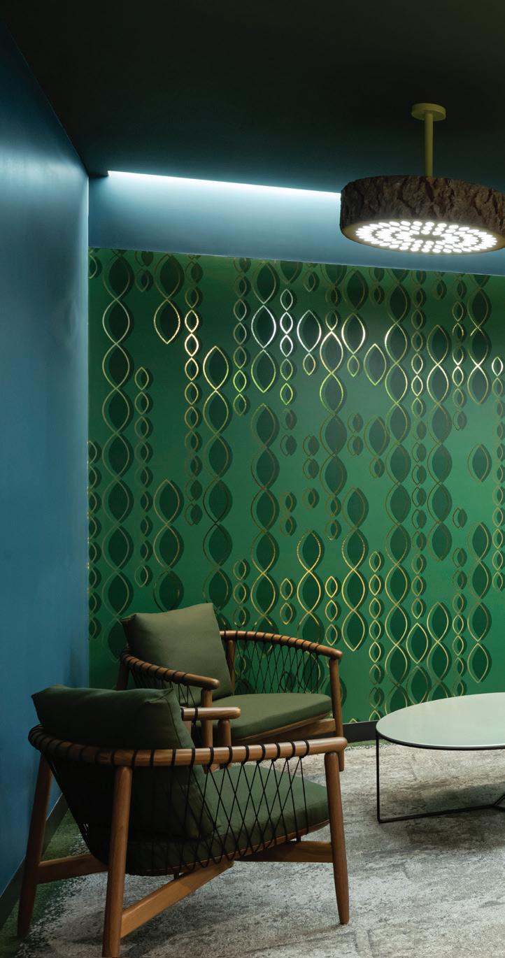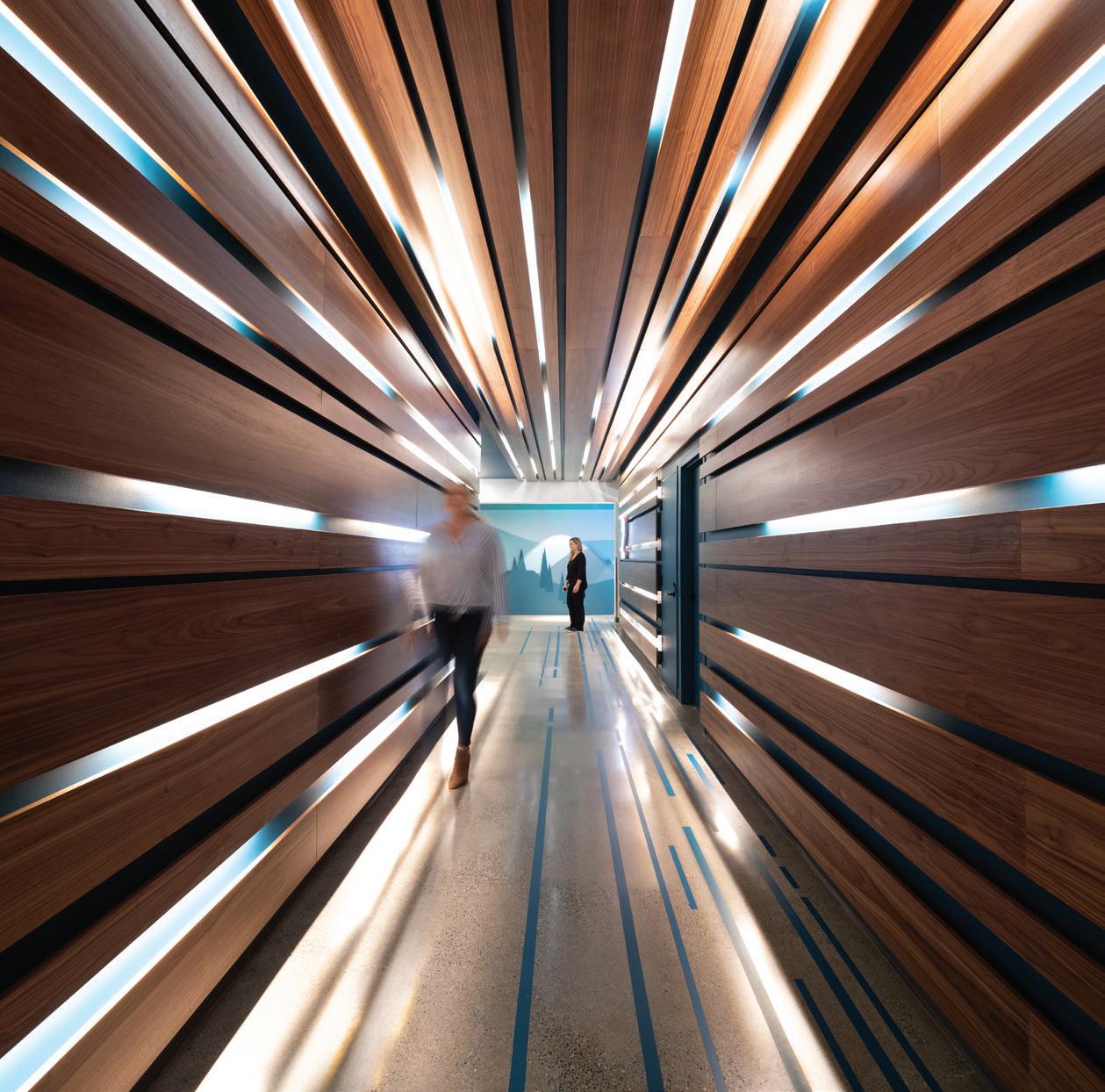 This mural frames the Atrium’s café, snack shop, and main seating area, fostering a vibrant dining, working, collaboration, and socializing hub. The Atrium features various inviting seating areas, accommodating solo work, larger groups, and numerous meeting rooms. Custom light fixtures, fabrics and furniture elicit the feeling of a living room, giving users a sense of belonging and comfort and inviting them to stay awhile.