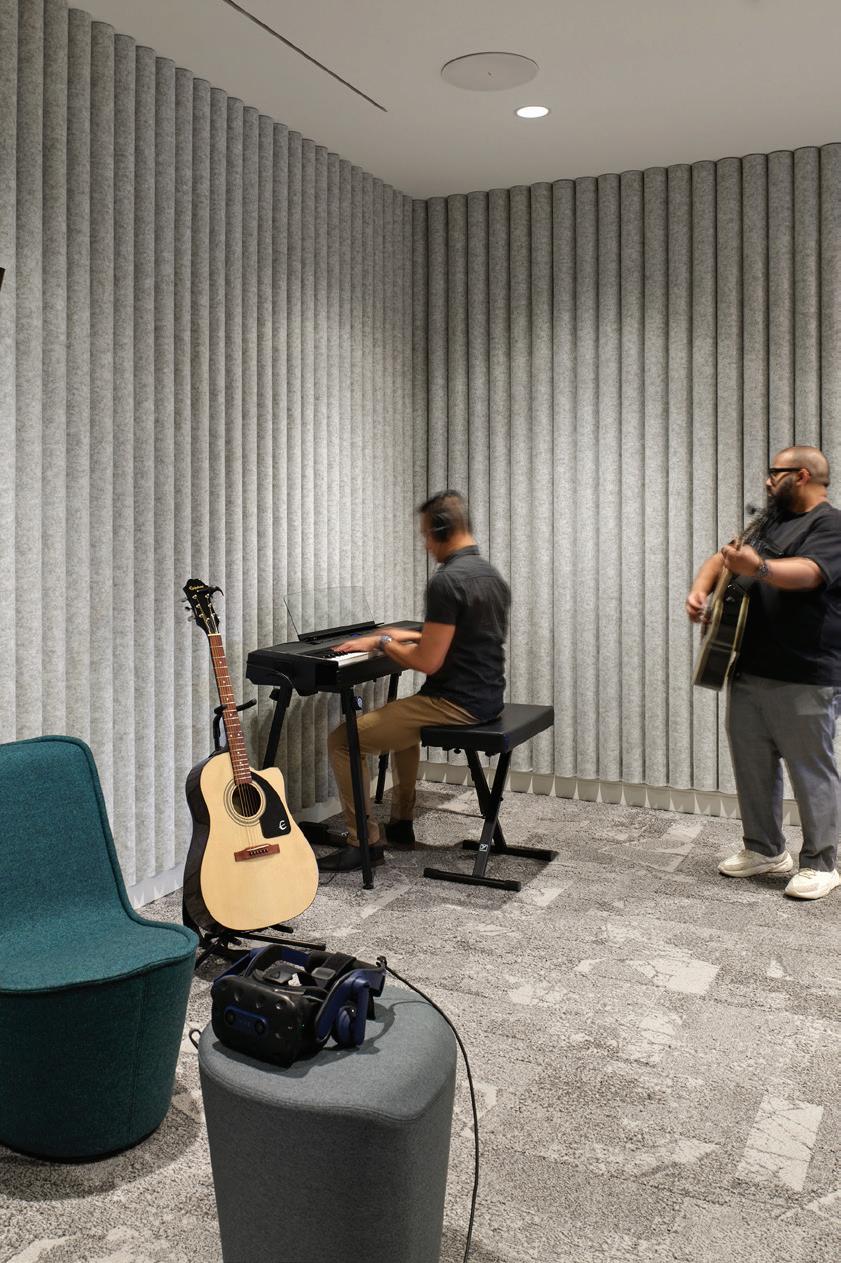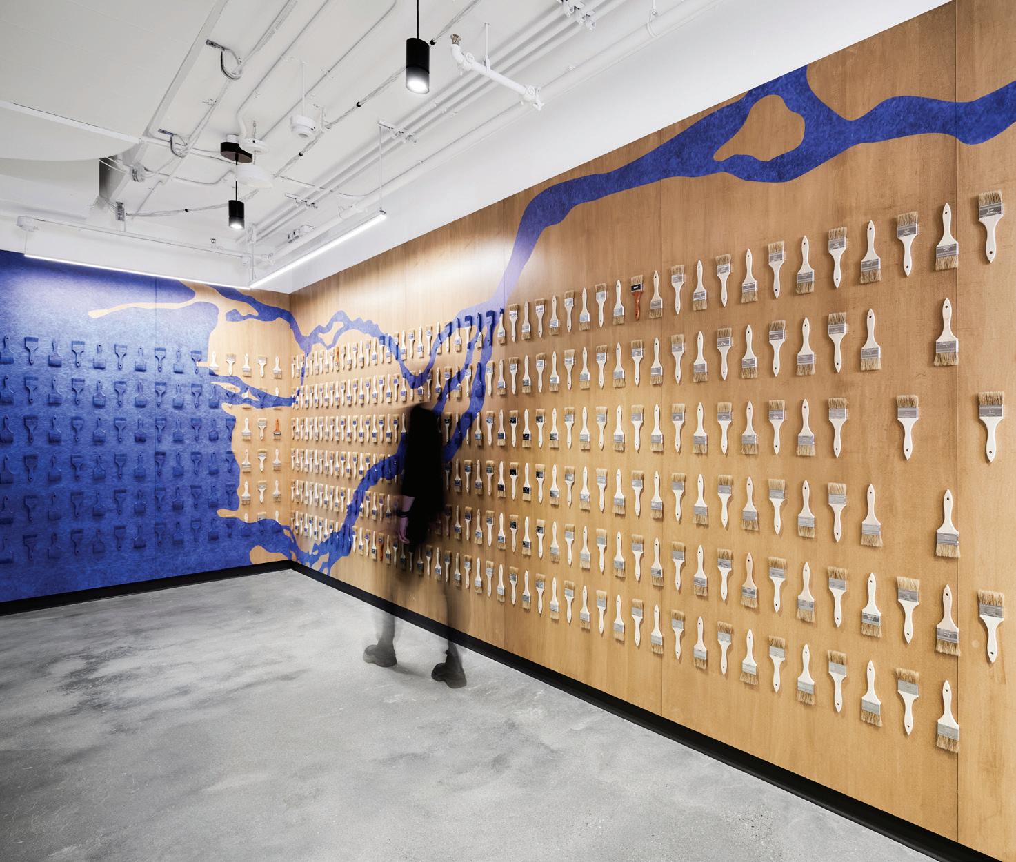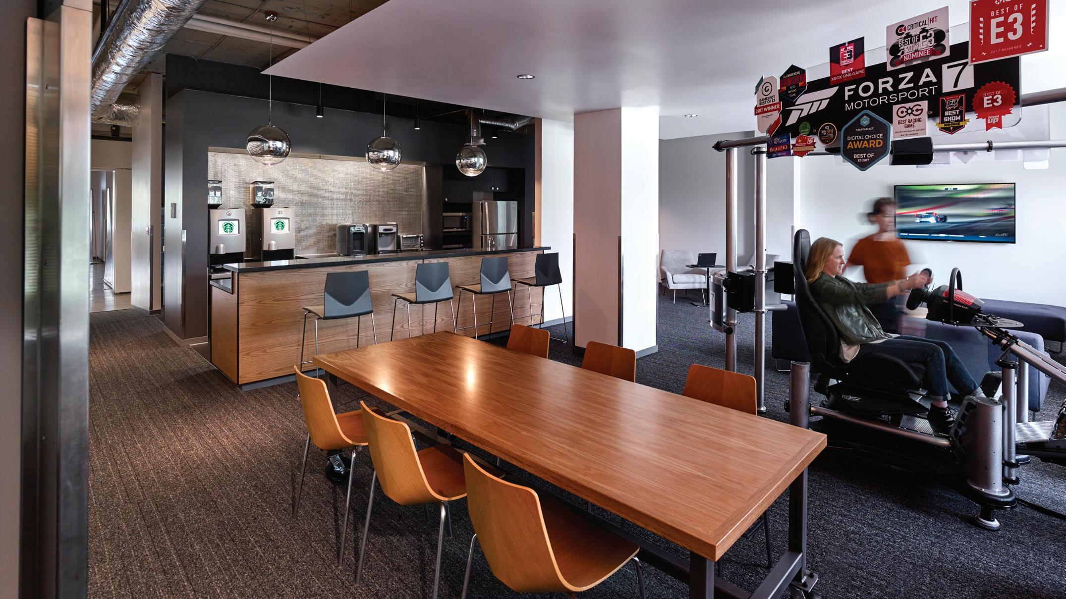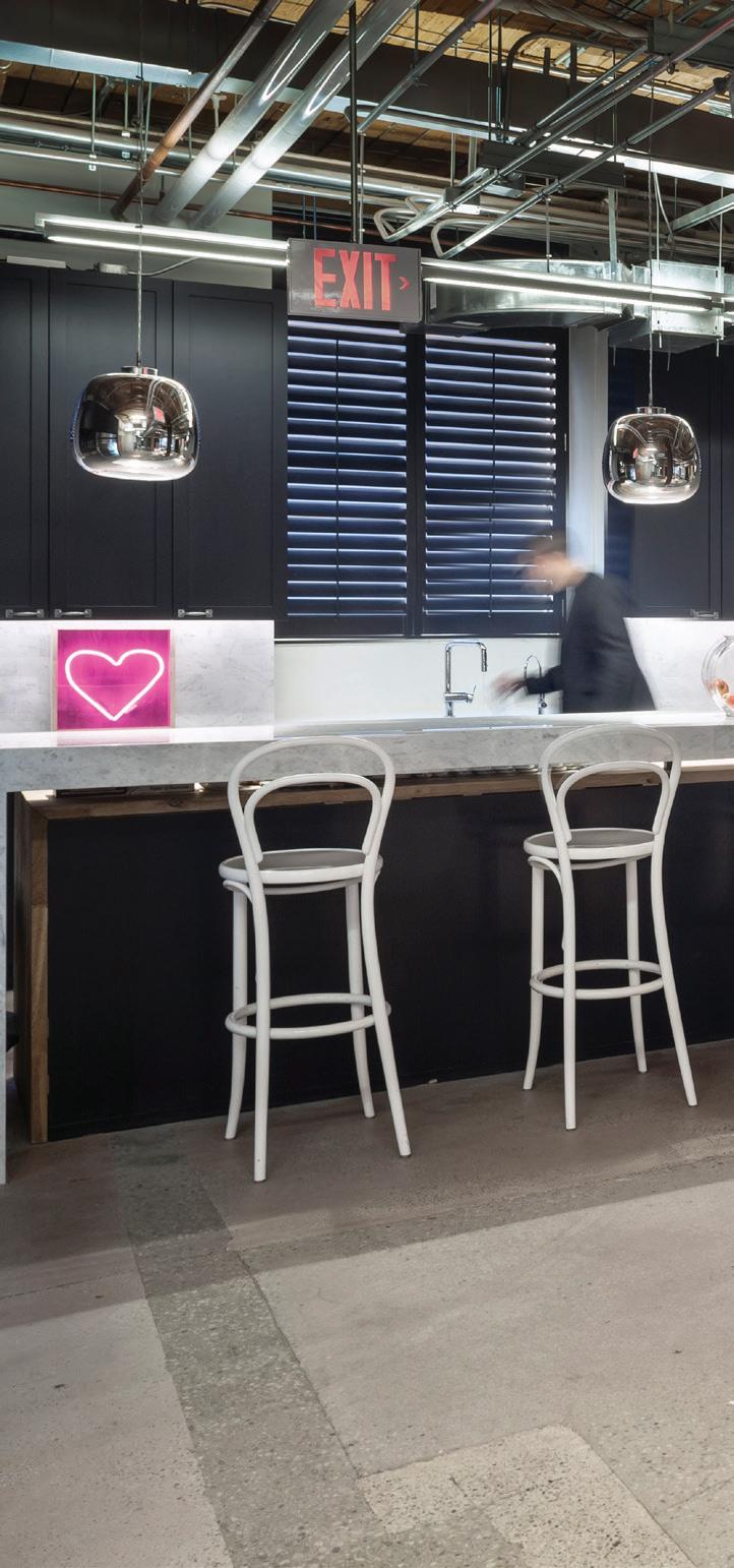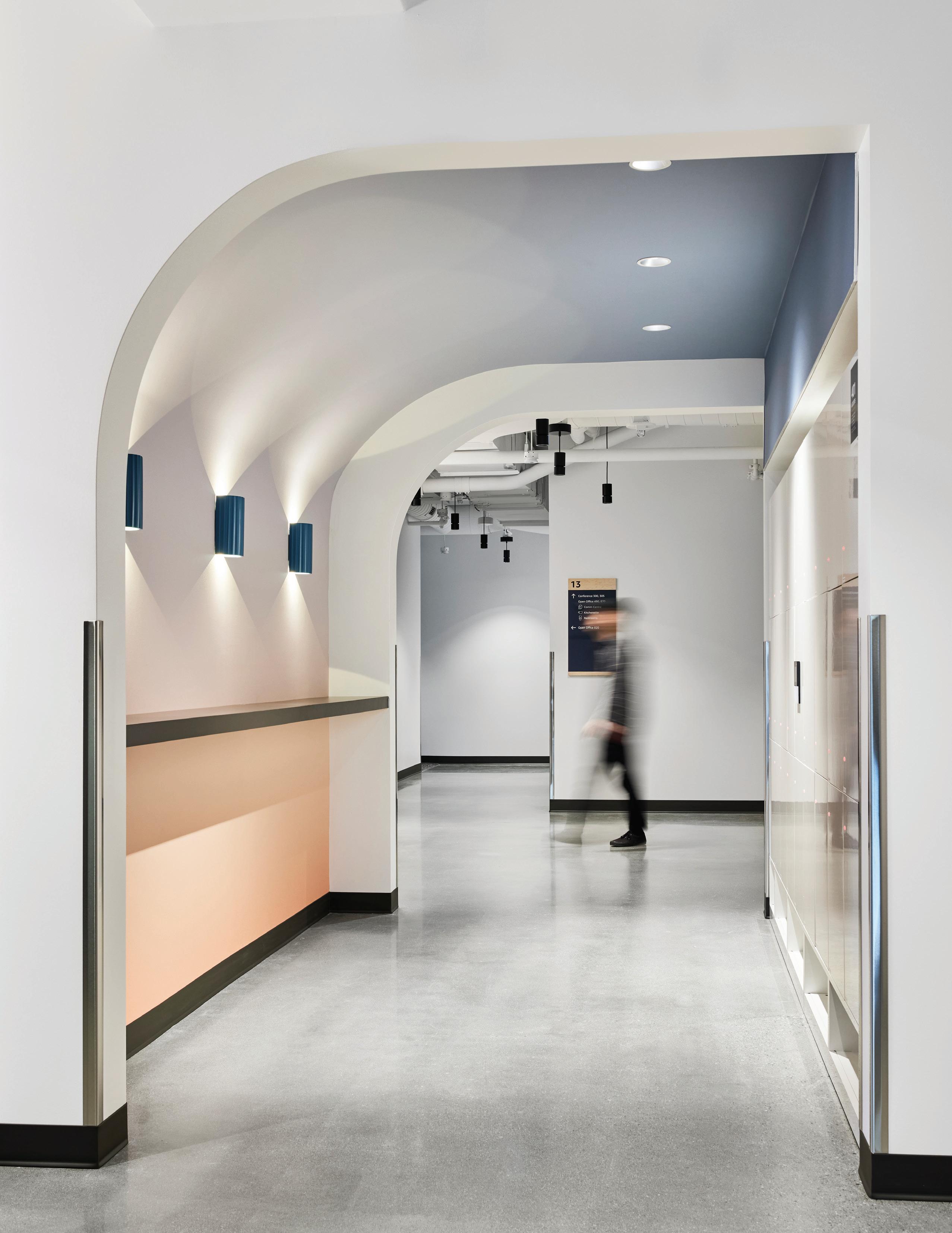 This mural frames the Atrium’s café, snack shop, and main seating area, fostering a vibrant dining, working, collaboration, and socializing hub. The Atrium features various inviting seating areas, accommodating solo work, larger groups, and numerous meeting rooms. Custom light fixtures, fabrics and furniture elicit the feeling of a living room, giving users a sense of belonging and comfort and inviting them to stay awhile.