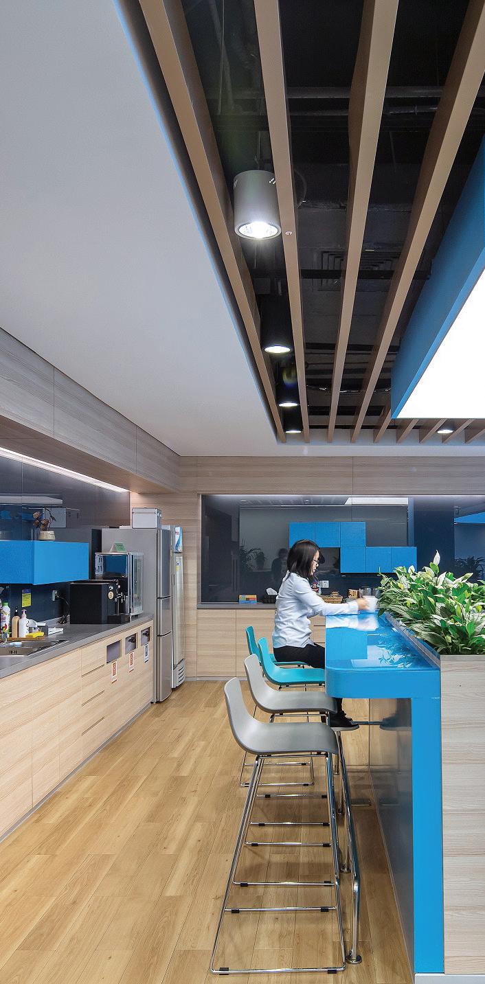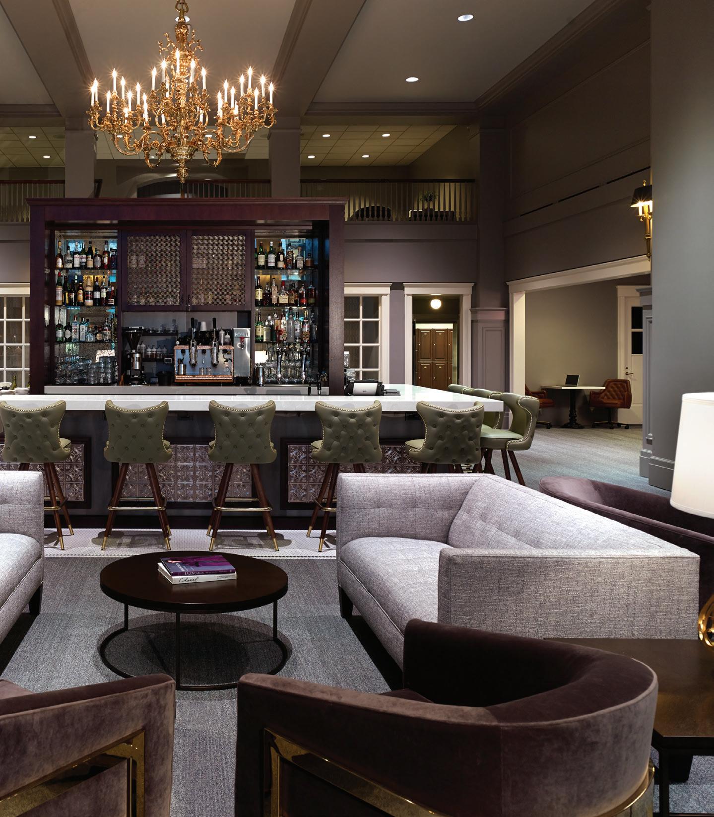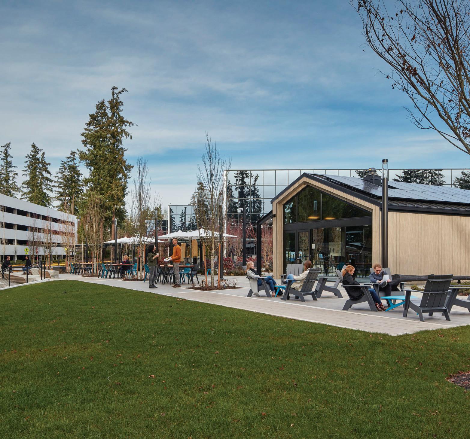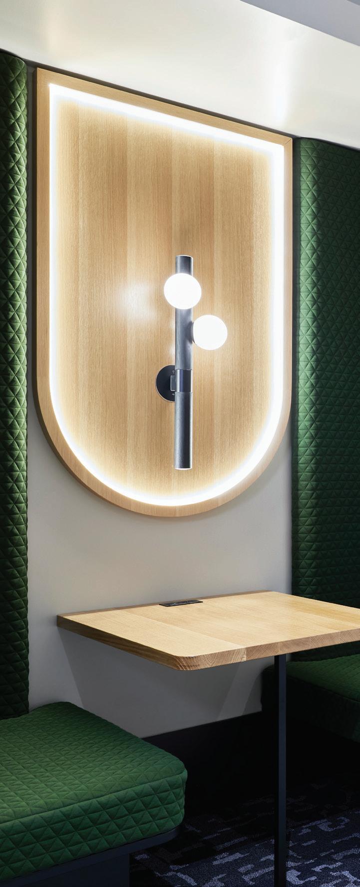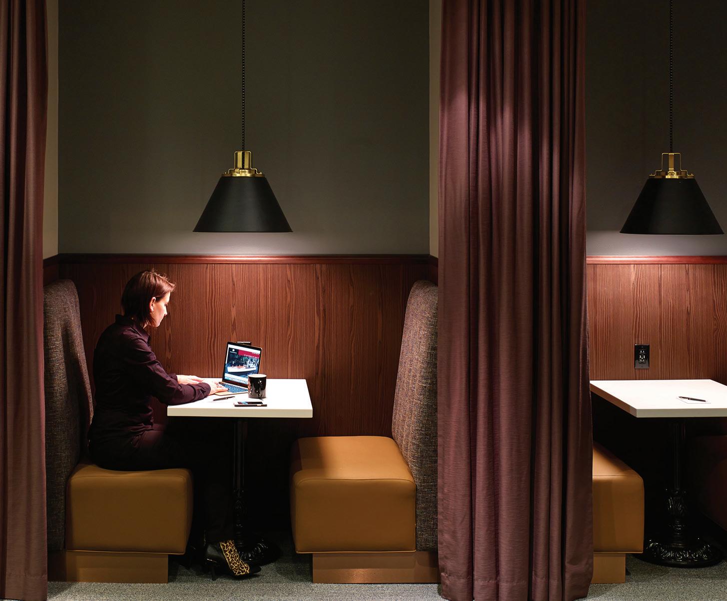 This mural frames the Atrium’s café, snack shop, and main seating area, fostering a vibrant dining, working, collaboration, and socializing hub. The Atrium features various inviting seating areas, accommodating solo work, larger groups, and numerous meeting rooms. Custom light fixtures, fabrics and furniture elicit the feeling of a living room, giving users a sense of belonging and comfort and inviting them to stay awhile.