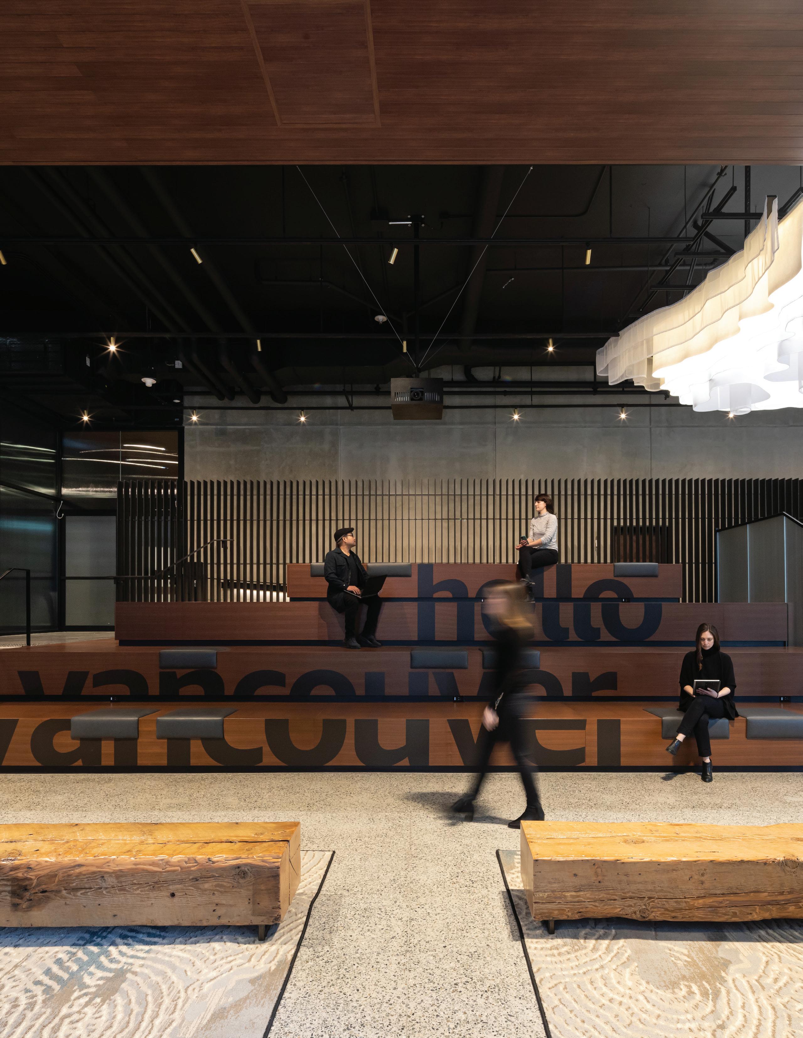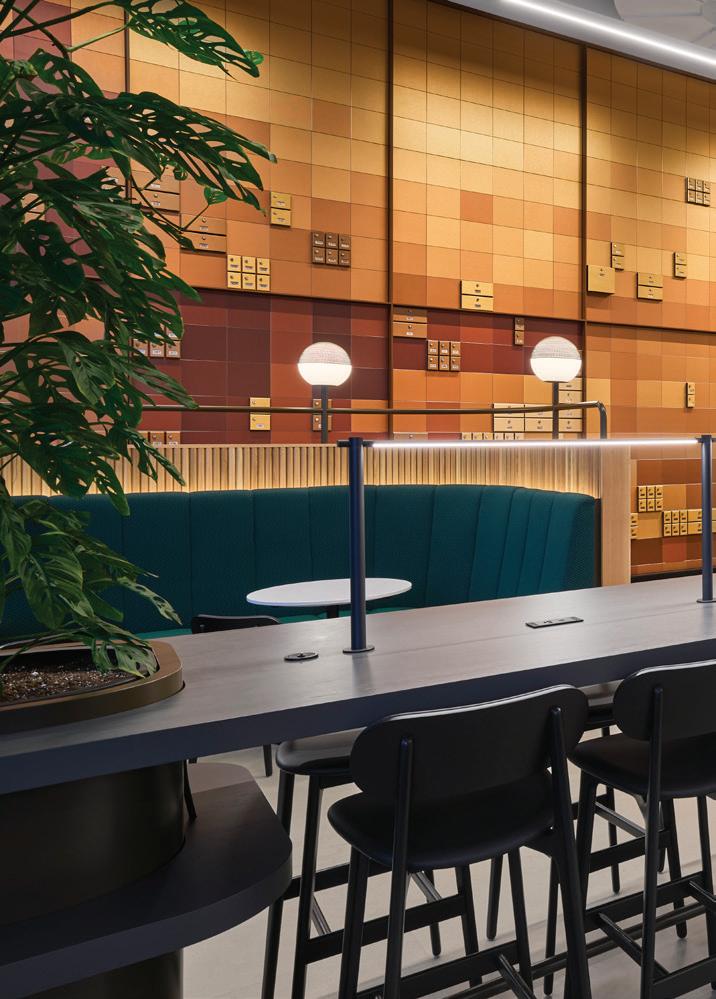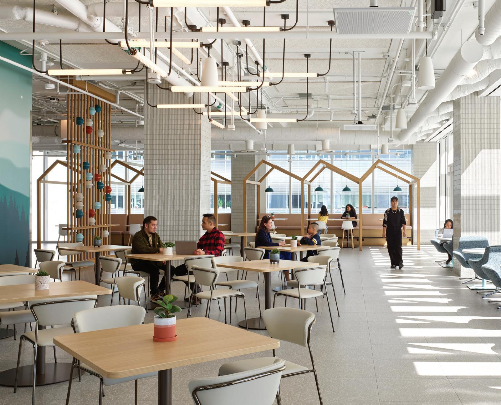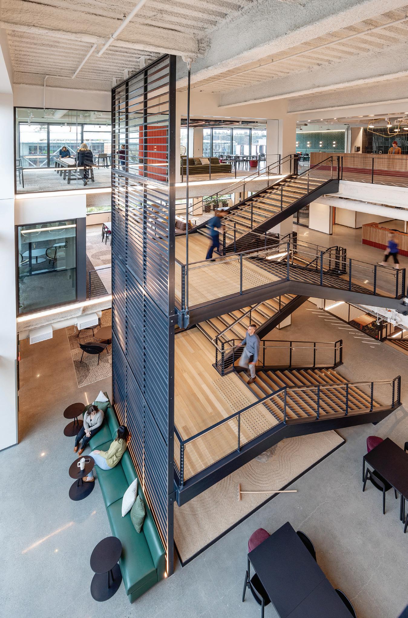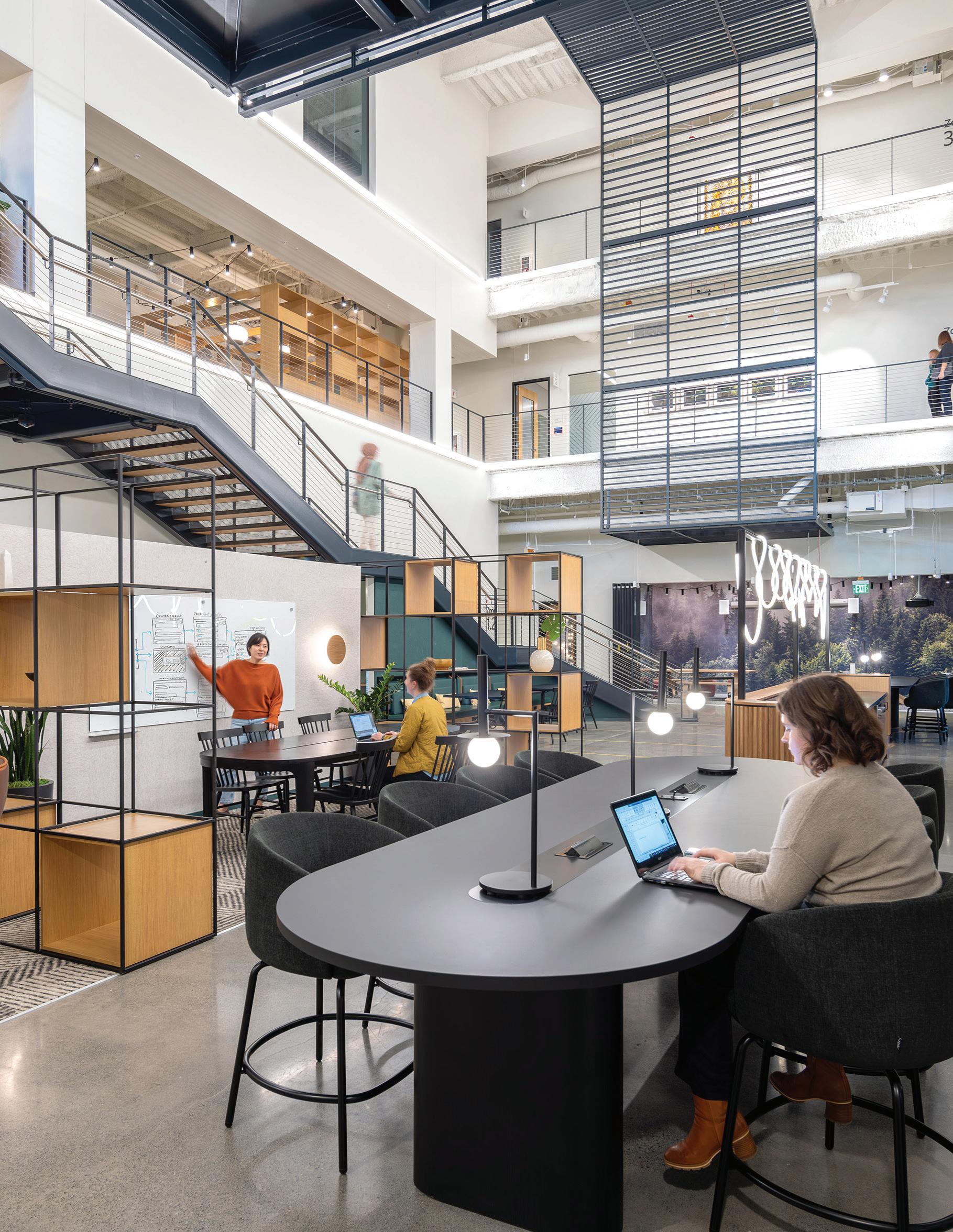 B+H led the interior design of the atrium and the office towers, which total 1.1 million sq.ft of office space. A striking 18-foot mural resembling a pixelated postage stamp crafted from reclaimed mailbox doors dating back to the building’s 1960s origins serves as a focal point. A hidden surprise awaits: one of the original post boxes holds a framed postage stamp from Vancouver to Seattle, commemorating the first mail run with 60 letters.