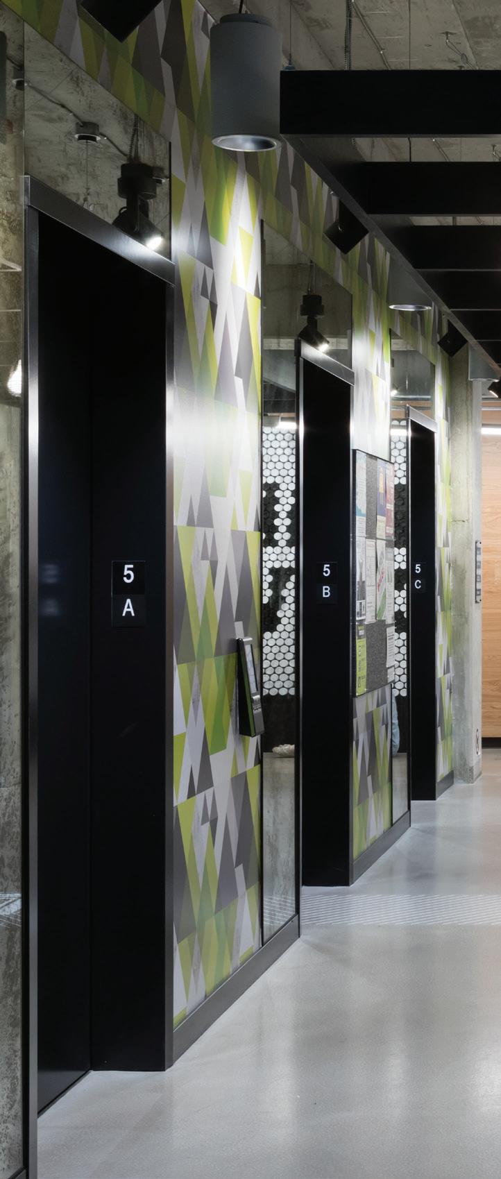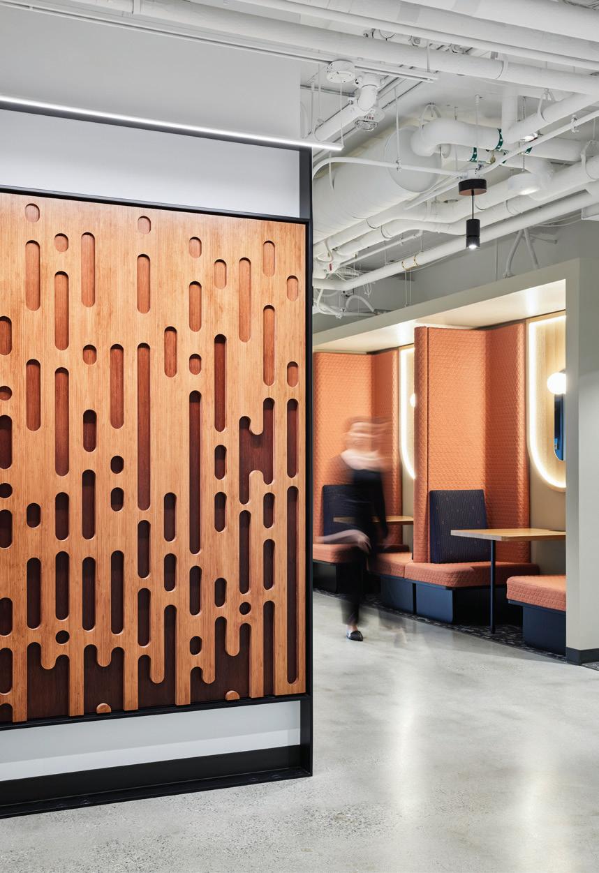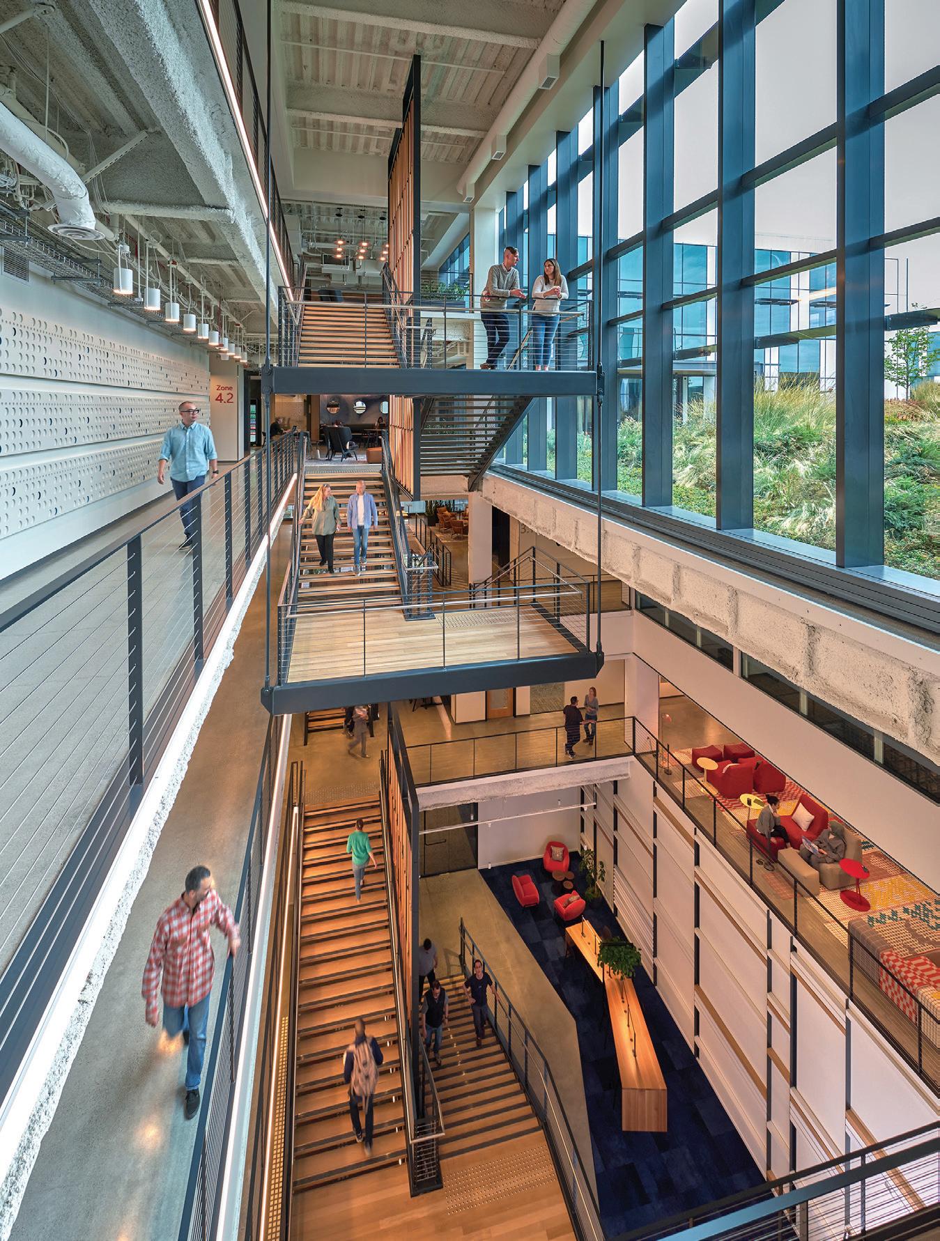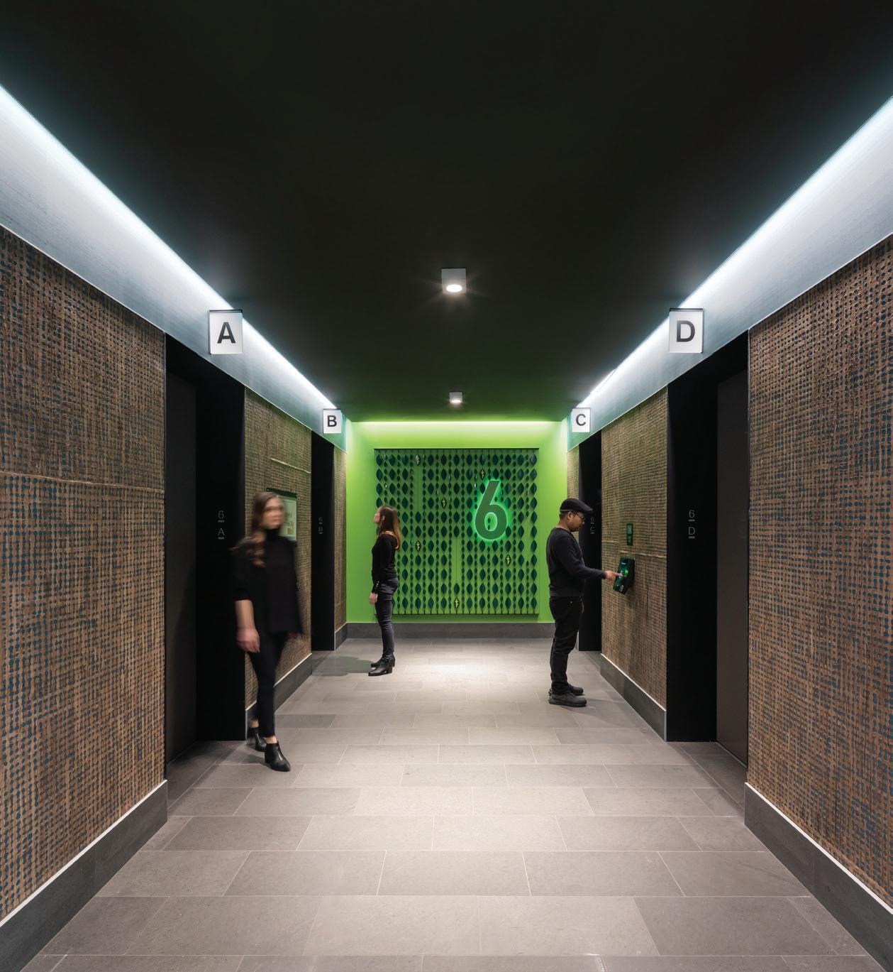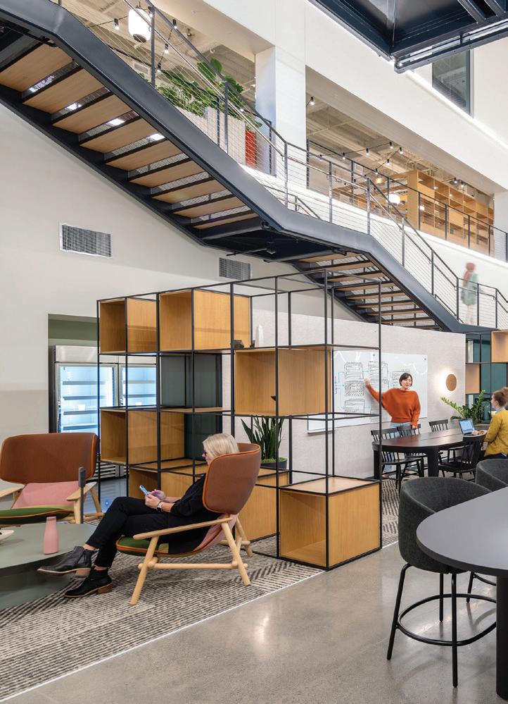 B+H led the interior design of the atrium and the office towers, which total 1.1 million sq.ft of office space. A striking 18-foot mural resembling a pixelated postage stamp crafted from reclaimed mailbox doors dating back to the building’s 1960s origins serves as a focal point. A hidden surprise awaits: one of the original post boxes holds a framed postage stamp from Vancouver to Seattle, commemorating the first mail run with 60 letters.