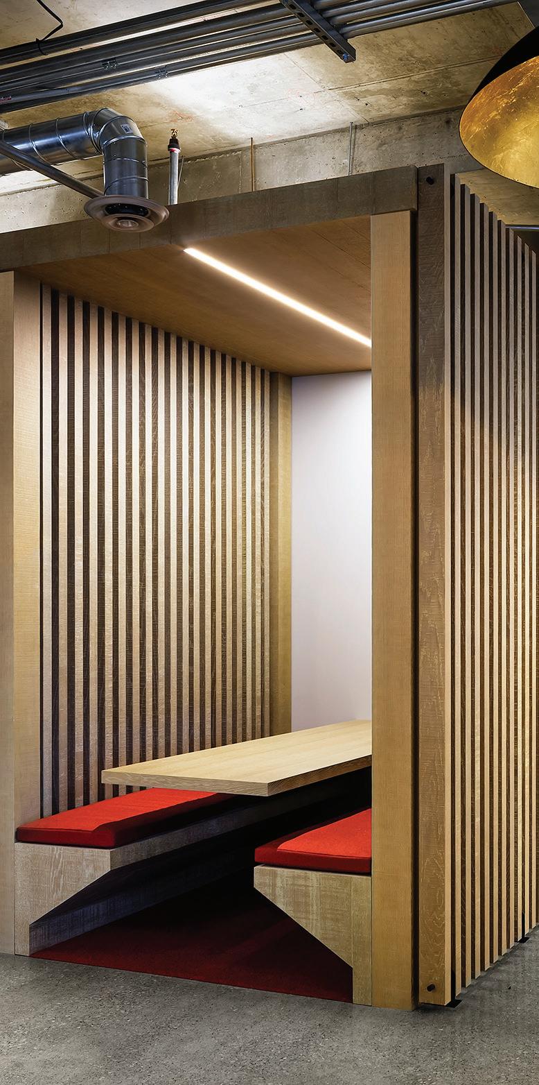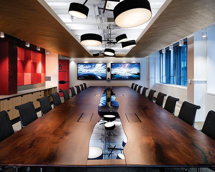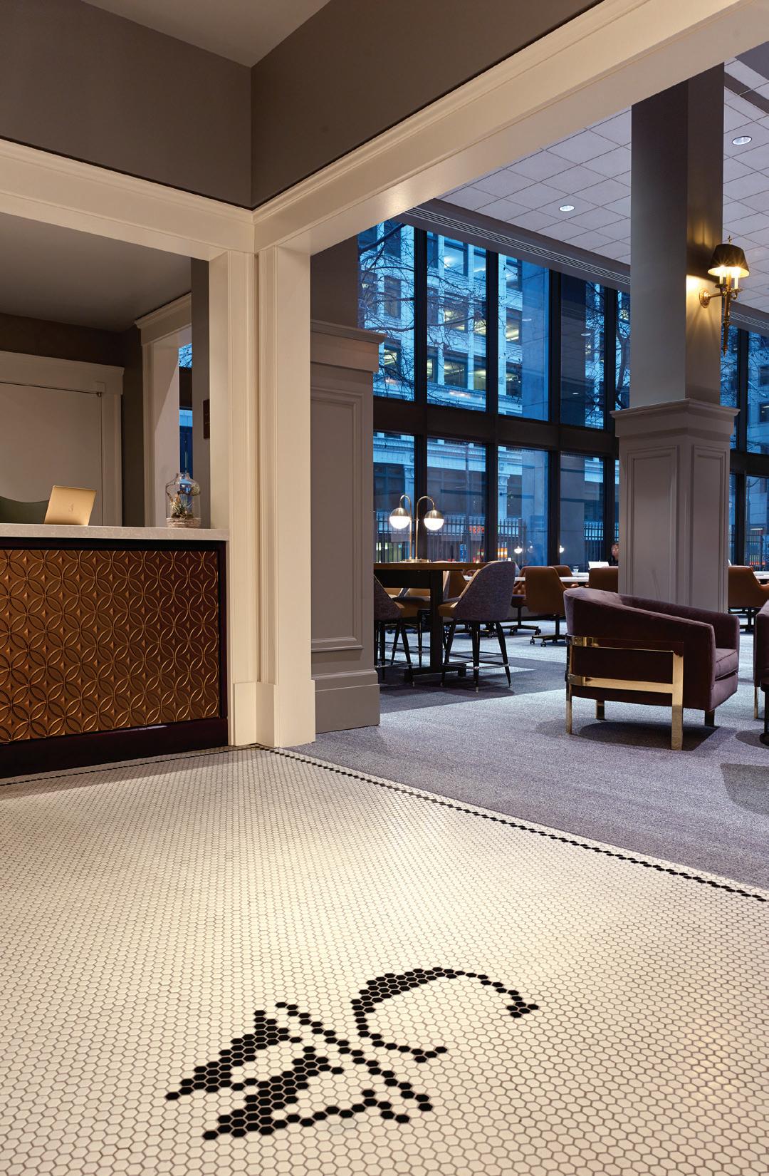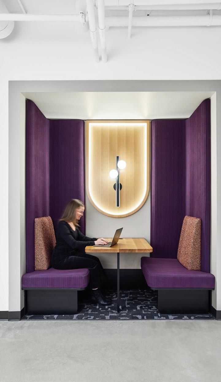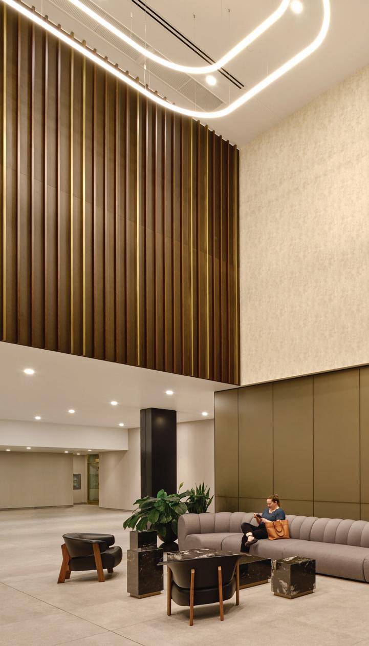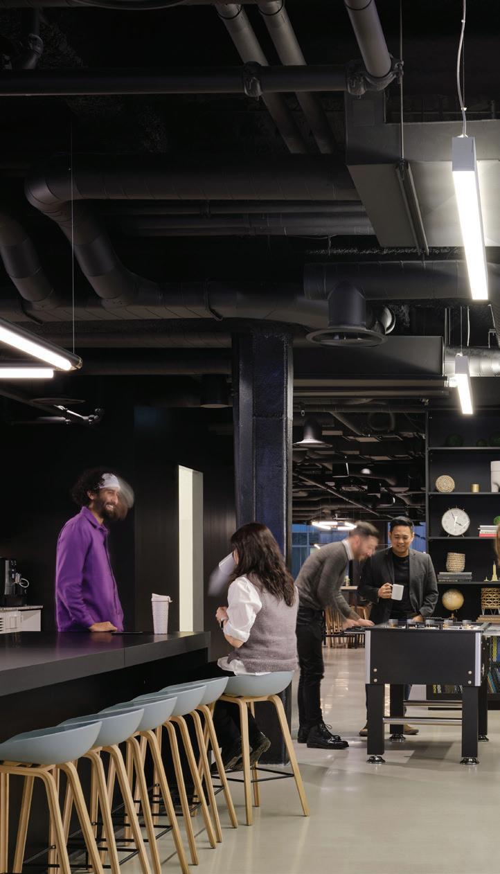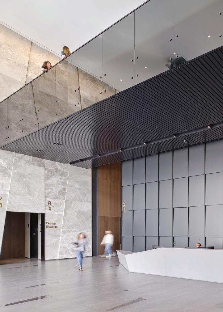 B+H led the interior design of the atrium and the office towers, which total 1.1 million sq.ft of office space. A striking 18-foot mural resembling a pixelated postage stamp crafted from reclaimed mailbox doors dating back to the building’s 1960s origins serves as a focal point. A hidden surprise awaits: one of the original post boxes holds a framed postage stamp from Vancouver to Seattle, commemorating the first mail run with 60 letters.