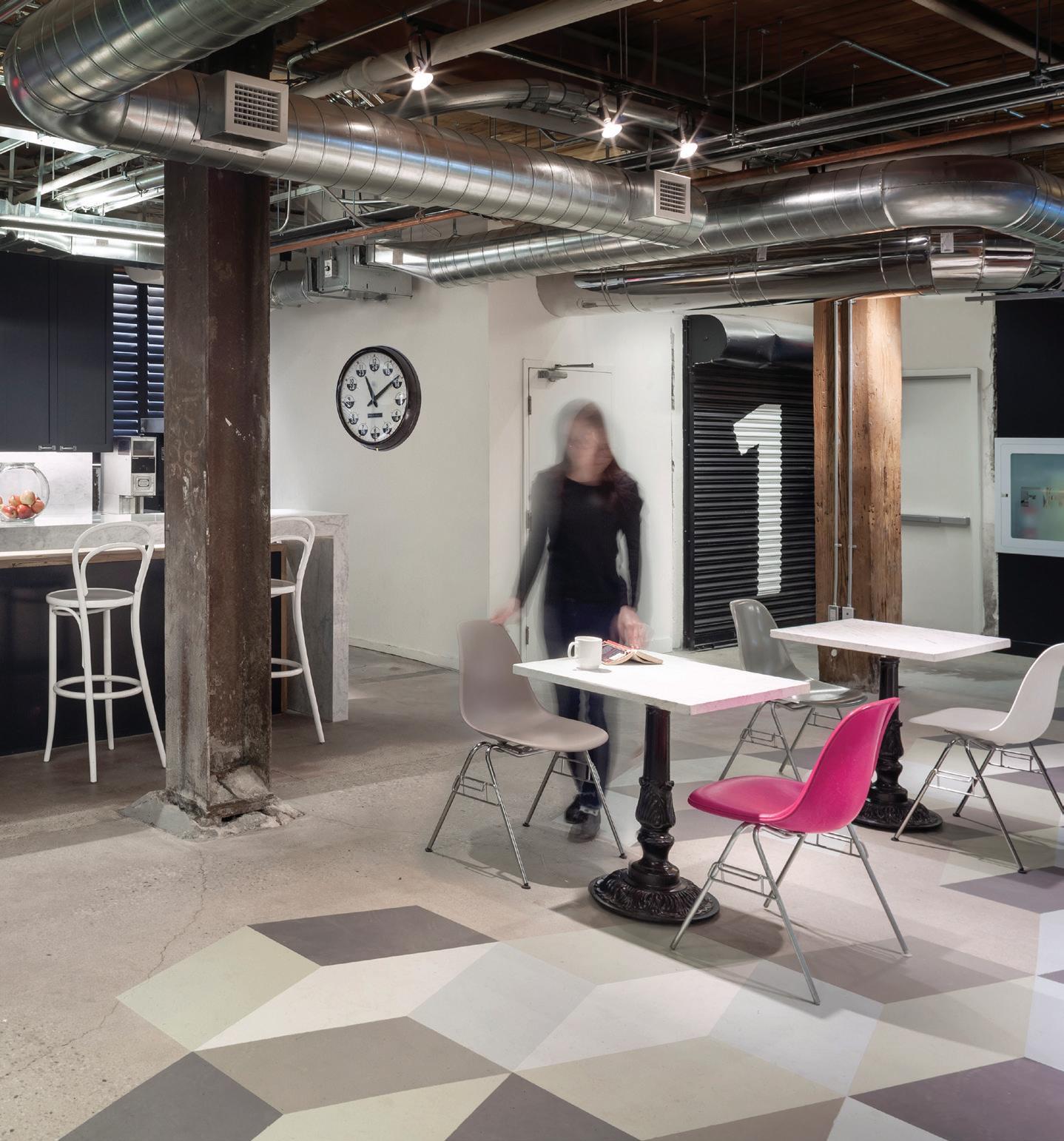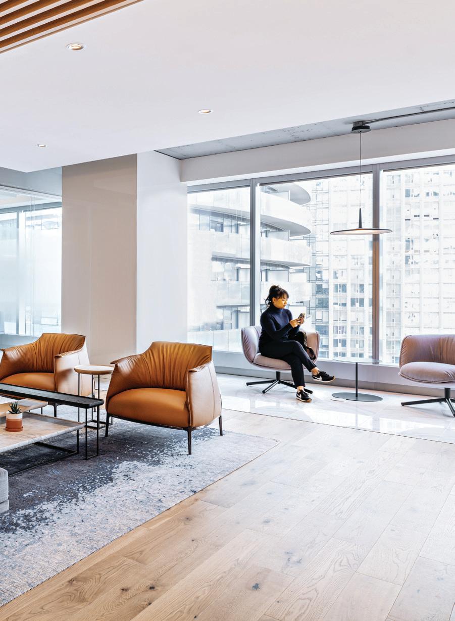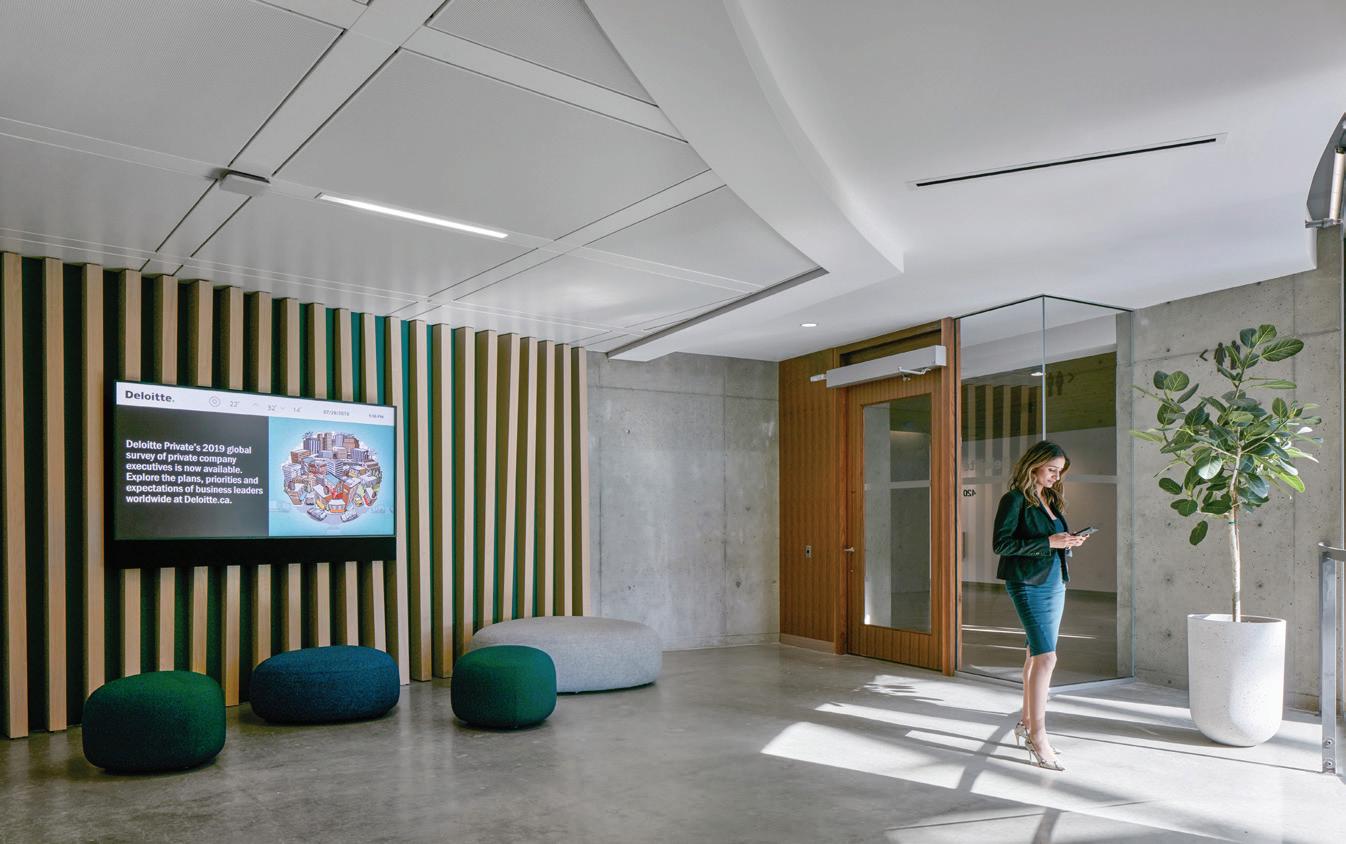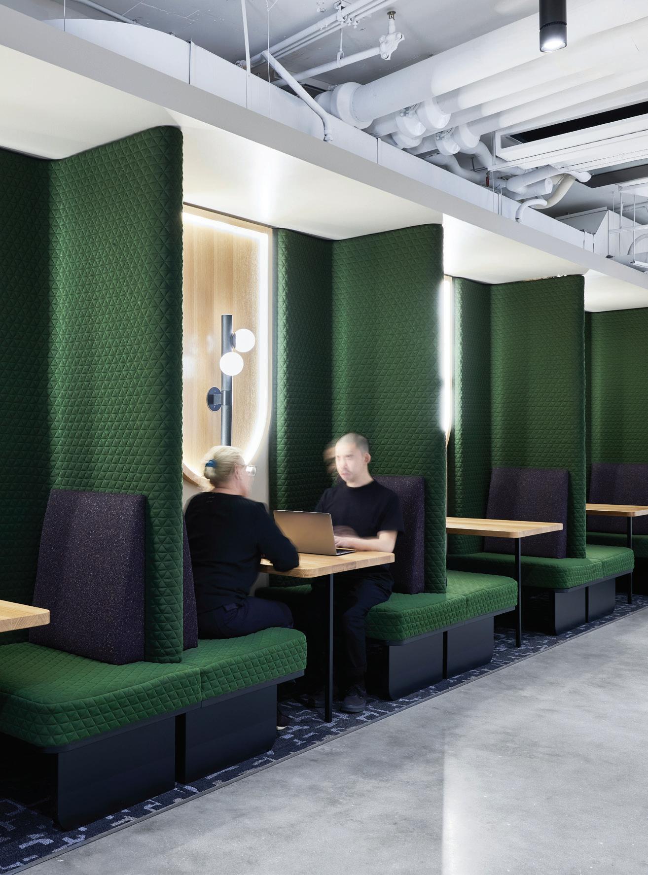 B+H led the interior design of the atrium and the office towers, which total 1.1 million sq.ft of office space. A striking 18-foot mural resembling a pixelated postage stamp crafted from reclaimed mailbox doors dating back to the building’s 1960s origins serves as a focal point. A hidden surprise awaits: one of the original post boxes holds a framed postage stamp from Vancouver to Seattle, commemorating the first mail run with 60 letters.