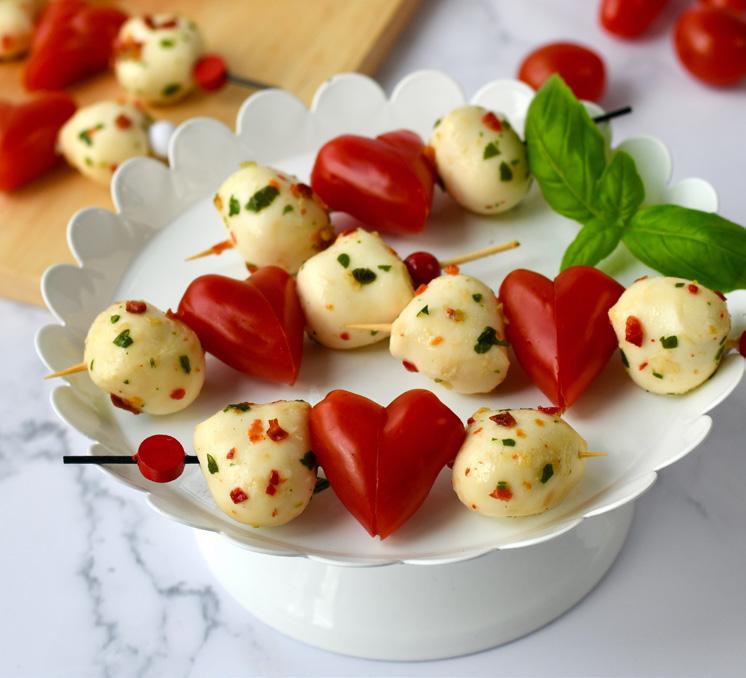 Drain the mozzarella balls. Don’t discard the marinade—it makes a flavorful salad dressing! 5. Thread a marinated mozzarella ball onto a skewer, followed by a heartshaped tomato, then another mozzarella ball. Repeat with the remaining ingredients.