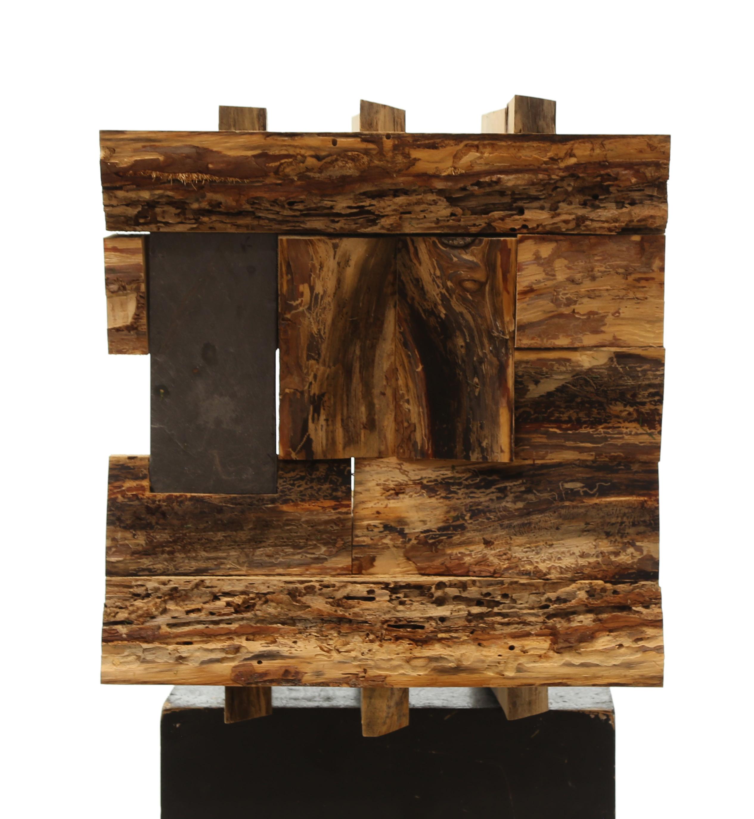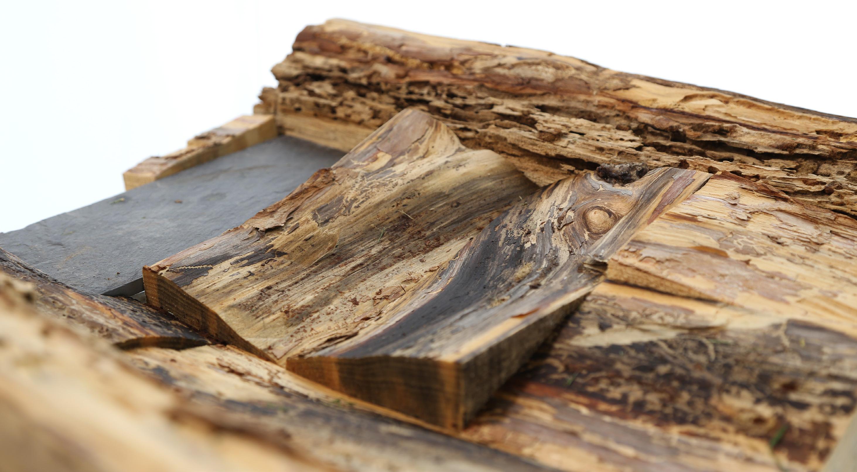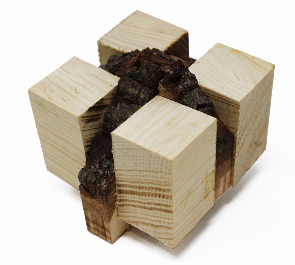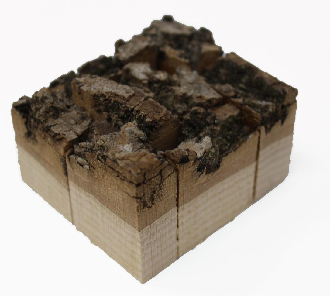 A tea table is crafted by hand from discarded, termiteeaten pieces of bark which allow water to flow through. For the table-top, pieces of wood are deliberately arranged to direct the water towards the center, while slowing percolating through the pores and reaching the ground. The “ritual” of watching the water flow into the ground, while activating the scent of the wood, creates a new type mindfulness between the participants. Since no adhesives are used in making the prototype, the “tea” will slowly break down the table over time, making each experience ephemral and unique.