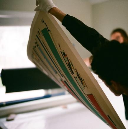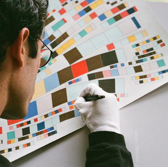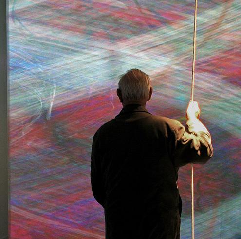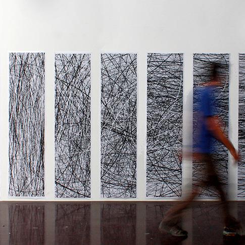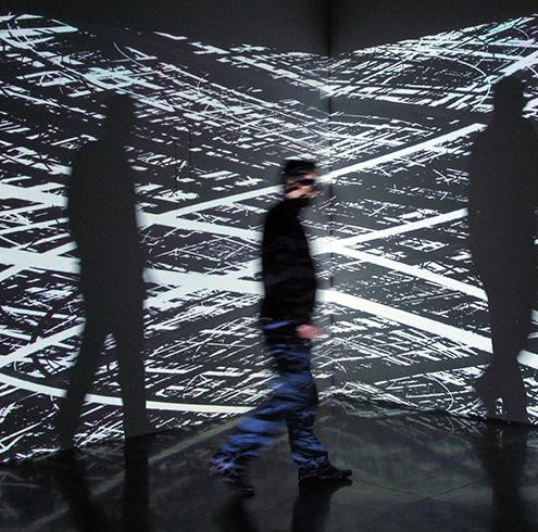 Numbers are coded to generate a pattern which is then plotted in ink. AARON is trained to draw human-like figures, painted in by the artist. Two videos are projected from opposite sides on to the screens. The scaffold is positioned to project images around the room. Patterns are generated from prints and coded into a program.