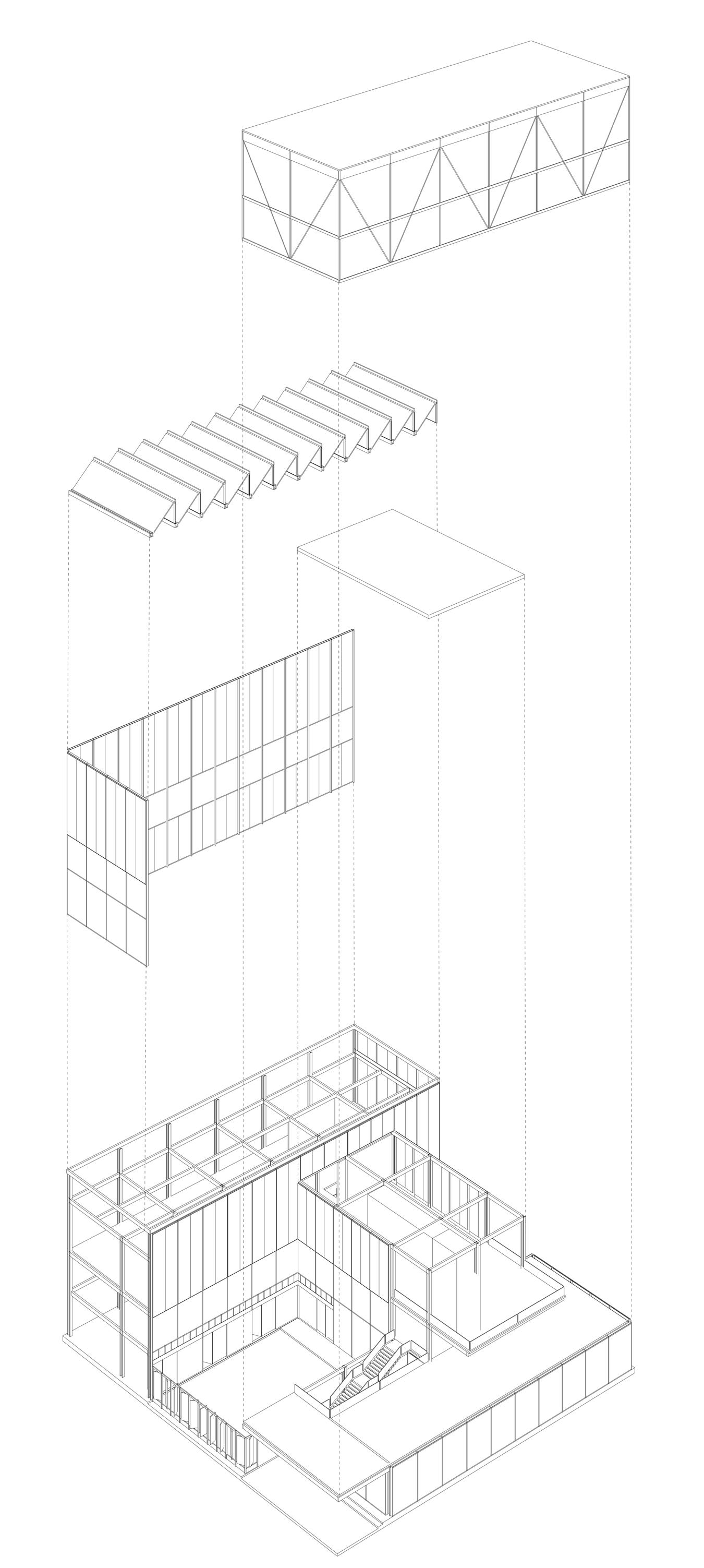 A view of the final iteration: glass, polycarbonate and alumnium composite panels are set in a steel-frame structure.