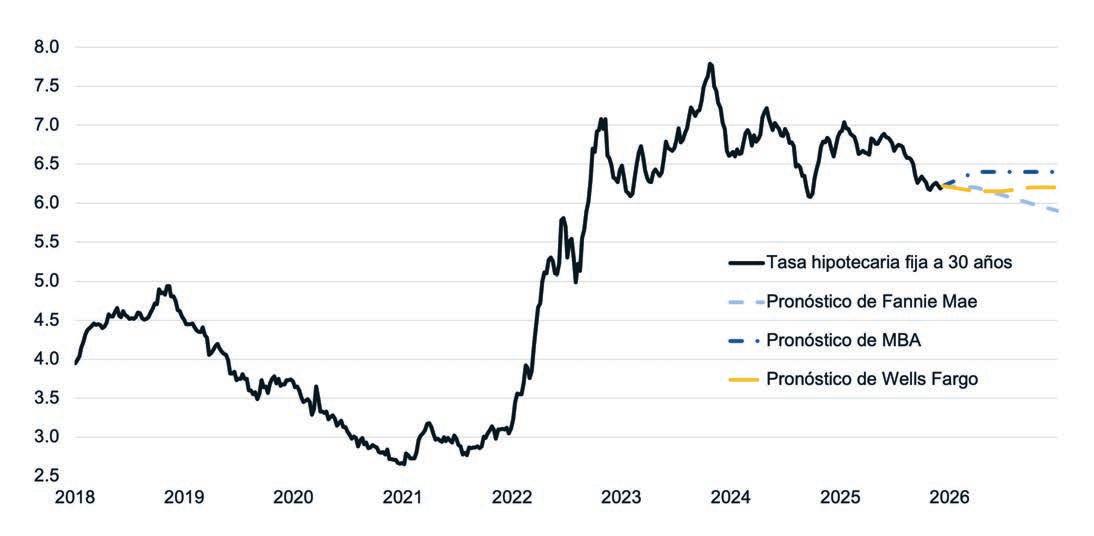 Es probable que las tasas hipotecarias actuales continúen estabilizándose en el 2026, con la mayoría de las proyecciones calculando entre un 6 % y un 6,4 % durante la mayor parte del año. Sin embargo, existe una variedad de productos hipotecarios con tasa de interés ajustable (ARM por sus siglas en inglés) que ofrecen tasas en el rango alto del 5 % para aquellos consumidores abiertos a alternativas en una tasa fija a 30 años. A medida que los consumidores consideran sus planes de vivienda futuros, cabe señalar que casi todas las proyecciones principales de la industrias pronostican que las tasas hipotecarias se mantendrán en el rango del 6 % hasta el 2028. Esto tiene implicaciones significativas para el comportamiento del mercado. Y mientras los esfuerzos actuales por parte de la administración para mejorar la asequibilidad de la vivienda, incluyendo la instrucción a las empresas patrocinadas por el gobierno (GSE por sus siglas en inglés) a comprar bonos hipotecarios, podrían tener un impacto positivo en las tasas hipotecarias, aunque no se pronostica que estos esfuerzos resulten en reducciones drásticas de la tasa.