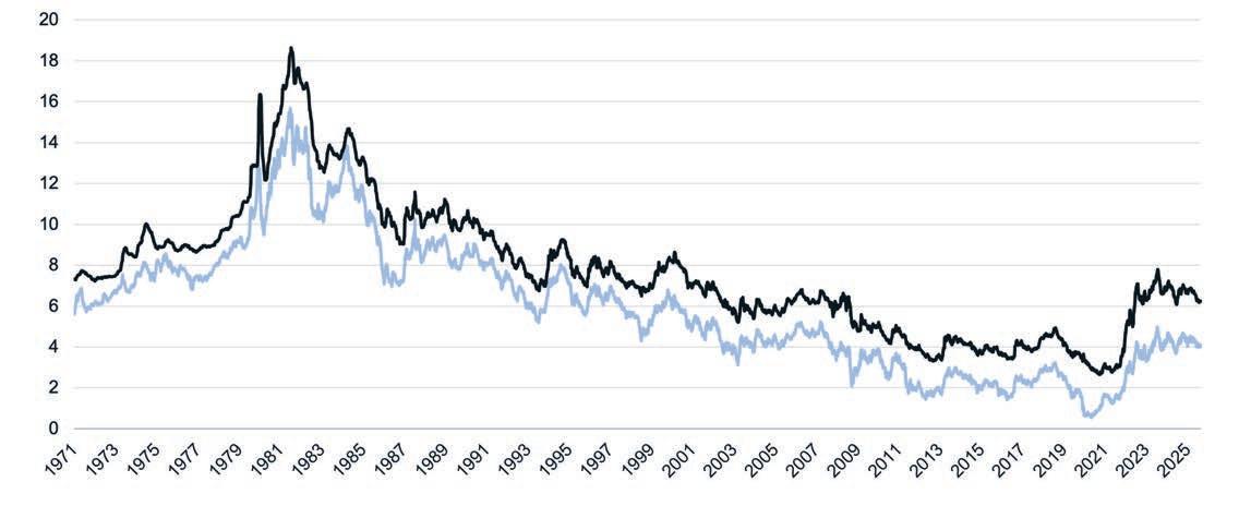 En contexto, las tasas de interés fijas a 30 años han oscilado en promedio entre el 6 % y el 7 % desde 1990. Ese año, la tasa promedio era del 10,13 %, aún elevada respecto a la inflación alta de los años 1980. Para 1998, el promedio se desplomó hasta aproximadamente el 6,91 % y continuó una trayectoria descendente mientras la Fed intervino durante la Gran Recesión y luego la pandemia. Entre 2015 y 2022, las tasas hipotecarias fueron inusualmente bajas, niveles poco probables que se repitan a corto plazo.
