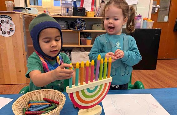 In December, classes invited families to join in games of dreidel with the children. Some classes had families helping out with special art activities or making latkes. Food traditions add another layer of sensory learning. Making latkes or tasting foods cooked in oil opens conversations about family customs and gratitude. Art activities, such as decorating a Hanukkiah, painting with gold and blue, or patterning candles, encourage creativity while reinforcing cognitive development.