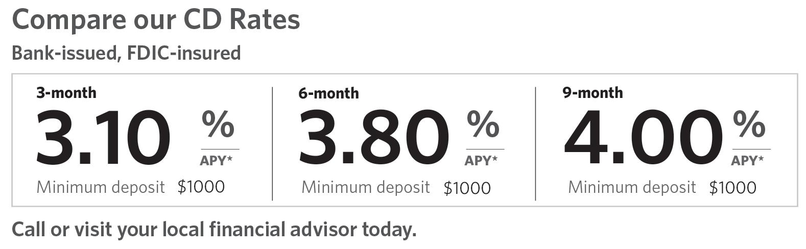 *Annual Percentage Yield (APY) effective 09/27/2022. CDs offered by Edward Jones are bank-issued and FDIC-insured up to $250,000 (principal and interest accrued but not yet paid_ per depositor, per insured depository institution, for each account ownership category. Please visit www.fdic.gov or contact your financial advisor for additional information. Subject to availability and price change. CD values are subject to interest rate risk suck that when interest rates rise, the prices of CDs can decrease. If CDs are sold prior to maturity, the investor can lose principal value. FDIC insurance does not cover losses in market value. Early withdrawal may not be permitted. Yields quoted are net of all commissions. CDs require the distribution of interest and do not allow interest to compound. CDs offered through Edward Jones are issued by banks and thrifts nationwide. All CDs sold by Edward Jones are registered with the Depository Trust Corp. (DTC).