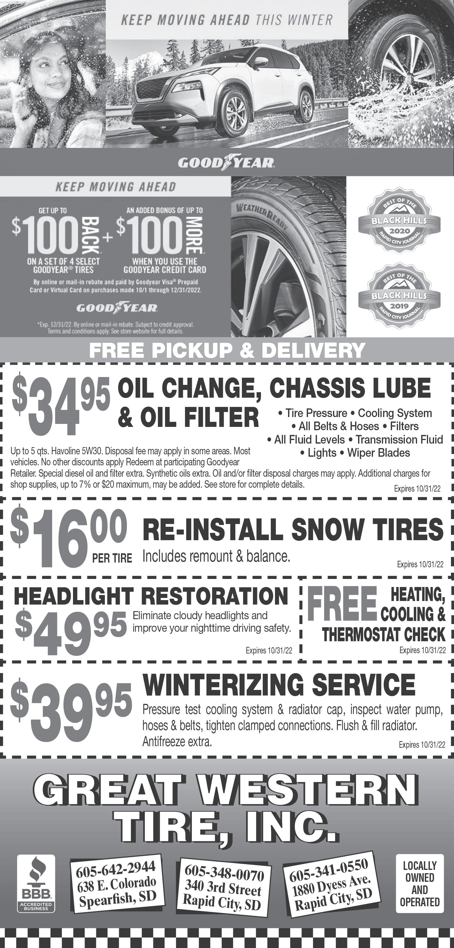 2324 Junction Ave., Sturgis, SD 605-720-8315 BARGAIN BARN TIRE PROS LOCATIONS IN RAPID CITY 1811 Deadwood Ave. 605-399-3917 | 1610 Cambell St. 605-721-5427 Large Inventory of Quality New & Used Tires LOCALLY OWNED AND OPERATED ® Your Authorized Tire Dealer For: Brake Service • Alignment • Oil Changes Air Conditioning Shocks • Struts Suspension Work & More!
