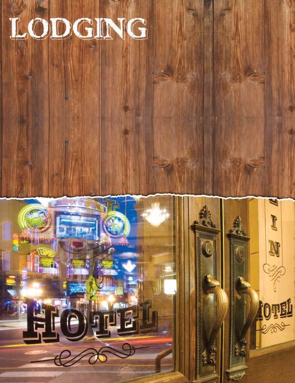 BREAKFAST POOL HOT TUB HANDICAP ACC. KITCHENETTE PETS ALLOWED EXERCISE ROOM GUEST LAUNDRY INTERNET ACCESS LARGE GROUP SP. BLACK HILLS INN & SUITES 206 Mountain Shadow Lane South | 605-578-7791 • • • • • • THE BRANCH HOUSE 37 Sherman Street | 605-559-1400 • • • • • BUTCH CASSIDY & SUNDANCE KID LUXURY SUITES 57 Sherman Street | 605-343-8126 • • • CEDAR WOOD INN 103 Charles Street | 605-578-2725 • • CELEBRITY HOTEL 629 Main Street | 605-578-1685 • CHEYENNE CROSSING 21415 US Hwy. 14A, Lead | 605-584-3510 • COMFORT INN & SUITES 225 Cliff Street | 605-578-7550 • • • • • • • • DEADWOOD GULCH GAMING RESORT 304 Cliff Street/Hwy 85 | 605-578-1294 | 1-800-695-1876 • • • • • • • DEADWOOD KOA CAMPGROUND 11484 US Hwy. 14A | 800-562-0846 | 605-578-3830 • • • DEADWOOD MINERS HOTEL 137 Charles Street | 605-578-1611 • • • • DEADWOOD MOUNTAIN GRAND-A HOLIDAY INN RESORT 1906 Deadwood Mountain Drive | 605-559-0386 • • • • • • • • • • DEADWOOD STATION BUNKHOUSE & GAMBLING HALL 68 Main Street | 605-578-3476 • • • • DOUBLE TREE BY HILTON IN CADILLAC JACKS 360 Main Street | 605-571-1245 • • • • • • • • FIRST GOLD GAMING RESORT 270 Main Street | 605-578-9777 | 800-274-1876 • • • • • FOUR POINTS BY SHERATON AT TIN LIZZIE 555 Main Street | 605-791-5020 • • • • • • GOLD COUNTRY INN 801 Main Street | 605-578-2393 • • • • HAMPTON BY HILTON AT TIN LIZZIE 531 Main Street | 605-578-1893 • • • • • • HICKOK’S HOTEL & CASINO 685 Main Street | 605-578-2222 • • • HISTORIC BULLOCK HOTEL 633 Main Street | 605-578-1745 • • HOLIDAY INN EXPRESS HOTEL & SUITES 22 Lee Street | 605-578-3330 • • • • • • • • THE HOTEL BY GOLD DUST 25 Lee Street | 605-559-1400 • • • • IRON HORSE INN DEADWOOD 27 Deadwood Street | 605-717-7530 • THE LODGE AT DEADWOOD GAMING RESORT 100 Pine Crest Lane | 605-584-4800 • • • • • • • • • • MARTIN MASON HOTEL 33 Deadwood Street | 605-722-3456 • • • MINERAL PALACE HOTEL & GAMING COMPLEX 601 Main Street | 605-578-2036 • • • • • SILVERADO FRANKLIN HISTORIC HOTEL & GAMING COMPLEX 709 Main Street | 605-578-3670 • • • • • SPEARFISH CANYON LODGE 10619 Roughlock Falls Road, Lead | 605-584-3435 | 877-975-6343 • • • • SPRINGHILL SUITES BY MARRIOTT AT CADILLAC JACKS 322 Main Street | 605-559-1600 • • • • • • • • • SUPER 8 DEADWOOD 196 Cliff Street | 605-578-2535 • • • • TRAVELODGE AT FIRST GOLD 250 Main Street | 605-717-7181 • • • • • TRU BY HILTON AT CADILLAC JACKS 372 Main Street | 605-571-1001 • • • • • WHISTLER GULCH CAMPGROUND 235 Cliff Street | 800-704-7139 | 605-578-2092 • • • • •