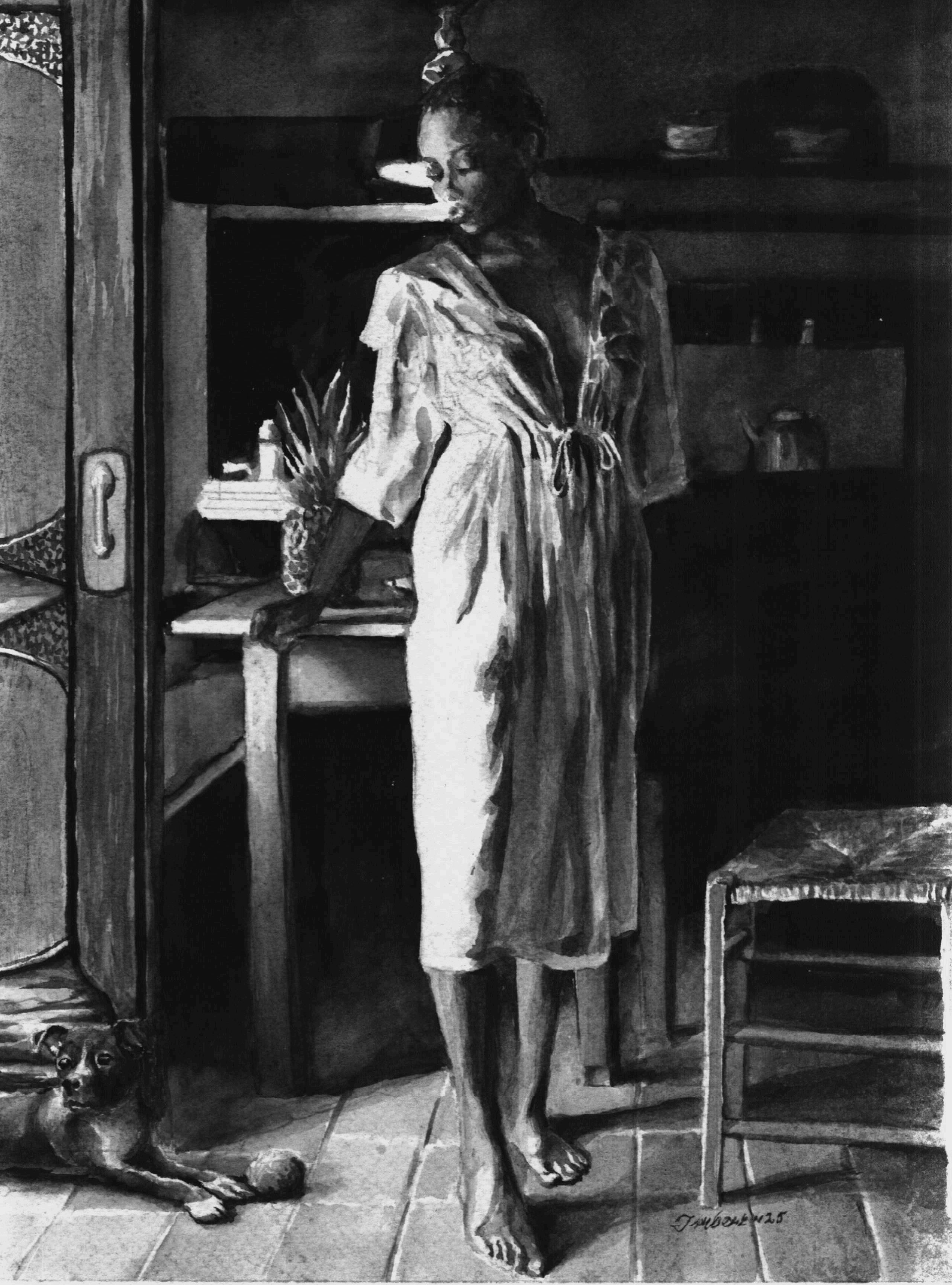Portraitexecutedinmonochromaticwatercolor