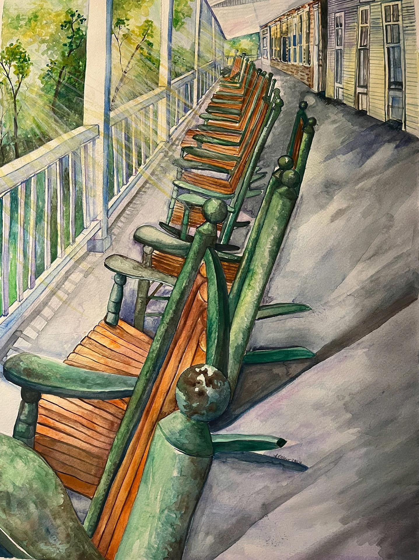 Awatercolorpaintingdepictingapeacefulporchsceneatachurchcamp Manywoodenrockingchairsrestside byside, theircurvedlinessoftenedbythedelicatetextureofwatercolor Sunlightstreamsthroughtalltrees, castingdappledpatternsacrosstheweatheredfloorboards AW127985460