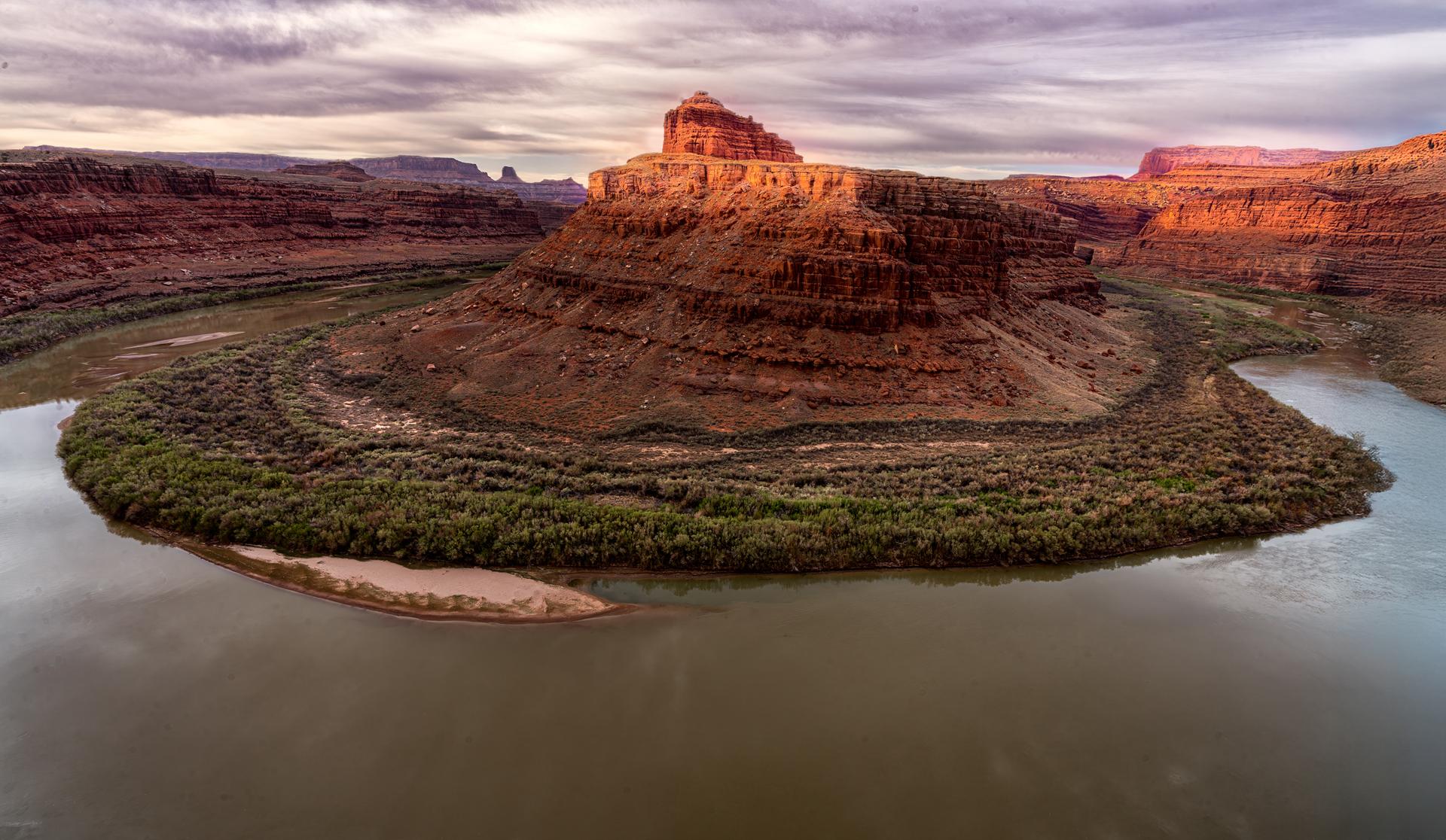 ArchivalPrint AhorseshoebendoftheGreenRiverloopsaroundamesaasthesunrisespreadsoverthemesas andcliffs