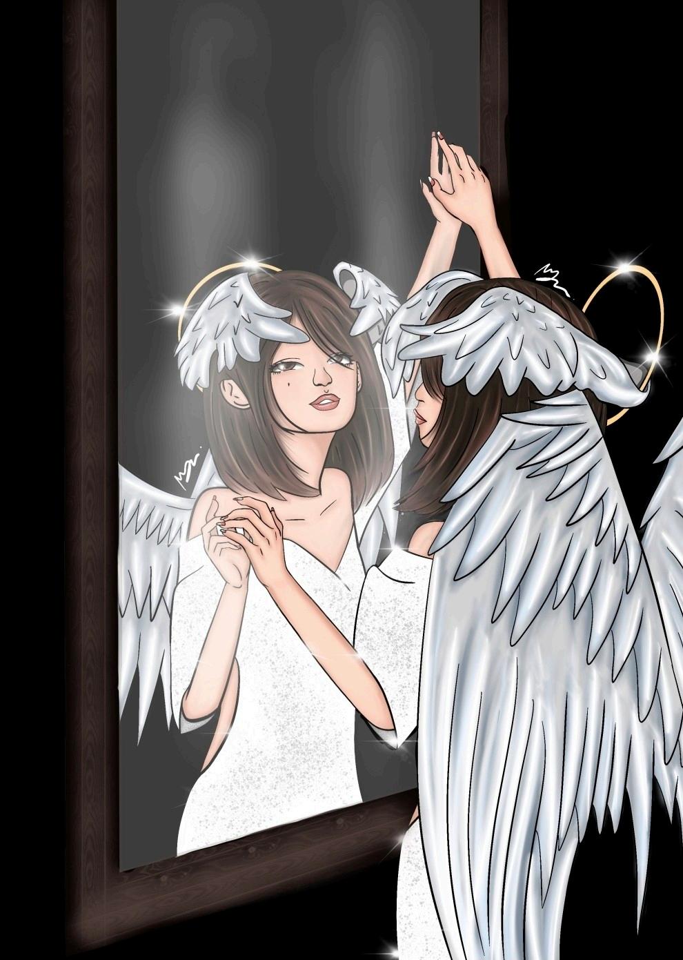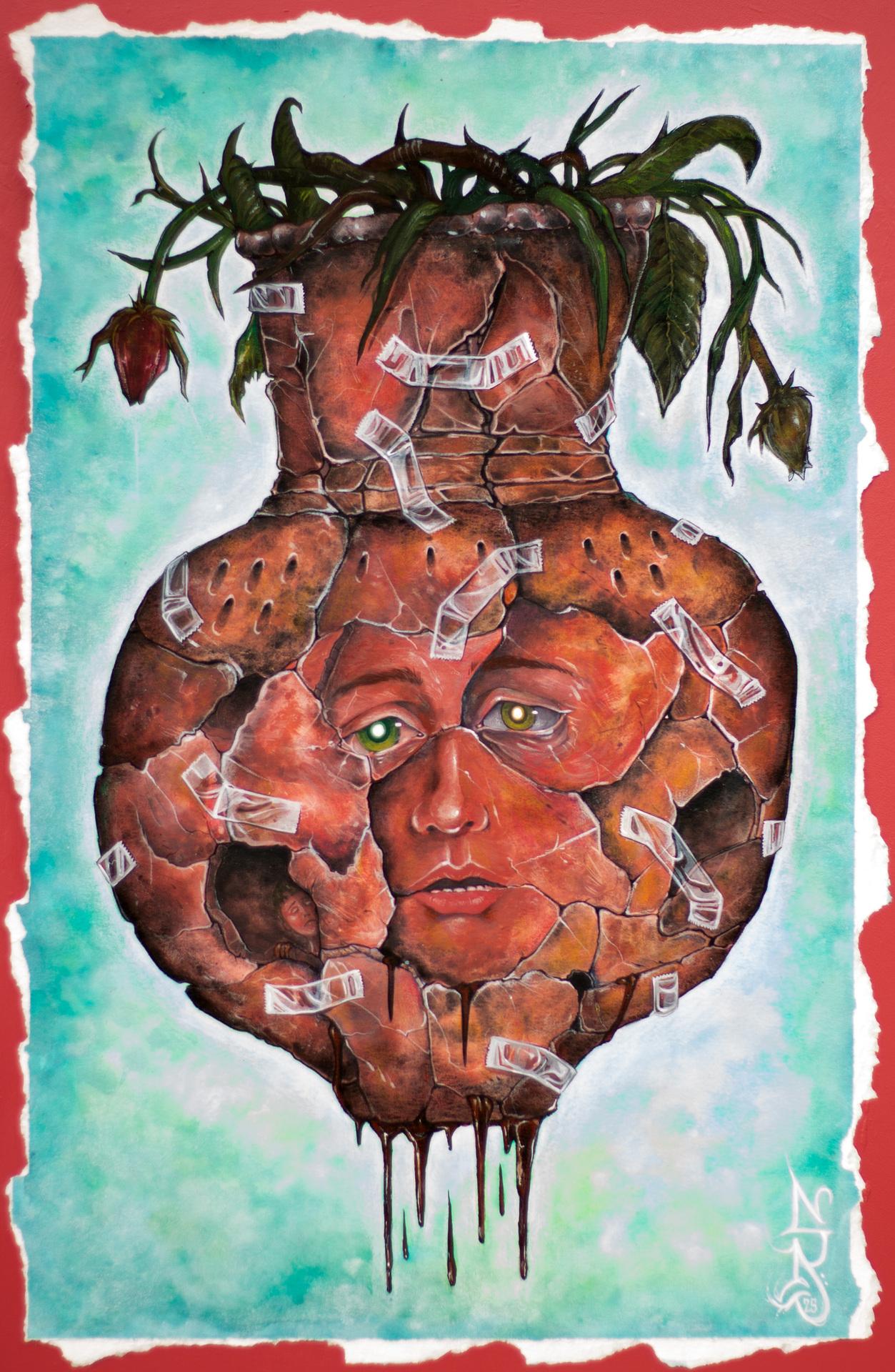Paintingofacrackedjar, heldtogetherbyscotchtape Thereisafaceonthejar, worried, sad, broken Inoneof thebrokenoutpiecesweseeasmallerfigureofascaredperson AW127532468