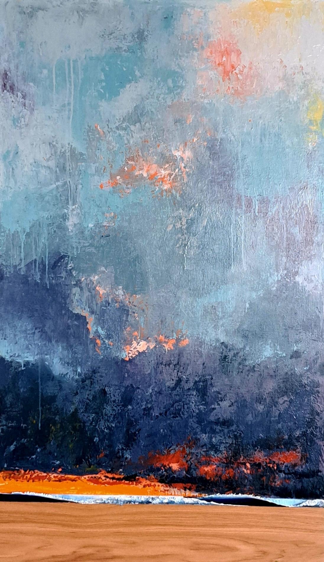 Theimageisanimpressionisticacrylicpaintingoncanvas, sized48x36inches, portrayingacoastalsceneat sunriseorsunset Theskydominatestheupperhalf, filledwithfluffycloudsinvaryinghuesofpurple, blue, and white, withavibrantblueskypeekingthrough Belowtheclouds, sunlight