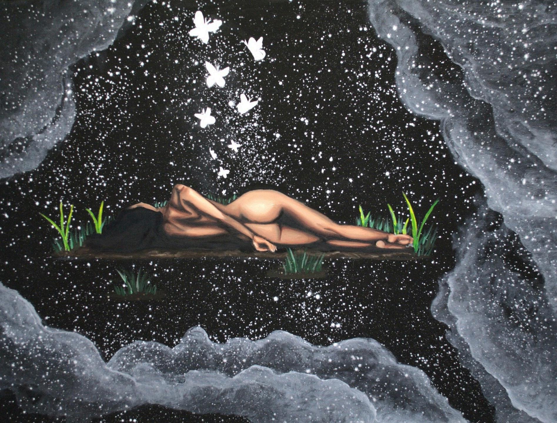Womanlaysinavulnerablestate, nude Lettingthepainshedfromher, morphingintoghostlybutterflies she healsassheletsgo, bloominggreeneryaroundthesoilshelaysin AW127632408
