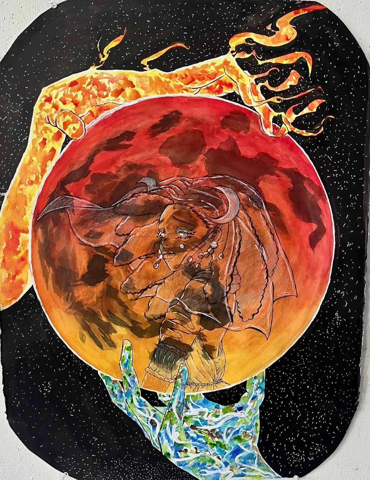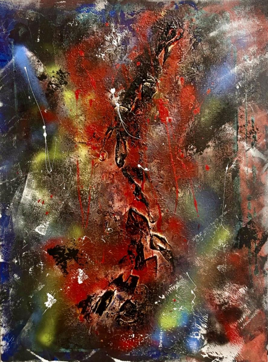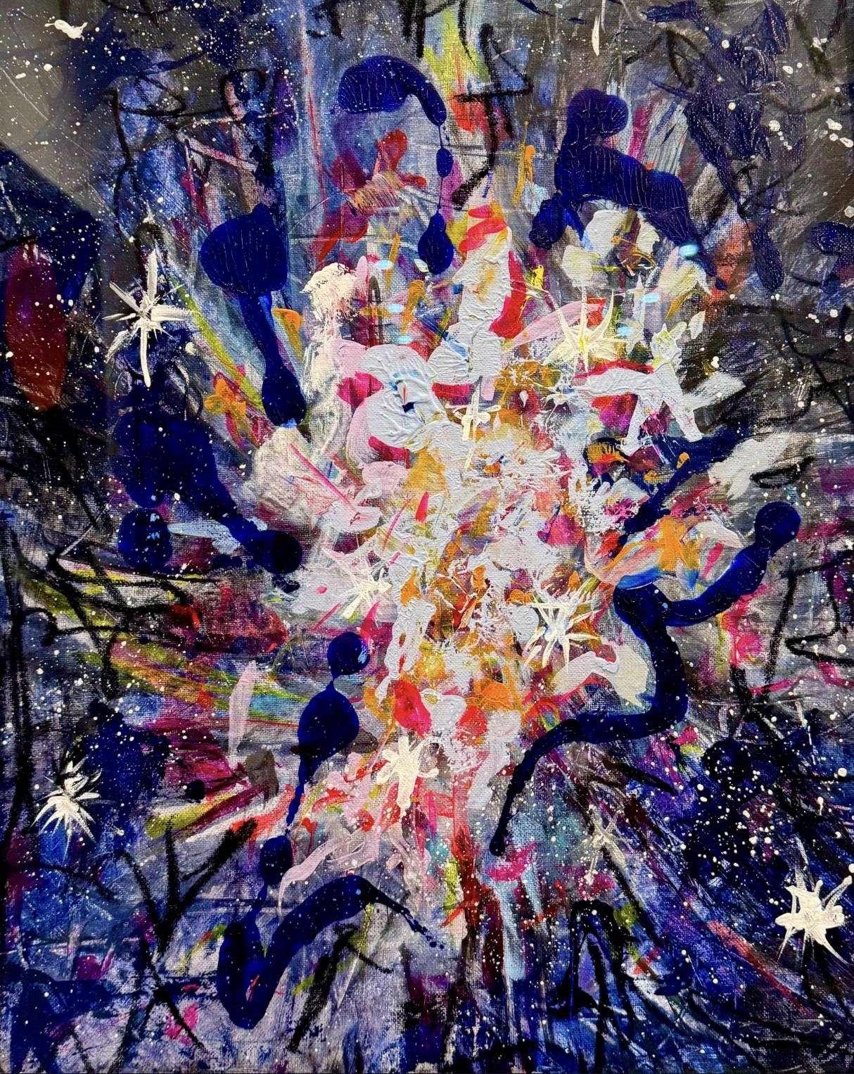 Aneruptionofcosmicmemory, thepaintingmirrorsasupernova’slastbreath filamentsunraveling, light collapsingintonewbeginnings Initschaos, creationstirs:matterbecomingmotion, darknessbendingto radianceastheuniverselearnsitselfagain