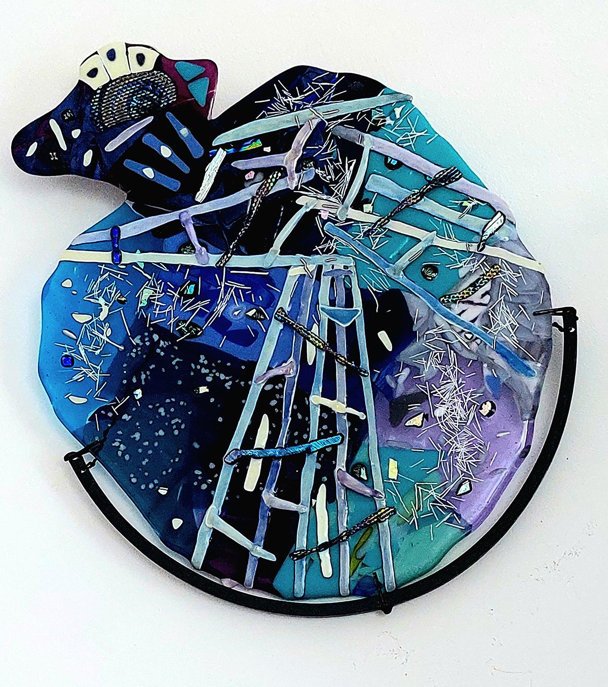 Thissculpturalglasscompositionevokestheshiftingrhythmsandlayeredtransparenciesofthesea Shadesof turquoise, indigo, andvioletintertwinelikewavesinmotion, creatingavividinterplayoflightanddepth Intricatelinearelementsandcrystallineinclusionstraversethesurface, suggestingreflections, currents, andthe delicategeometryofmarinestructures