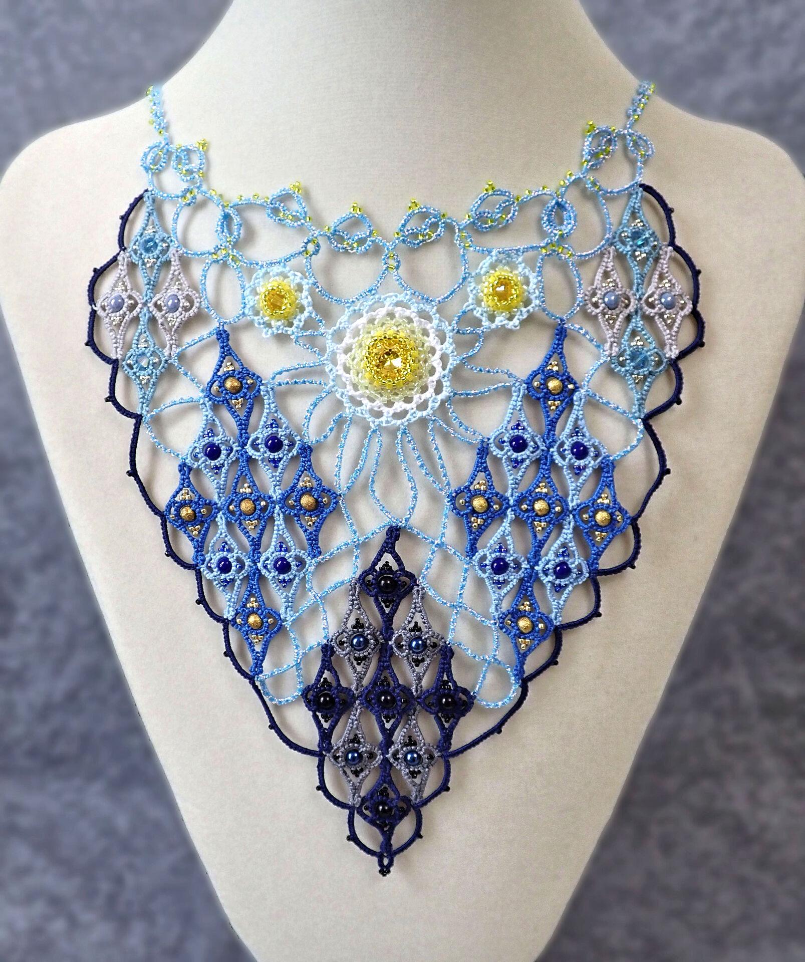 Handmadelaceincottonandmetallicthreadsandbeads Originaldesignusingtattinglacetechniques, including tattingaroundbeads, nodestitch, andbeadpicots Peyotebeadingtechniquewasusedtoadd2crystalbeads and1crystalcabochon