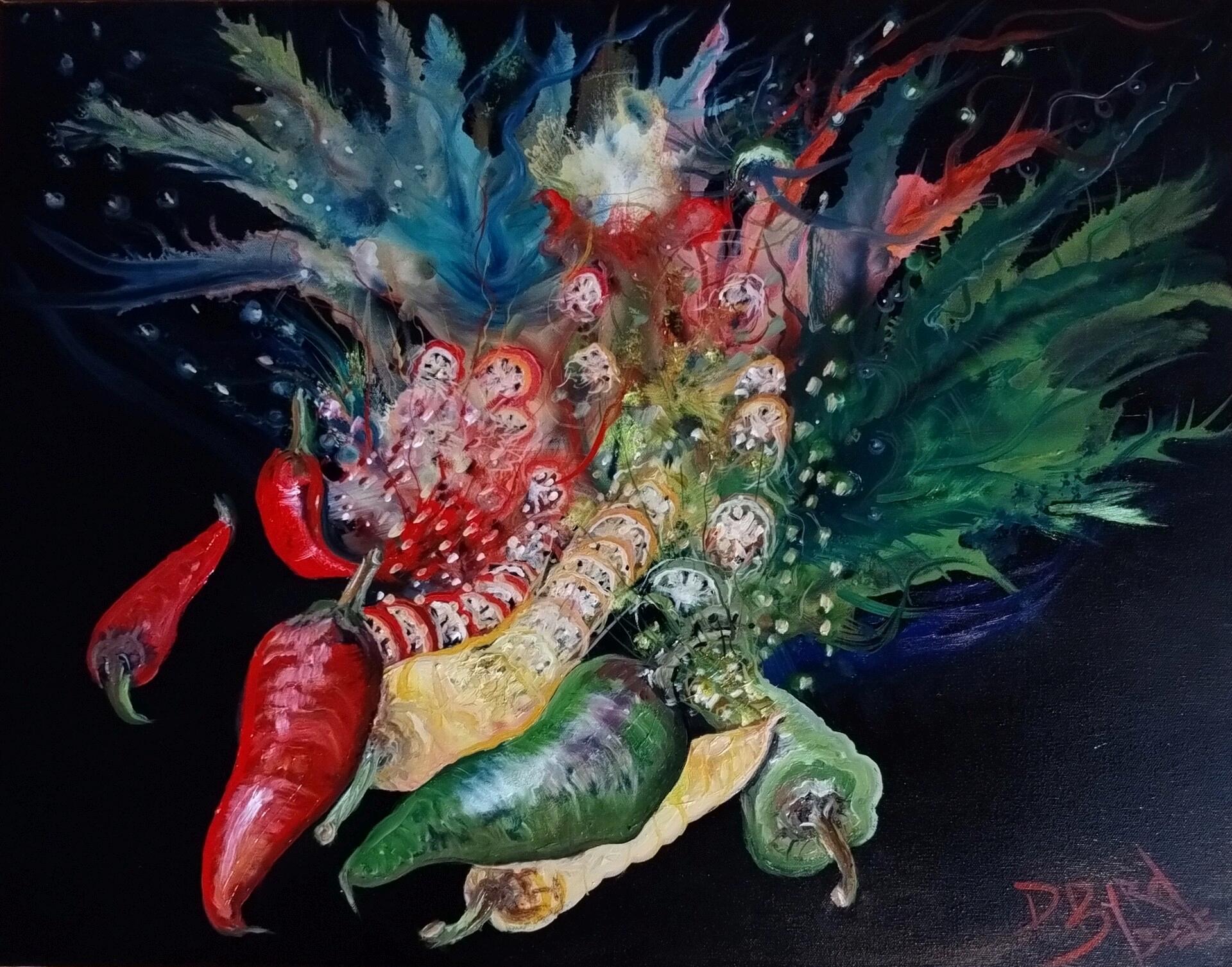 SplashofChiliPeppersgoingintothevortex, tastebudsdanceablaze! Thispaintingrecentlytooknumerousaccoladesfromvariousartcontestsandgalleryexhibitions, thisabstractis upforsale750usexcellentforrestaurantsorhomekitchen!ThepaintingtitledSplashofChilis!isanabstract piecebyartistByrdman, createdin2025inMissouri, USA.Theartworkdepictsagardenofearthlydelights, spicy!.
