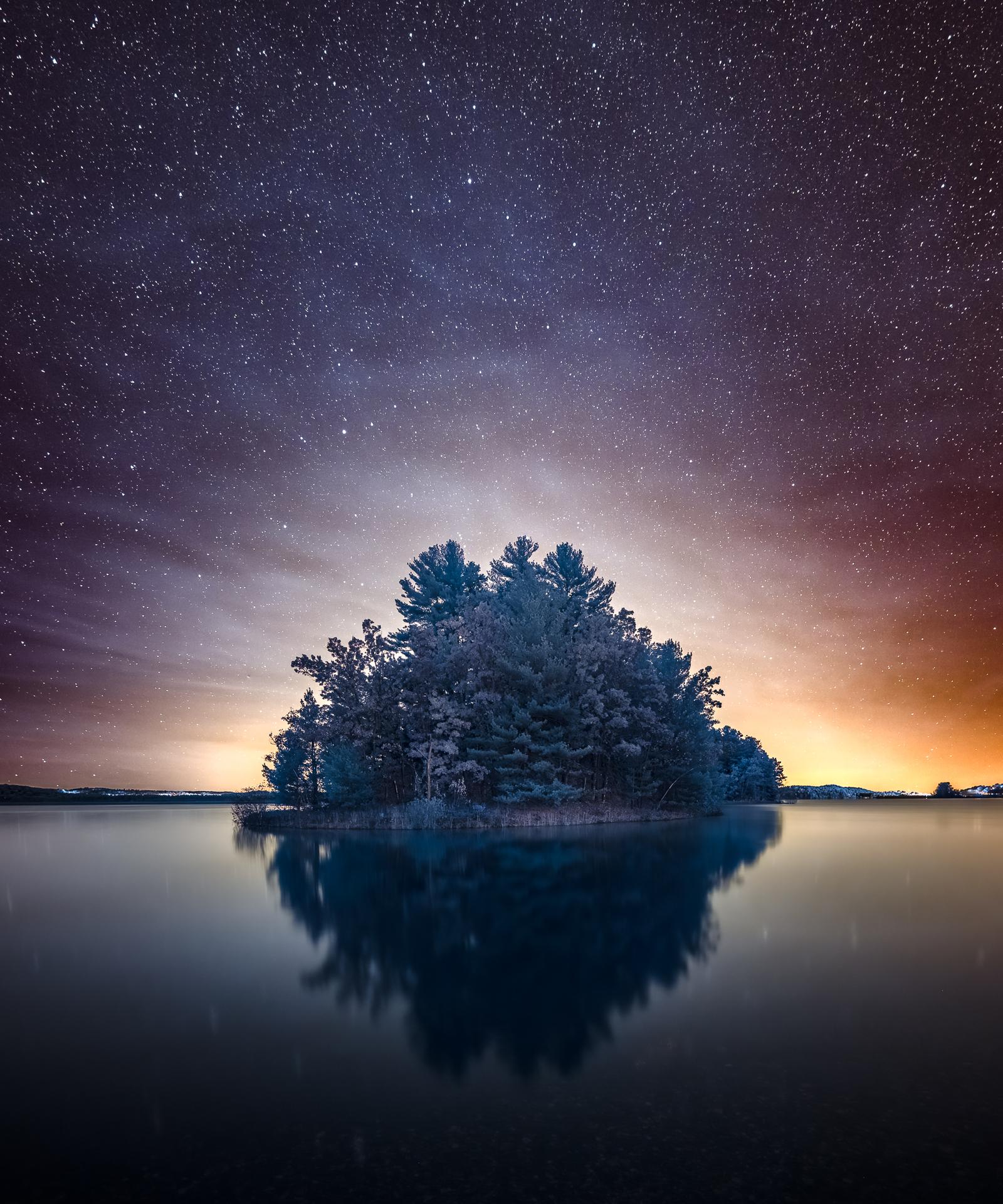 Archivalinkjetorinfusedmetal AlakeislandsurroundedbyInfralucentClouds, thosecloudsthatcanonlybe seenininfrared Itglowsfromthenearbytown'slightpollutionatnight