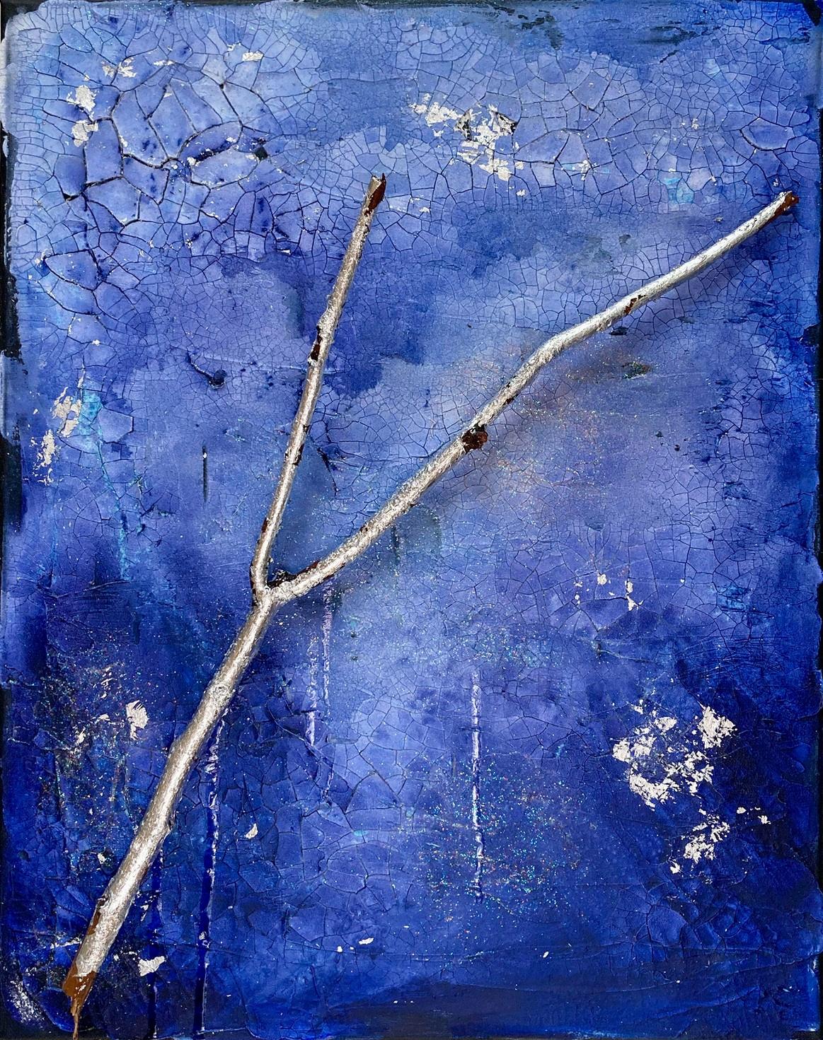 Acrylic, gelpaste, woodbranch, silverfoil Thediviningrodfeaturedonthispieceliterallycanfromoutofthe blue ItfellfromatreeasIwaswalkingmydogandmakingthetoughdecisionabouthishealth(15yearsold withcancer) Ipickedupthebranch, tookithomeandwithin24hours, myhounddiedpeacefullyinhissleep