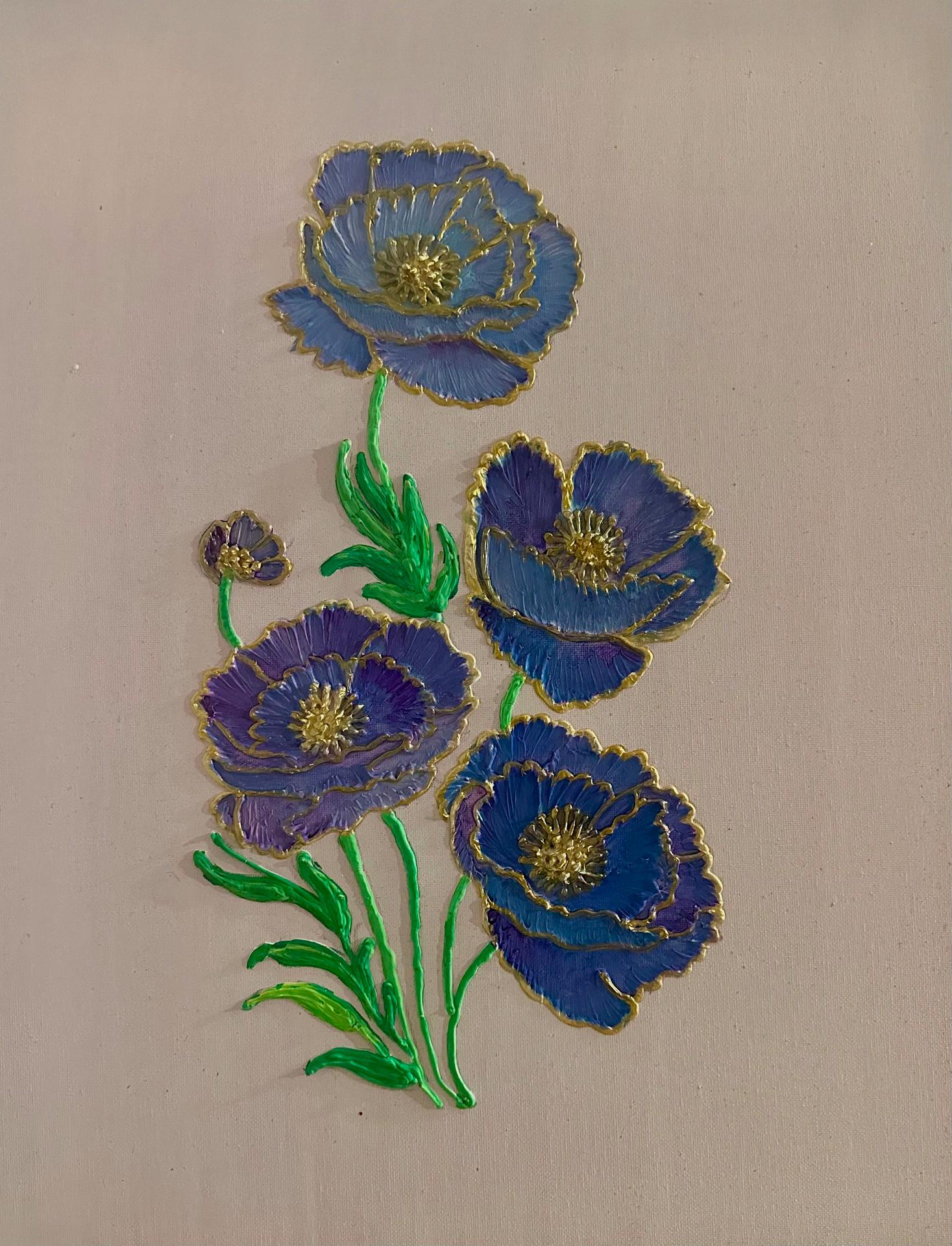 GoldenPetalcapturesthedelicategraceofbloomingflowersrenderedindeepshadesofvioletandblue, highlightedbyglimmeringgoldcontoursthattraceeachpetalwithluminousprecision Themetallicoutlineslend aregalrhythmtothecompositionofflowers