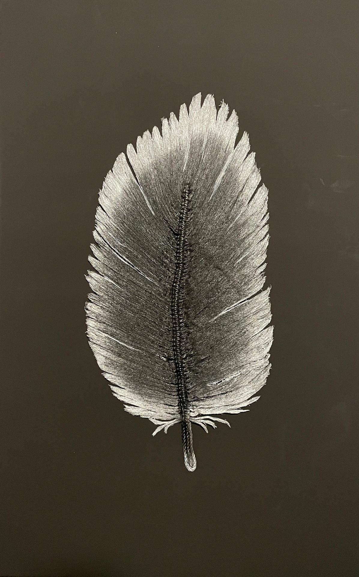 Mixedmediaoncanvaswithmetallicsilverthread Featherisacontemporarymixed-mediaartworkfeaturinga hand-craftedsilverfeatheronadeepblackcanvas Usingmetallicthreadsandlayeredtextures, itsymbolizes nature’sresilience, fragility, andconnectionbetweenartandenvironmentalawareness