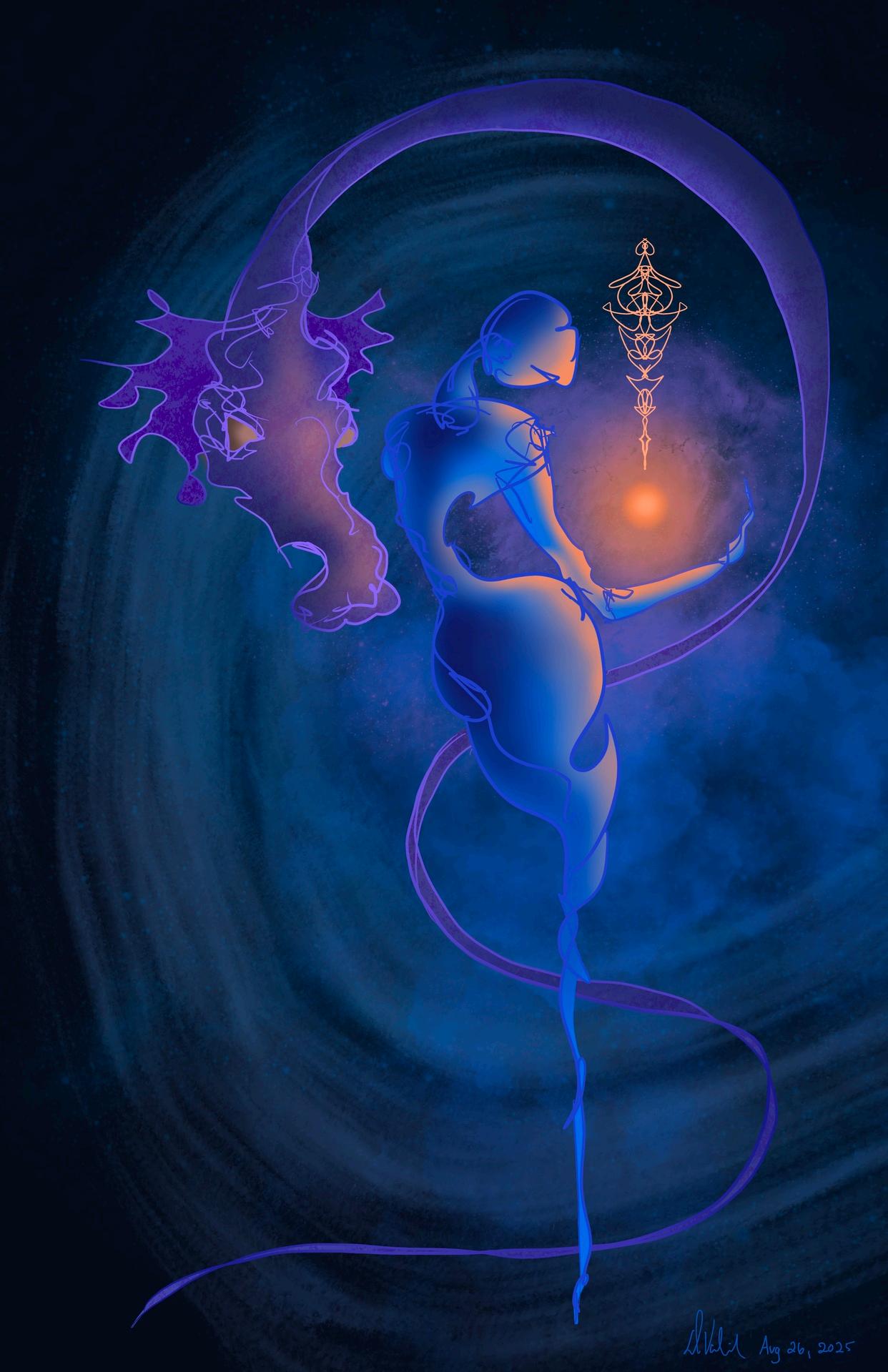Handdrawnintuitivedigitalart GiftfromtheCosmosrevealsthequietlabourofinnertransformation Acosmic guideofferslighttoafiguremid-becoming, showinghowspiritualgrowth, healing, andself-creationdemand patience, surrender, andthecouragetoreceivewhatreshapesus