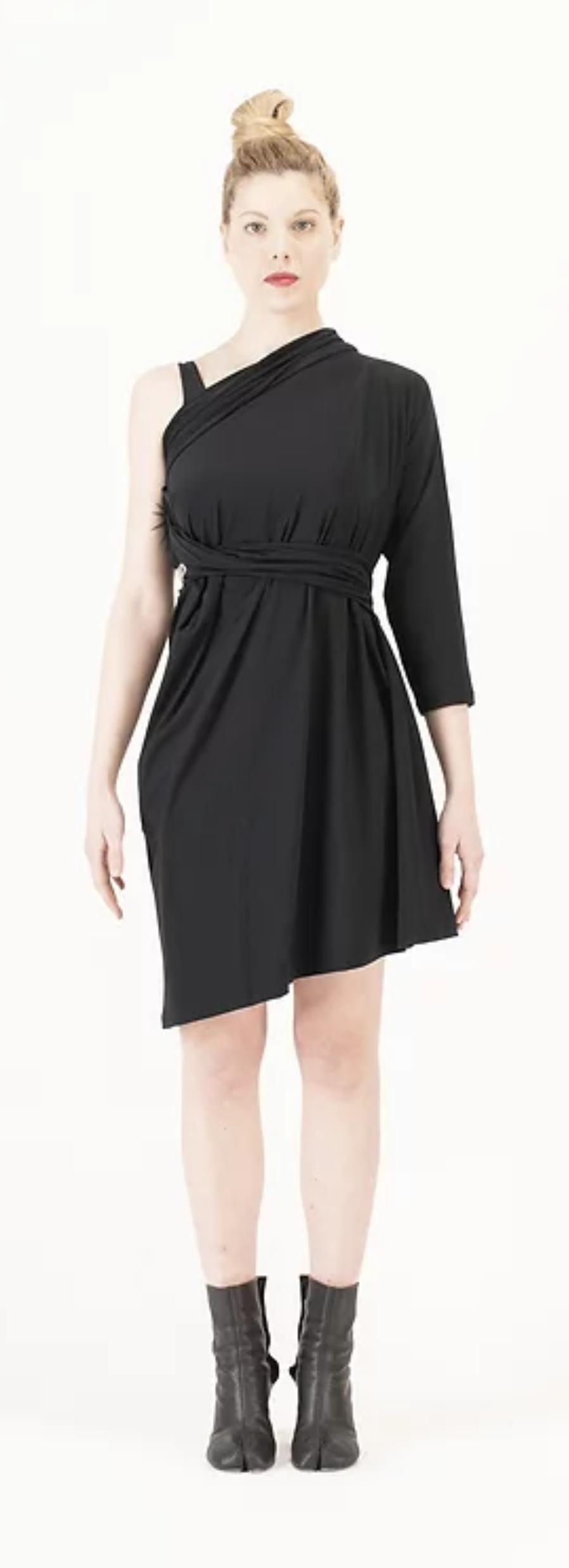 Ununicopezzodistoffaèpiegatoinun quadrato.Quandosiafferralaparte superioredelquadratopiegatoelositira versol'alto,siscopreunaforma tridimensionale.Laforma,inquestocaso uncapodiabbigliamento,èprodotta dallepiegheedeterminatadatuttigli angoliacutietriangolichecompongono lastruttura.