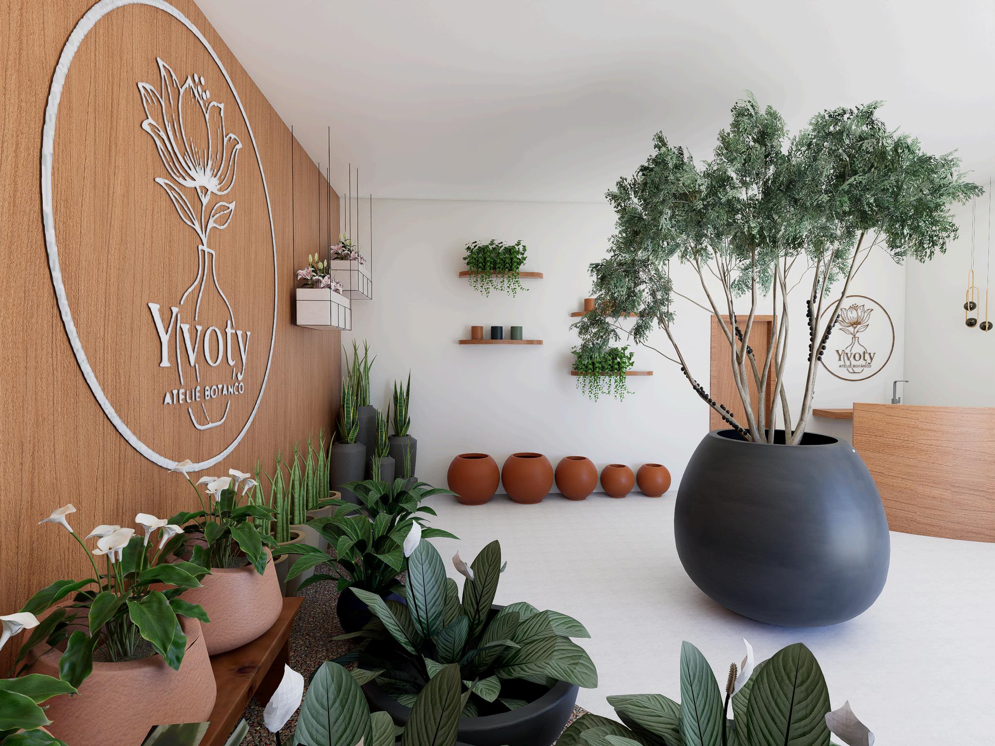 A Floricultura Yvoty é fictícia e comercializa plantas ornamentais e vasos decorativos. O design de interiores do comércio tem como foco utilizar as plantas e vasos como complementos um do outro, valorizando tanto a beleza natural das plantas quanto a sofisticação dos vasos.