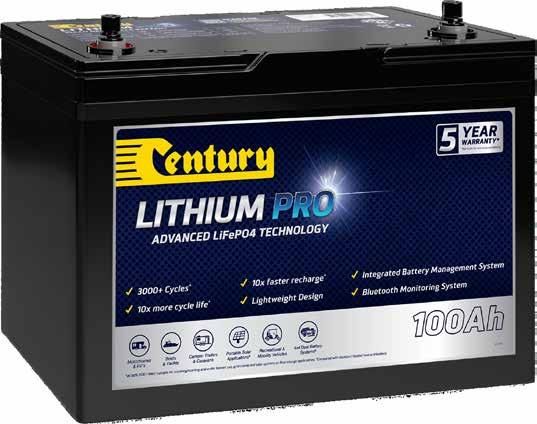 Century Batteries is proud to introduce its nextgeneration lithium battery. Featuring a refreshed design and enhanced functionality, this second-generation represents the latest advancements in lithium battery technology and performance. Purpose-built for longevity, Century’s Lithium Pro batteries deliver over 3000 cycles, fast charging capability, low self-discharge, and dependable, consistent performance, in a broad range of demanding applications. Backed by a 5-year warranty, Century Lithium Pro batteries offer peace of mind and long-term confidence in your power solution.