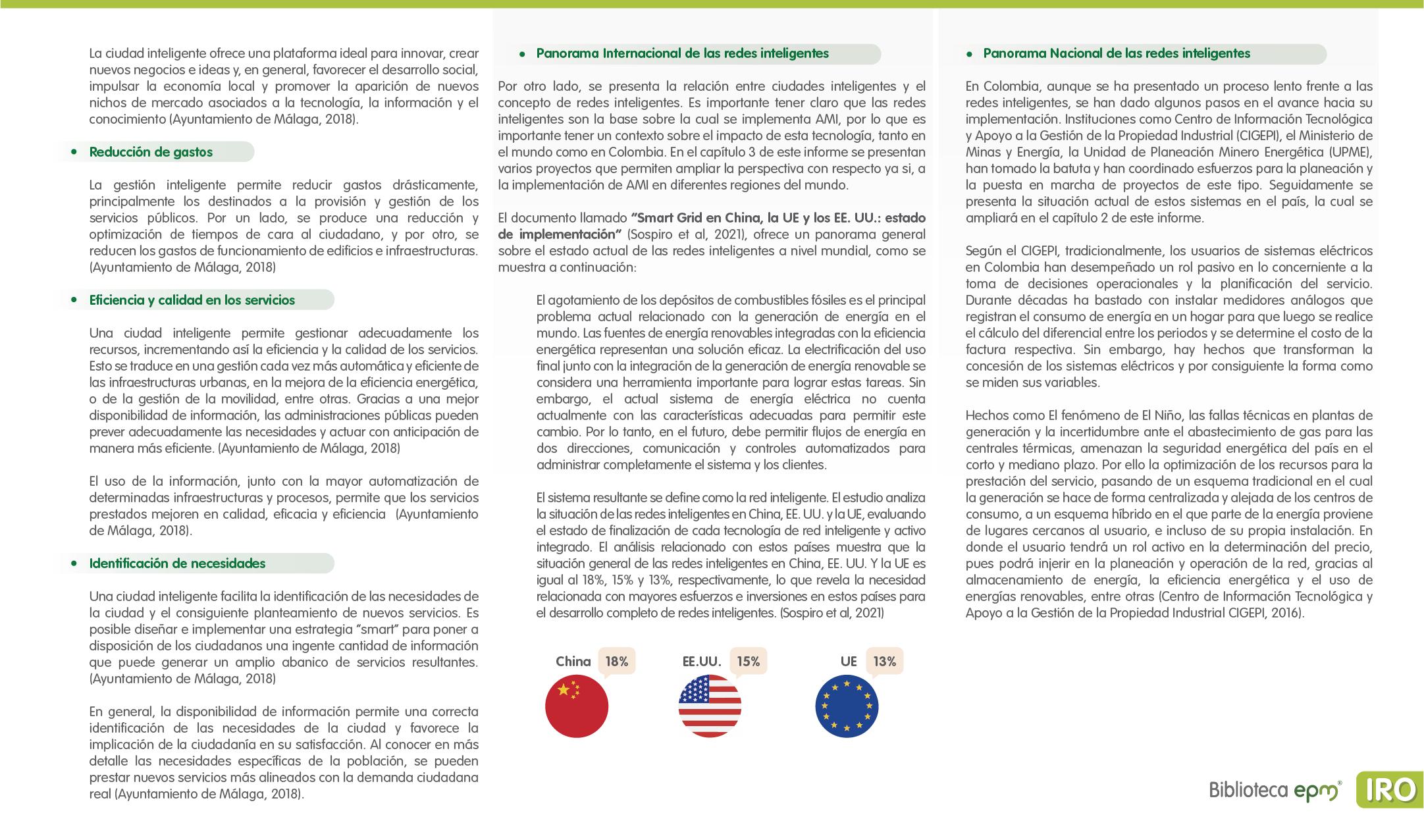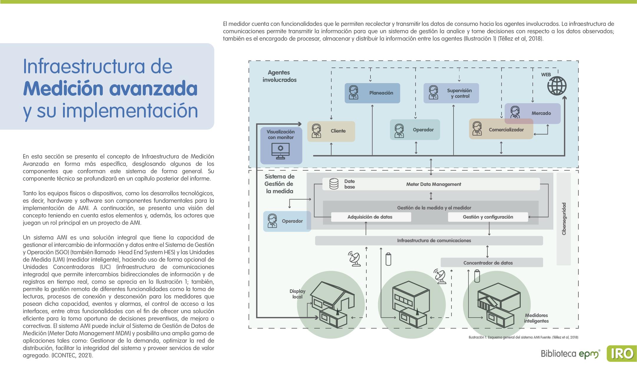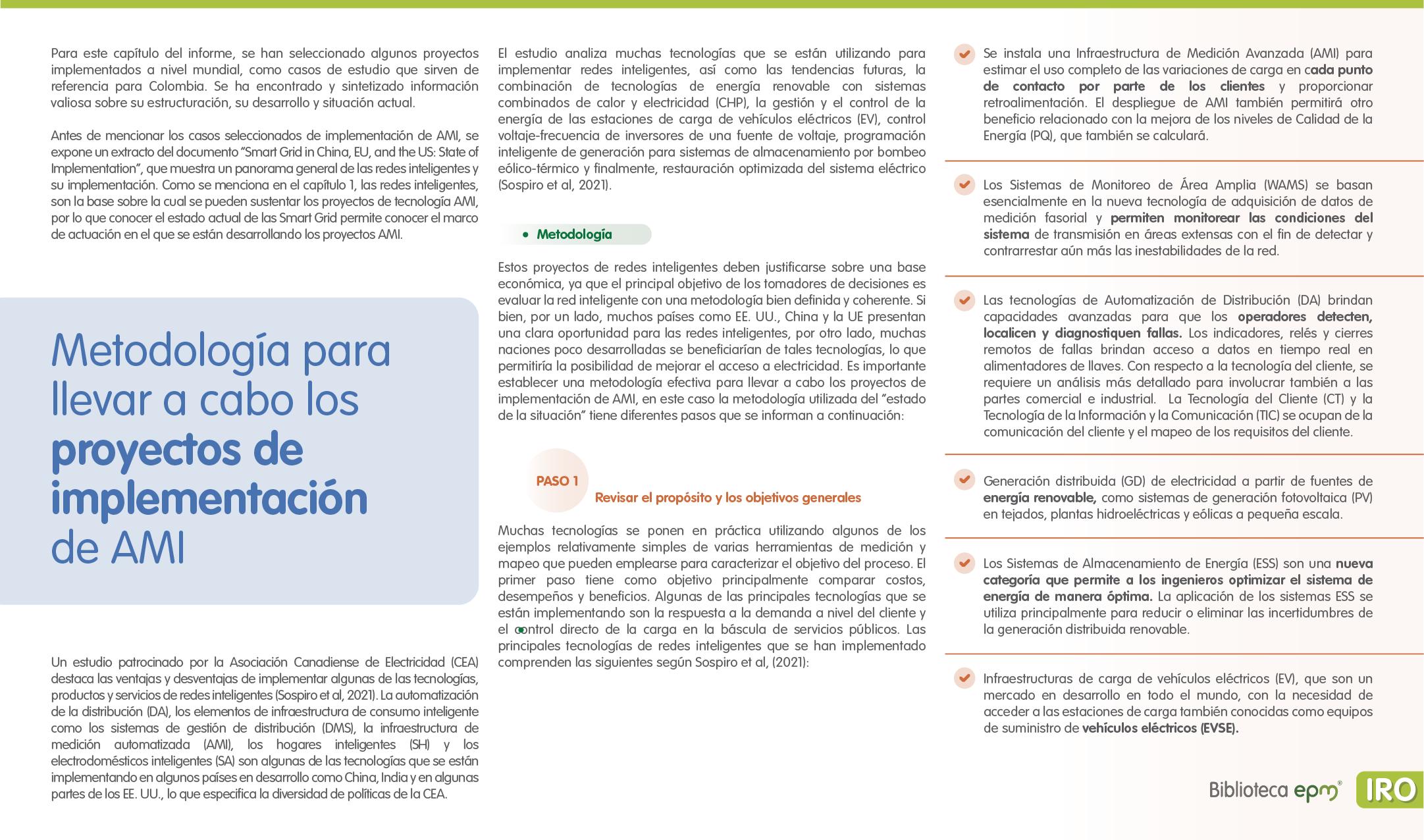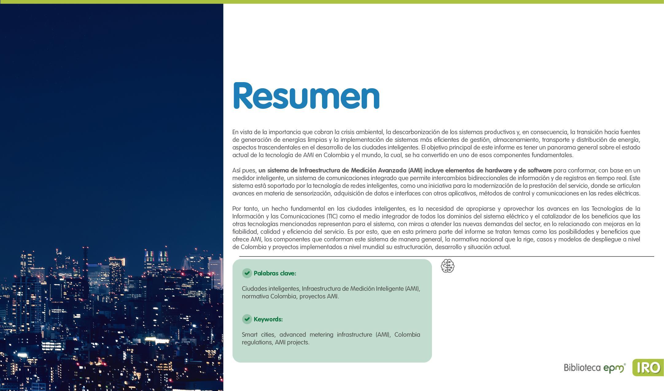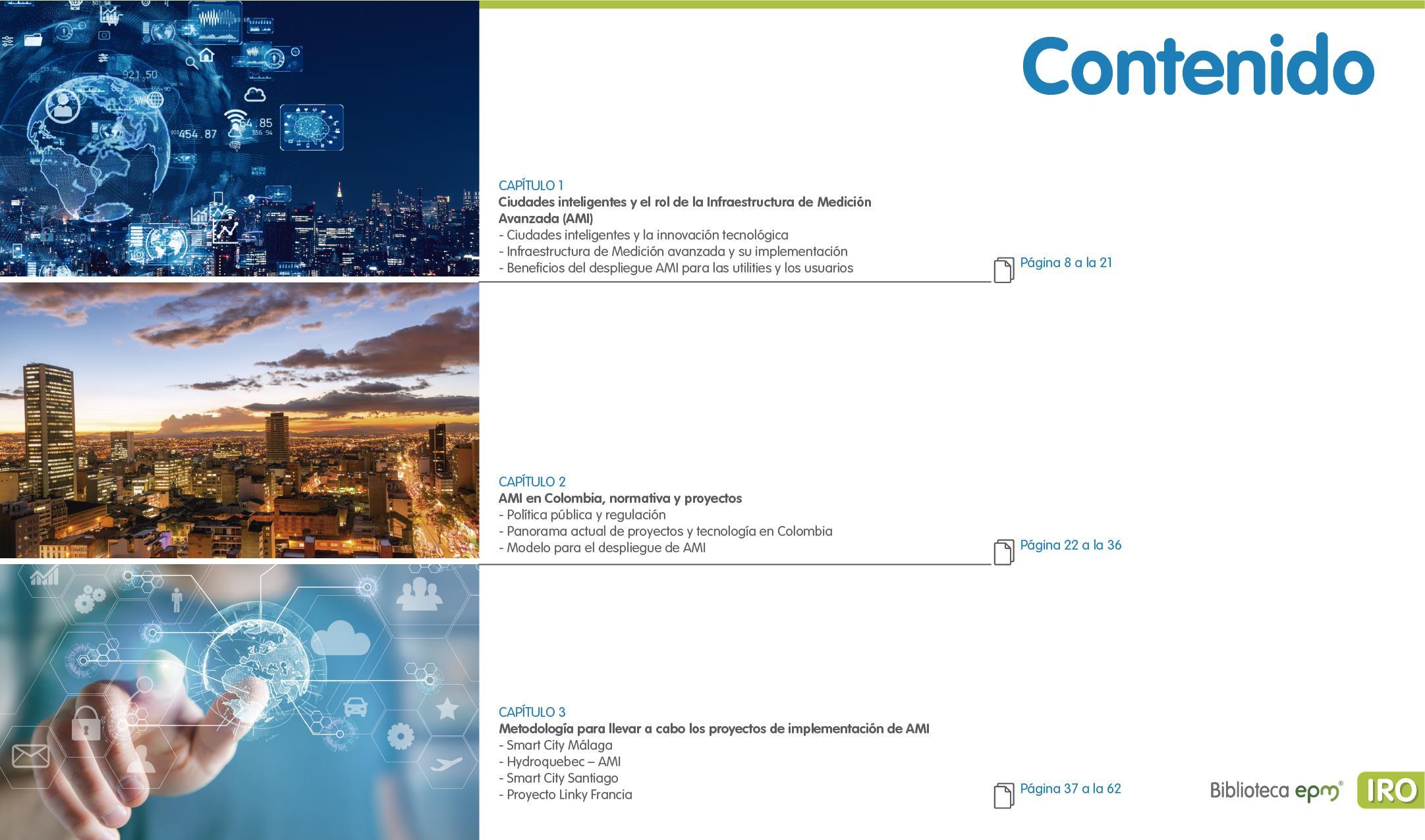 El informe está compuesto por 6 capítulos: Ciudades inteligentes y el rol de la Infraestructura de Medición Avanzada (AMI); AMI en Colombia, normatividad y proyectos; Cómo se implementa AMI en el mundo. Casos de estudio; Mercado de AMI; Ciberseguridad y otros aspectos técnicos de AMI; Implicaciones, riesgos y oportunidades para las ciudades inteligentes enfocados en AMI. Dentro de cada capítulo se tienen inicialmente algunas ideas clave, extraídas de los papers, artículos y reportes citados, para luego presentar en detalle sus resultados, conclusiones de las investigaciones y puntos de vista de sus autores.