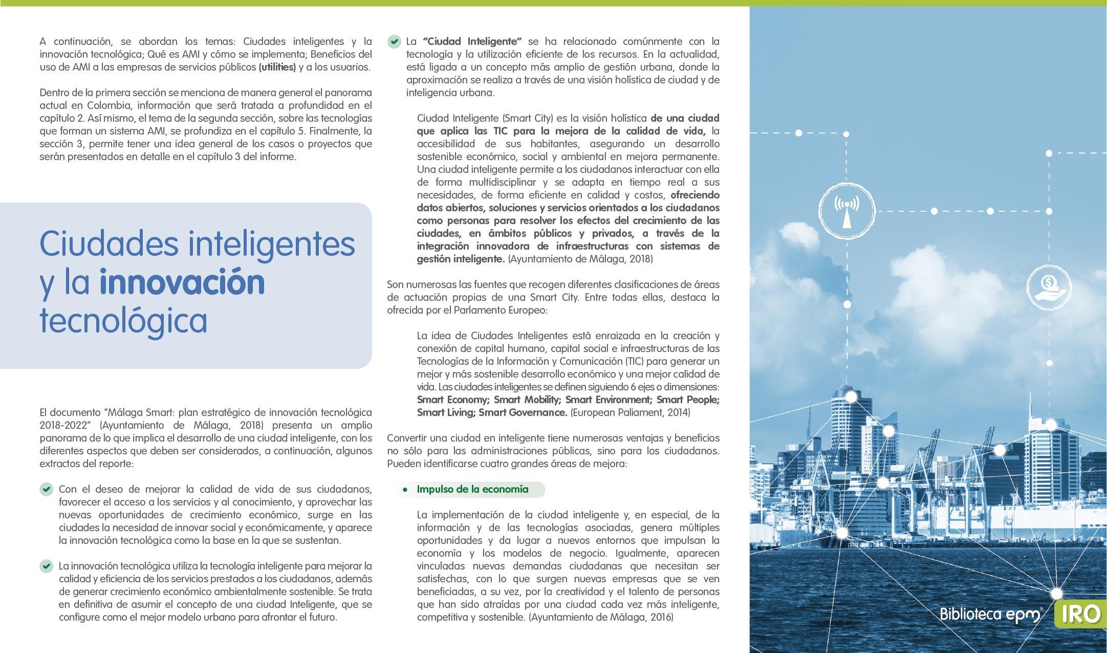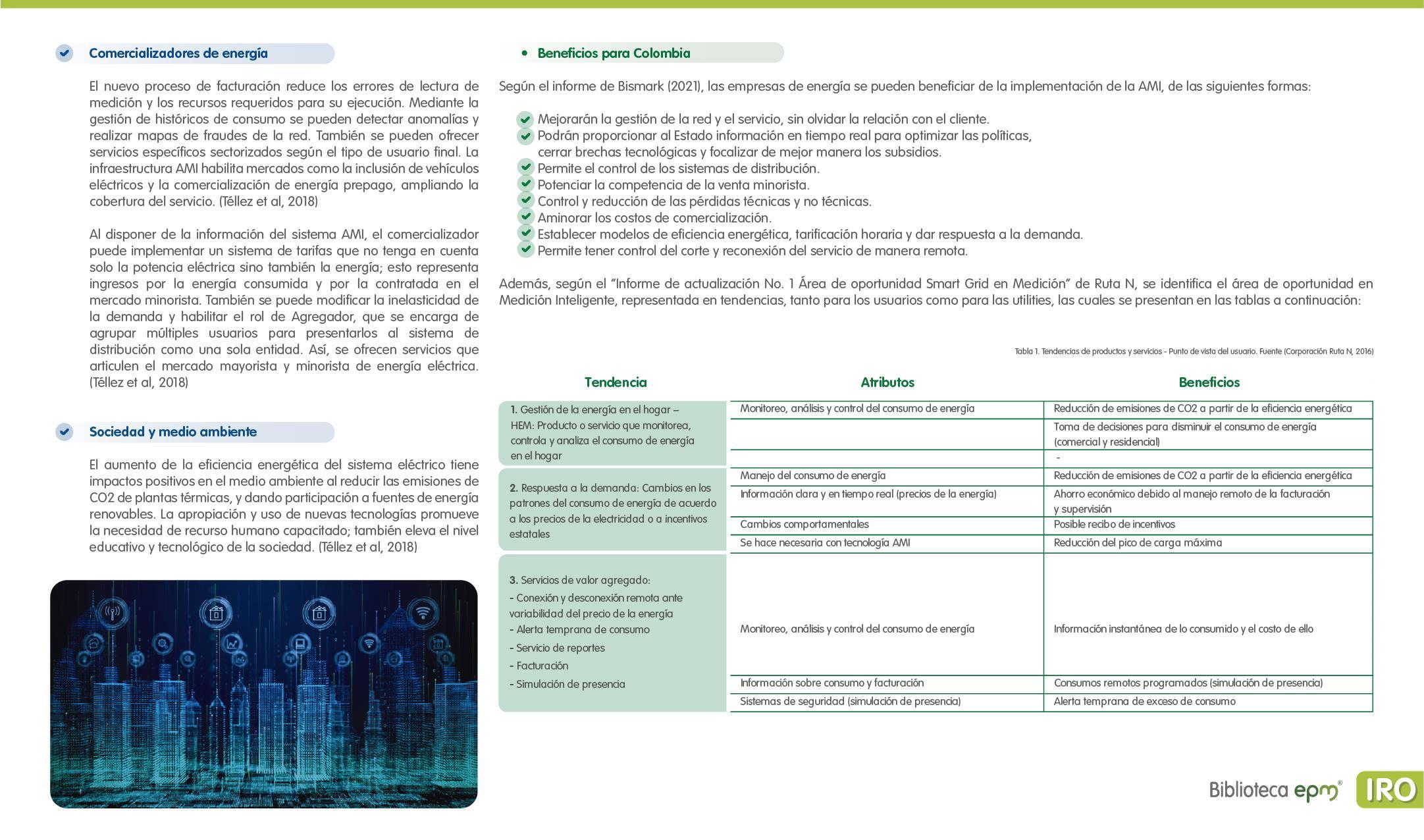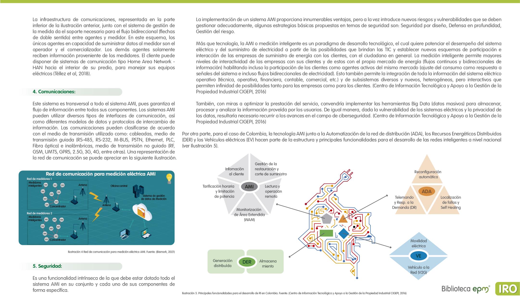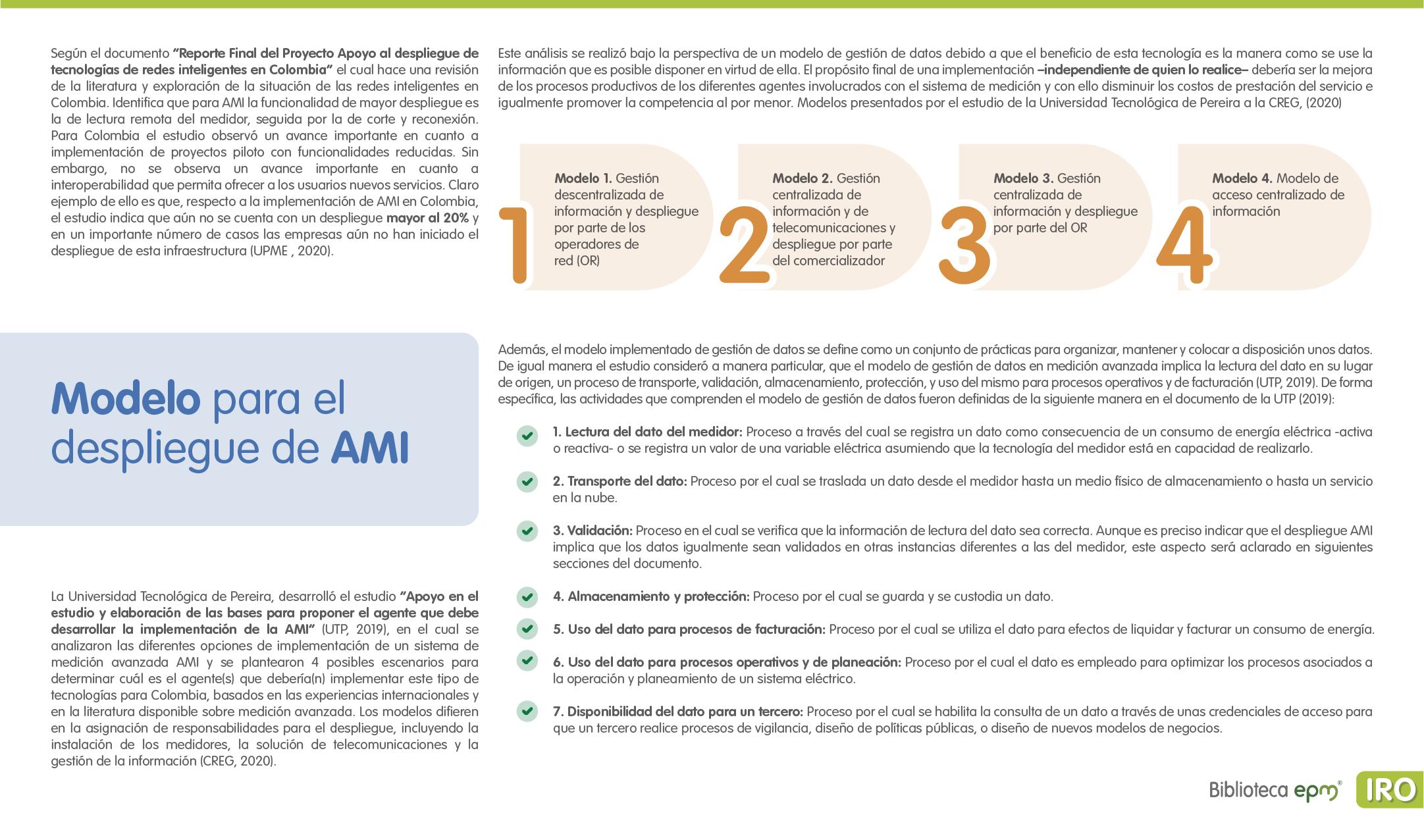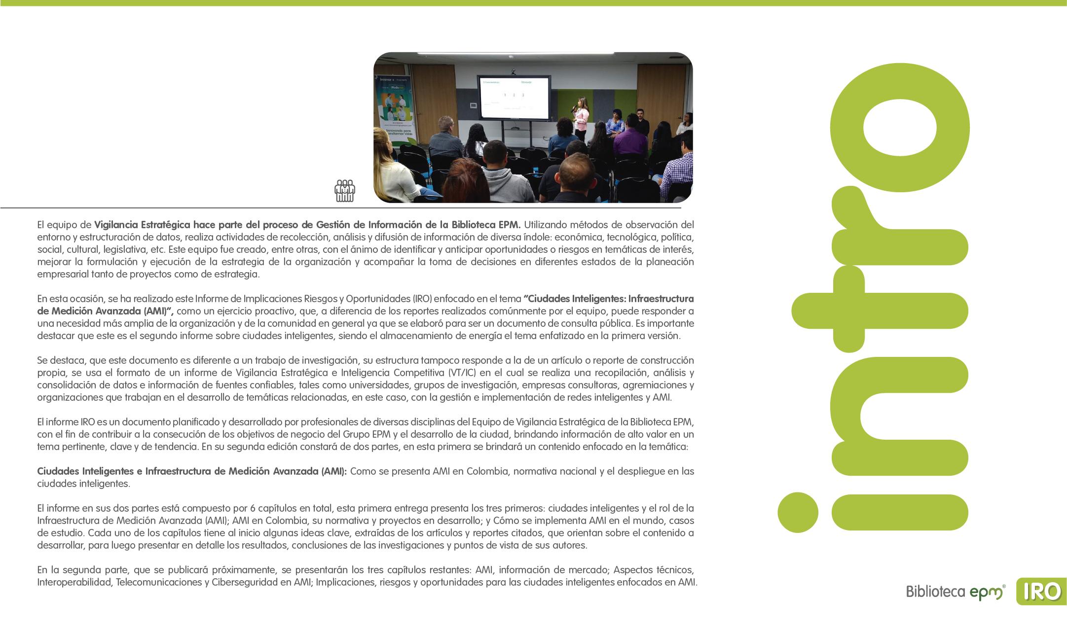 El informe está compuesto por 6 capítulos: Ciudades inteligentes y el rol de la Infraestructura de Medición Avanzada (AMI); AMI en Colombia, normatividad y proyectos; Cómo se implementa AMI en el mundo. Casos de estudio; Mercado de AMI; Ciberseguridad y otros aspectos técnicos de AMI; Implicaciones, riesgos y oportunidades para las ciudades inteligentes enfocados en AMI. Dentro de cada capítulo se tienen inicialmente algunas ideas clave, extraídas de los papers, artículos y reportes citados, para luego presentar en detalle sus resultados, conclusiones de las investigaciones y puntos de vista de sus autores.